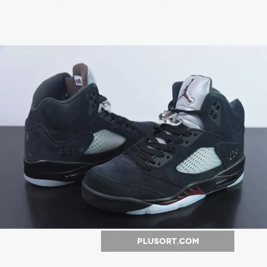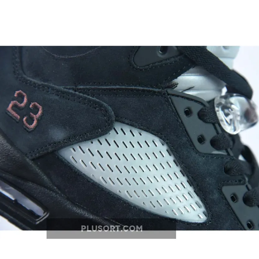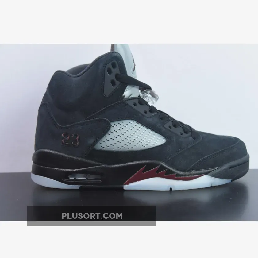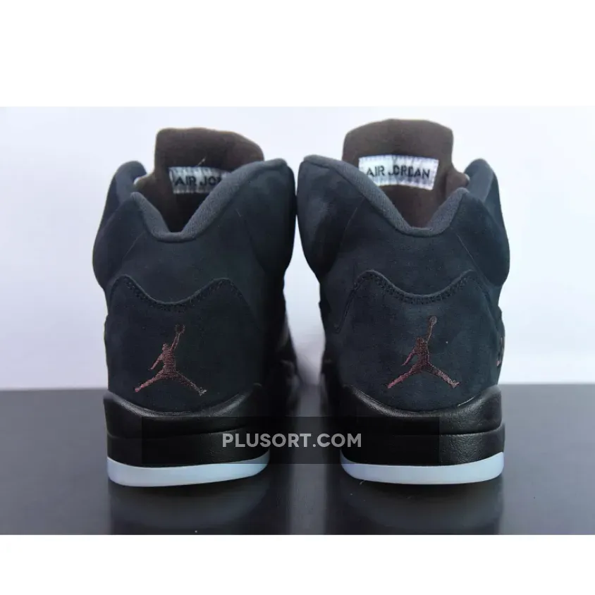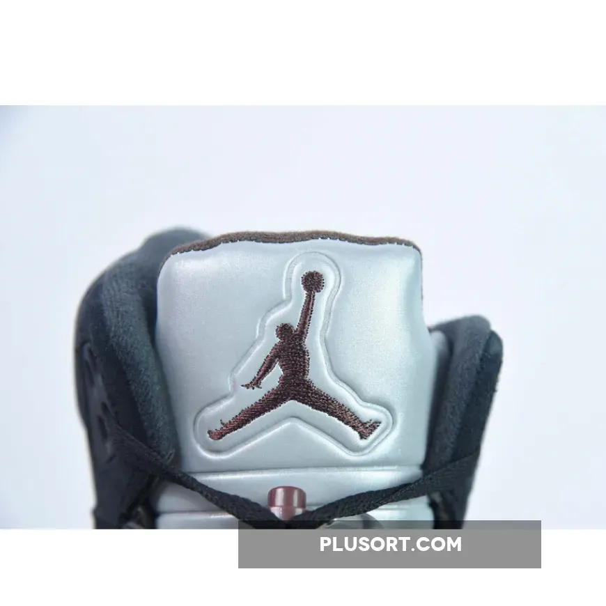 The pair reveal a suede tooling for the majority of the upper, accented with the brand’s signature burgundy. The A Ma Maniére x Air Jordan 5 Black comes with Jumpman branding on the right tongue and A Ma Maniére on the left tongue.