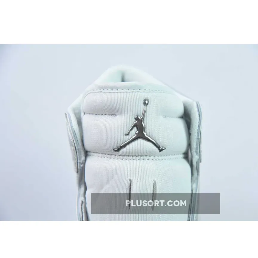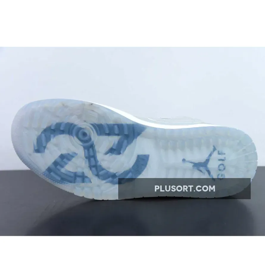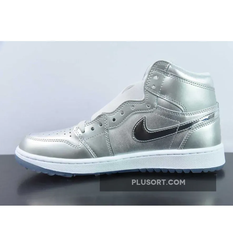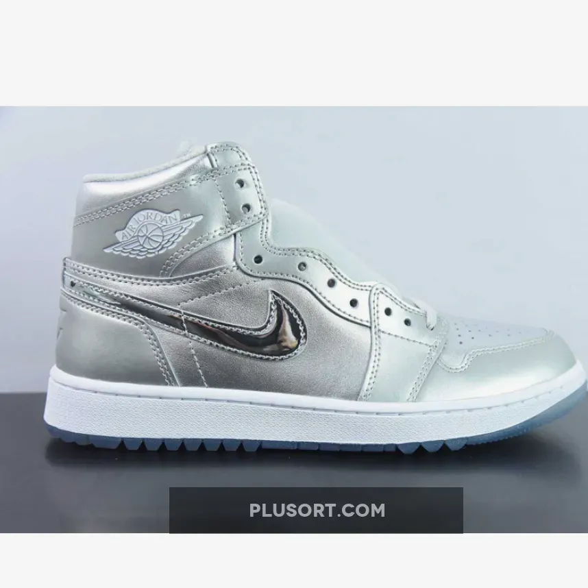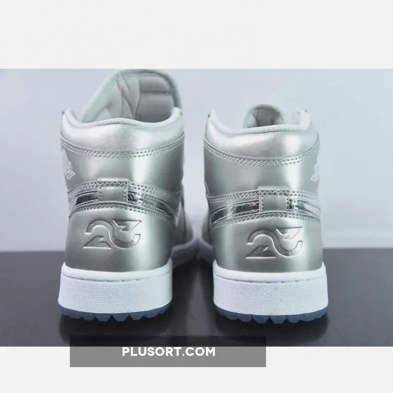 The golf-specific Air Jordan 1 features a full Metallic Silver leather upper, enhanced with toe box perforations for breathability. Complemented by White mesh tongues and inner lining, the design includes Chrome Jumpman tongue logos and Swooshes on the sides, exuding a touch of luxury. Adding to the style, Photon Dust laces and White Wings on the lateral ankle catch the eye. The decorative insoles and underfoot sport Jumpman Golf branding and a bespoke “23” logo. Icy blue finishes, then, round out the shoe’s cleated bottom.