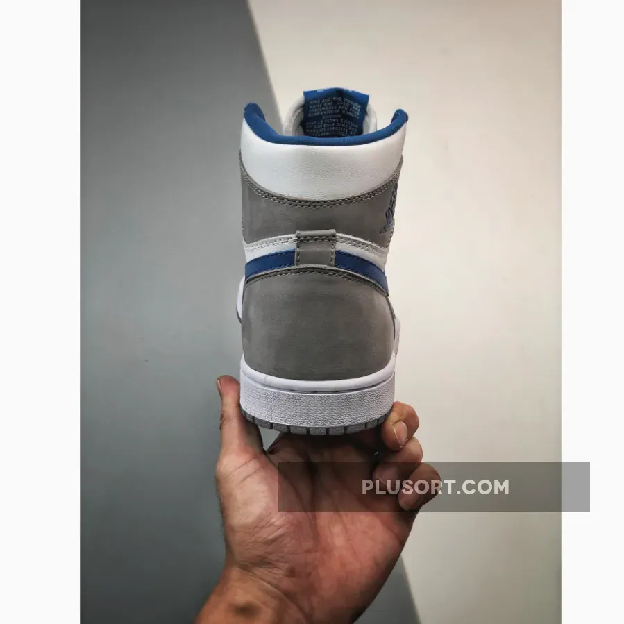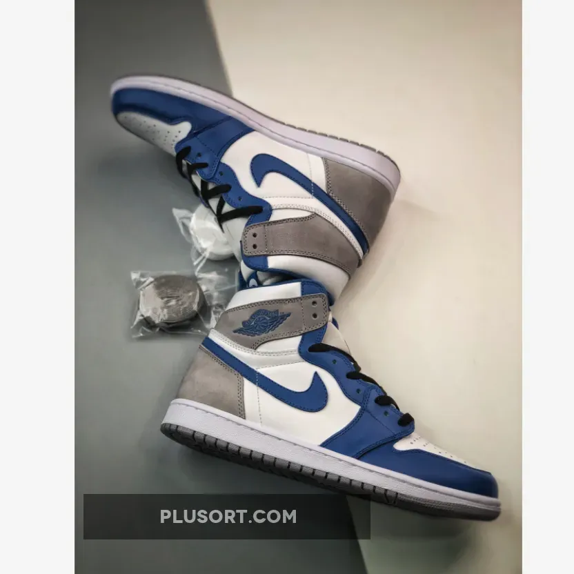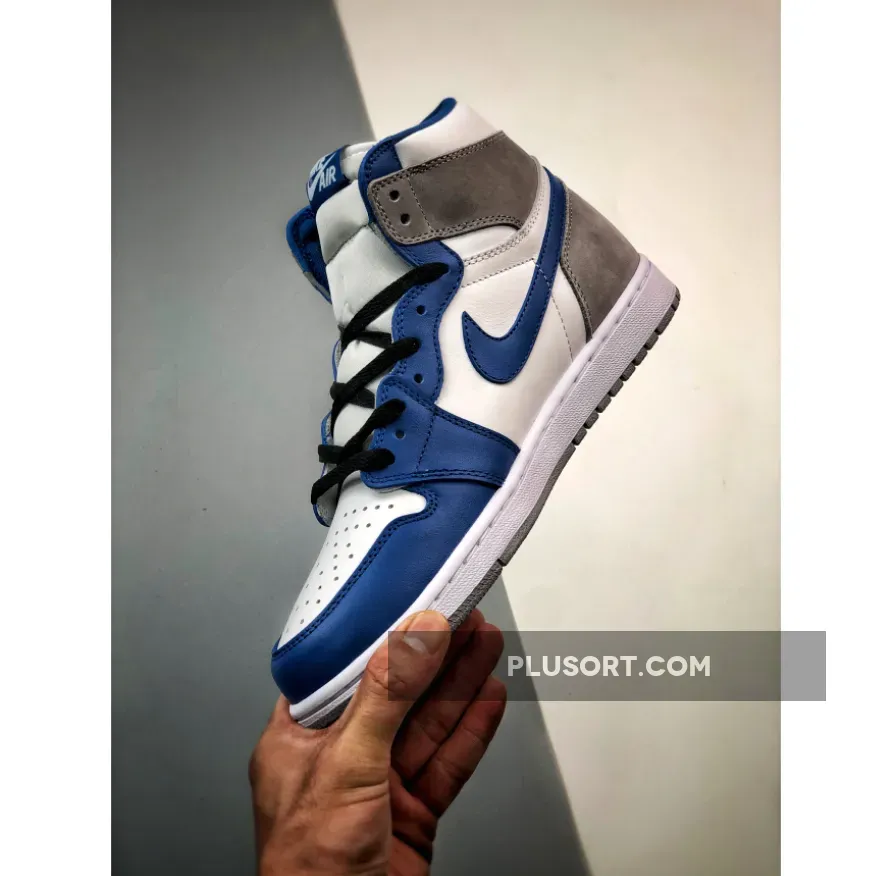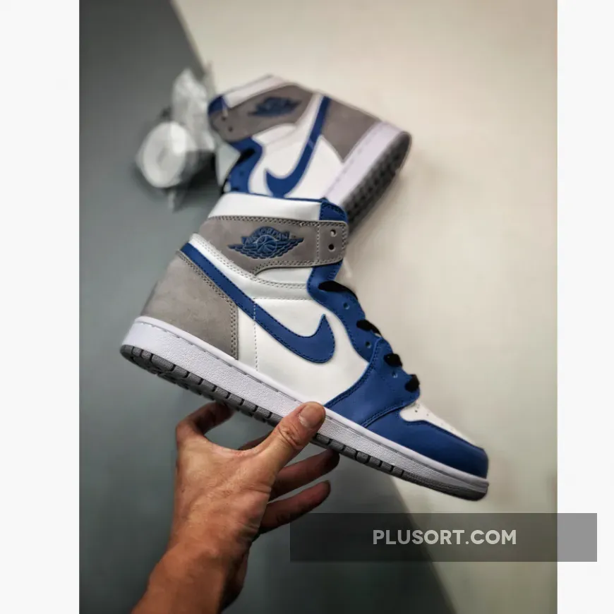 This new offering of the Air Jordan 1 gets constructed out of a smooth leather all over the upper in a combination of White, True Blue, and Cement Grey.