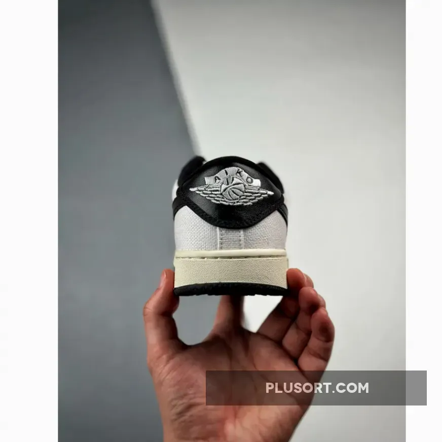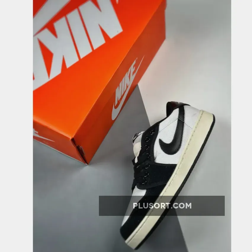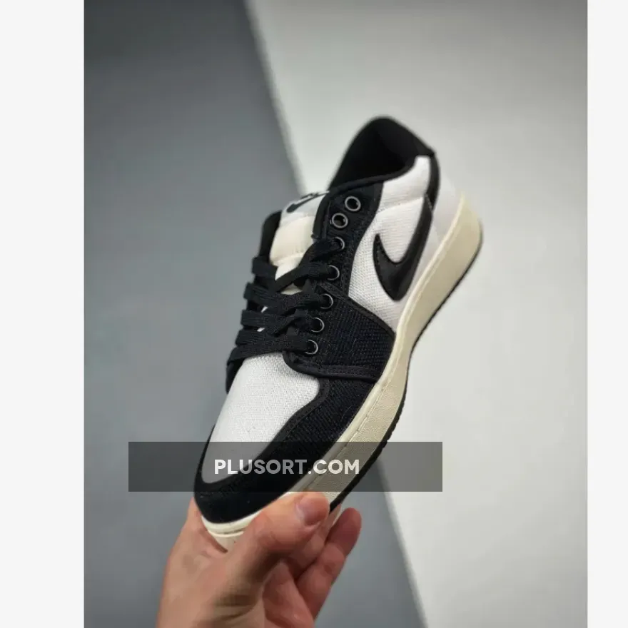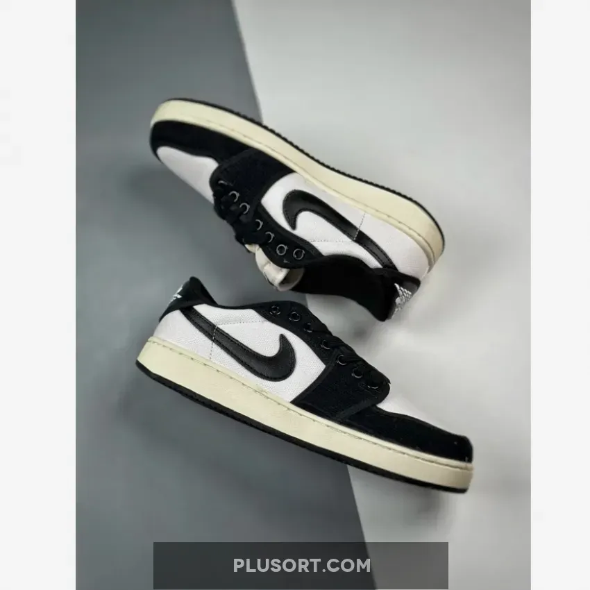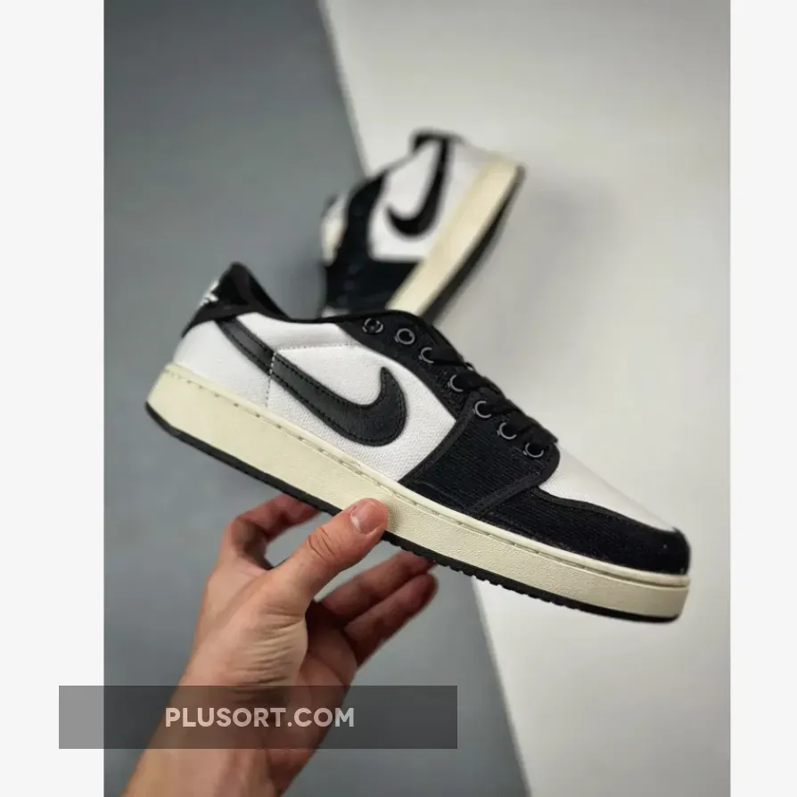 Dressed in a White, Black, and Sail color blocking giving off that “Panda” vibe. This offering of the Air Jordan 1 KO Low comes constricted in a full White and Black canvas base with Black leather Swooshes and heel overlay.
