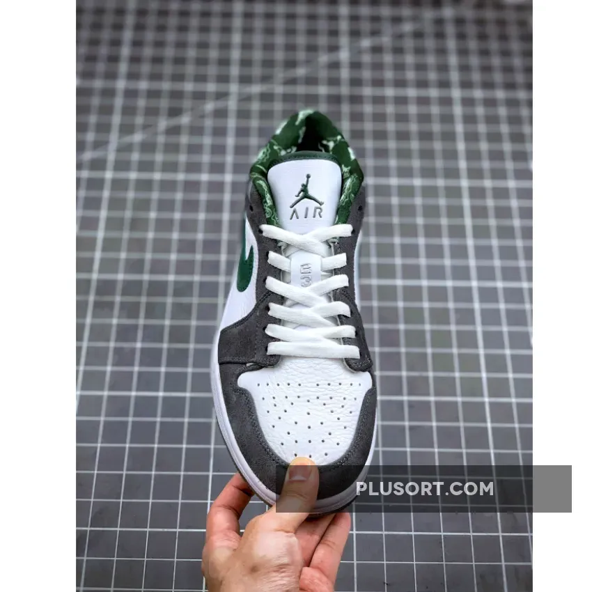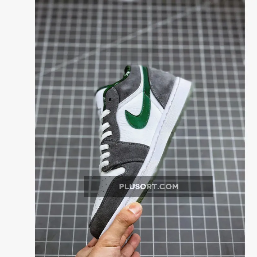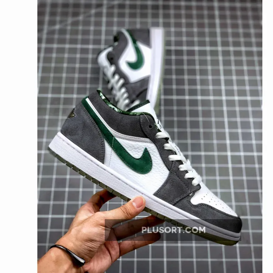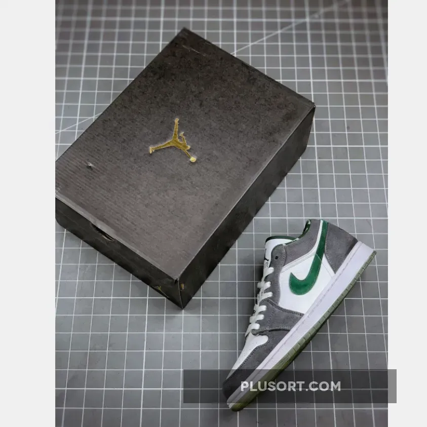 The Air Jordan 1 (I) Low North Side – White / Dark Forest – Light Graphite is part of the Air Jordan 1 (I) Regional Pack . It looks more like a Nike Dunk SB because of the leather and grey suede. It features a grey and white upper constructed from leather and suede, along with a clear outsole, which is a nice touch.