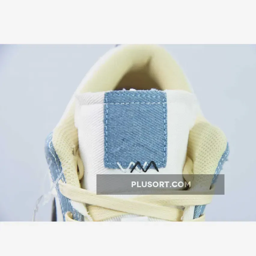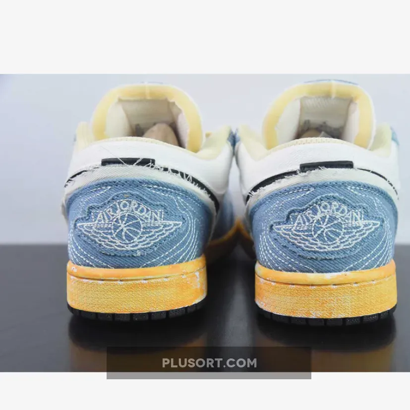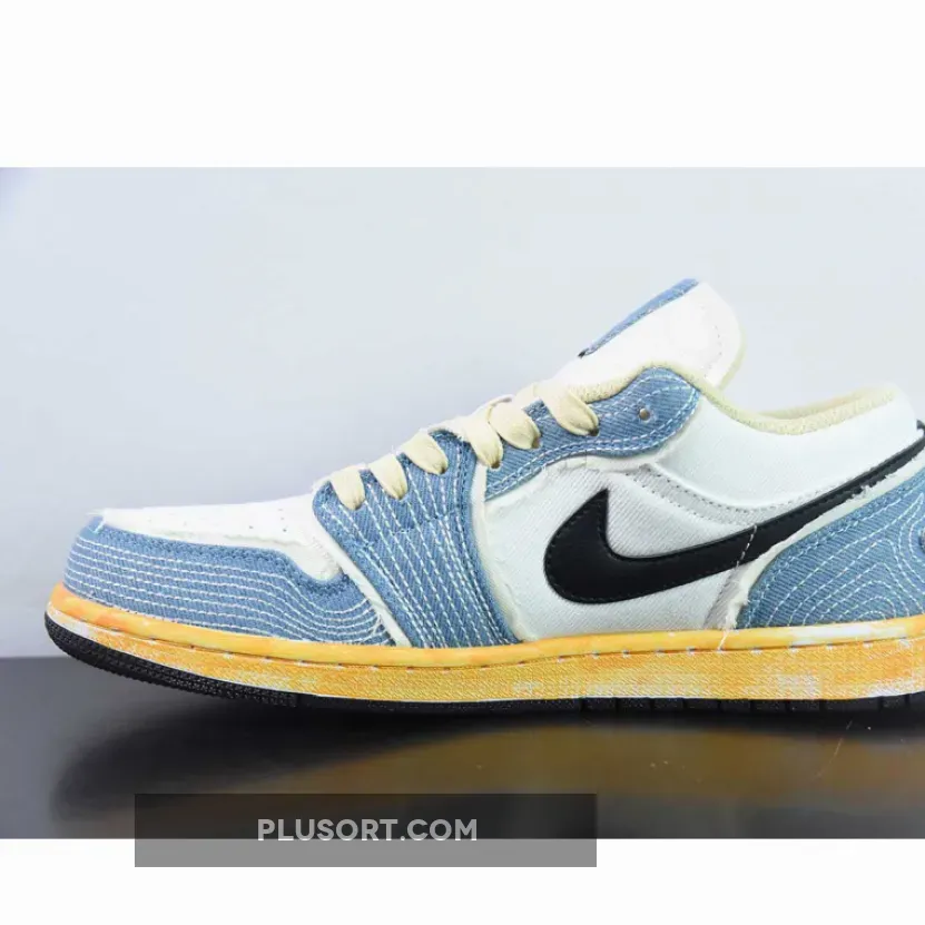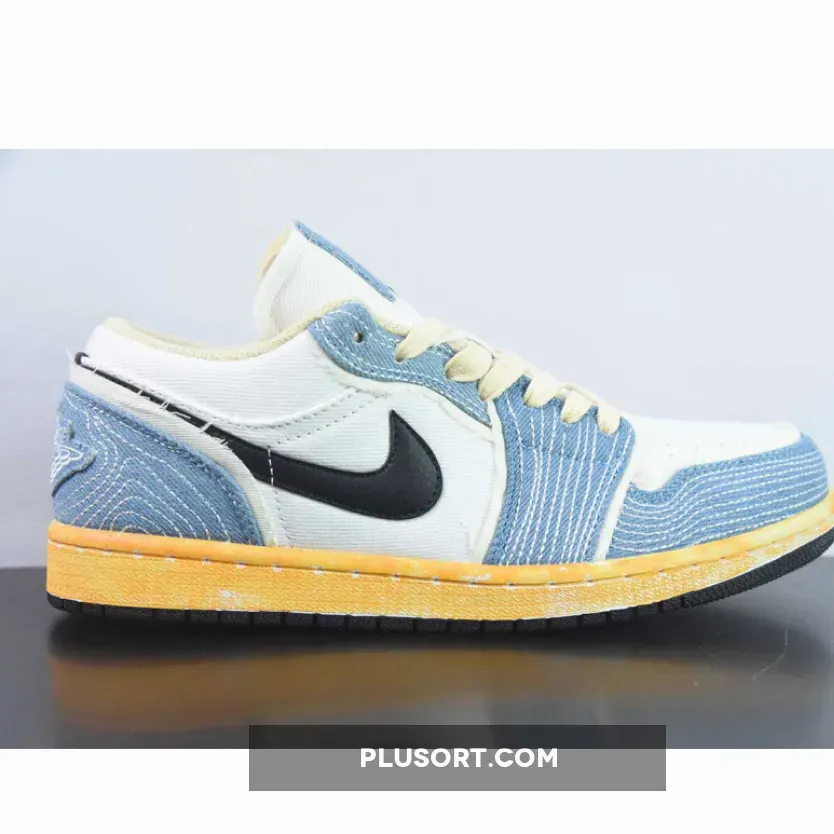Once more paying homage to the traditional Japanese craftsmanship, the Air Jordan 1 Low Sashiko is given an aged aesthetic made up of a White canvas base with distressing and wear denim fabric overlays taking care of the the toe box, forefoot, eyestay, and heels with frayed edges.