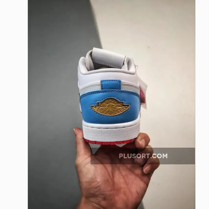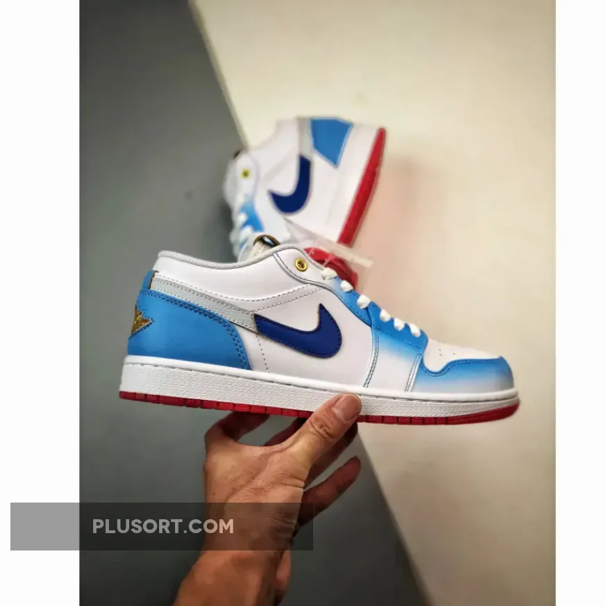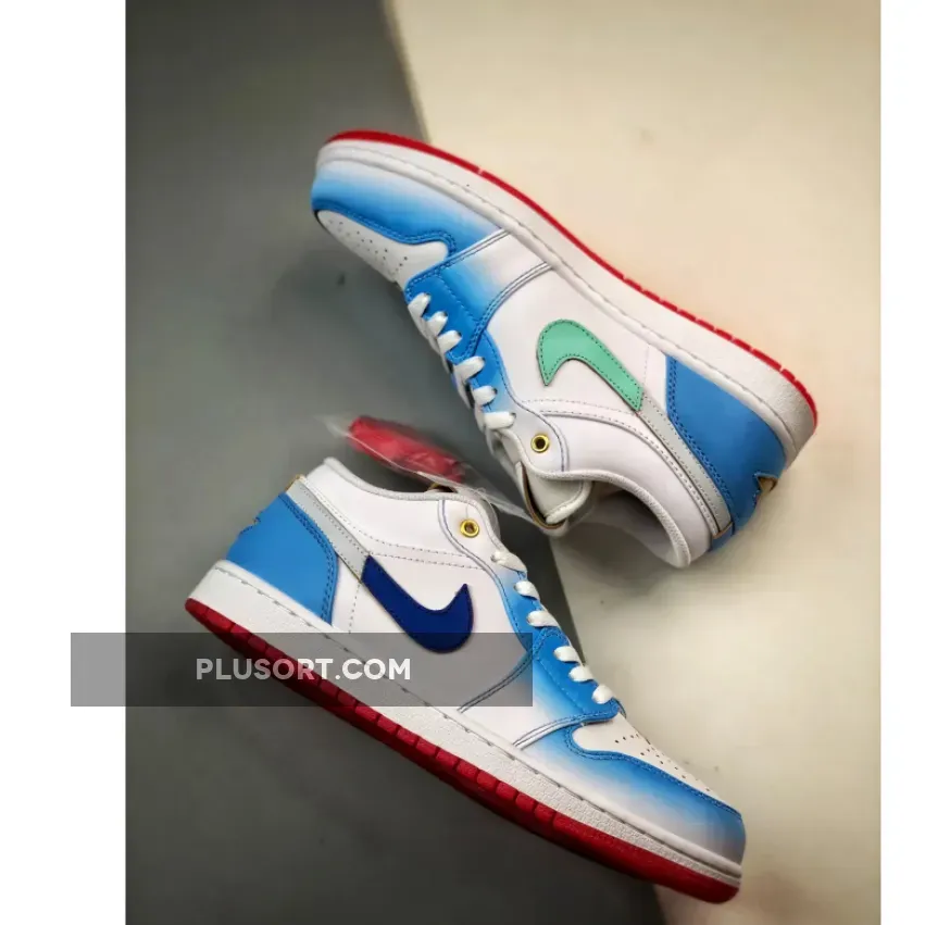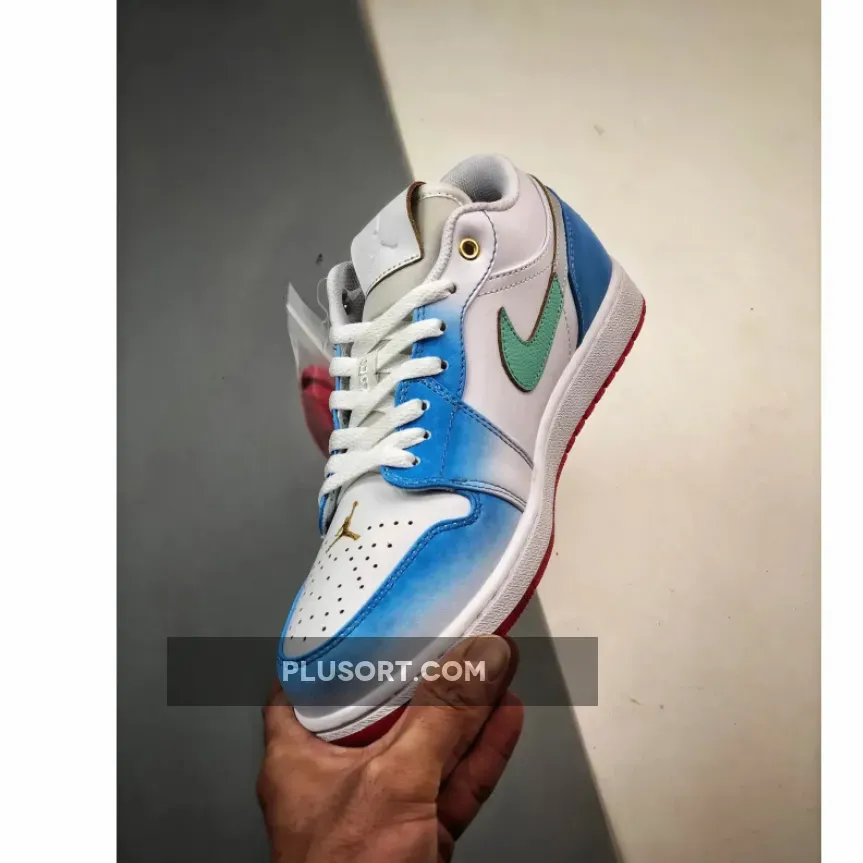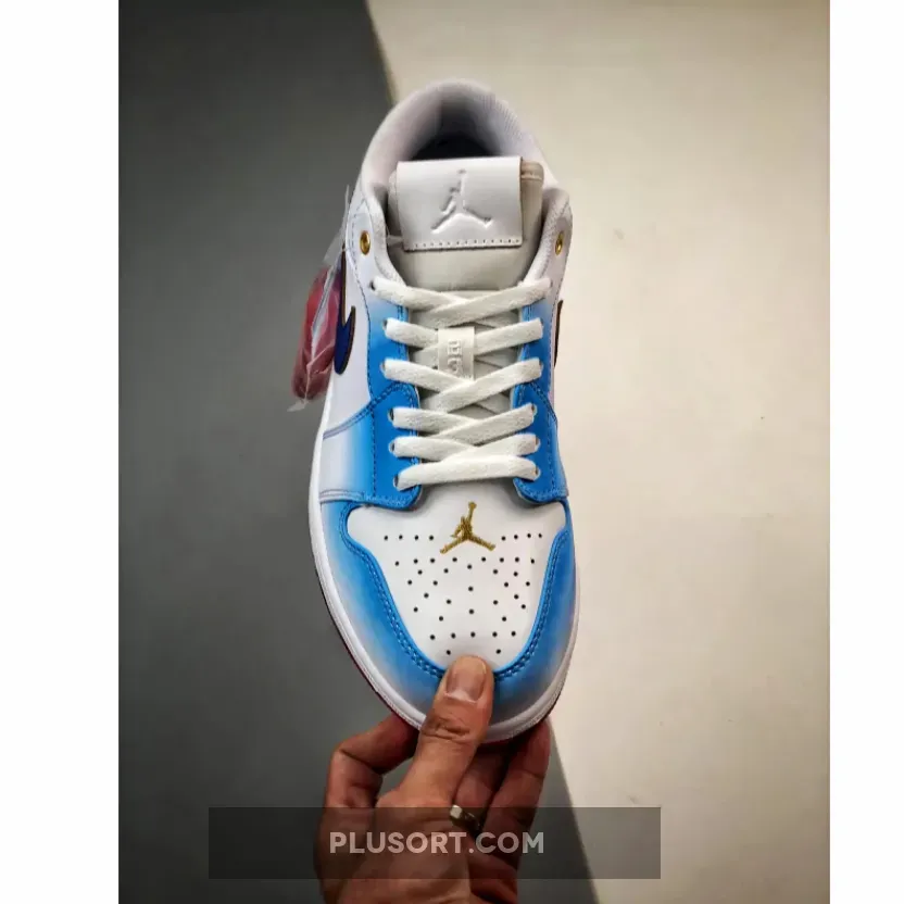 Jordan Brand has created a hit yet again for the little footers with this gradient colorway of the Air Jordan 1 Low. Covered in an official color makeup of White, Game Royal, White, University Blue, and University Red, this Air Jordan 1 Low begins with a White smooth leather construction on the base of the upper with University Blue gradients on the overlays and heels. Adding to the colorful look we have mismatched royal blue and teal Swooshes on the side panels as well as touches of gold on the upper eyelets, the embroidered Jumpman logos on the toes, and the Wings logos on the heels. White rubber midsoles and semi-translucent red outsoles finish up the look on this Air Jordan 1 Low