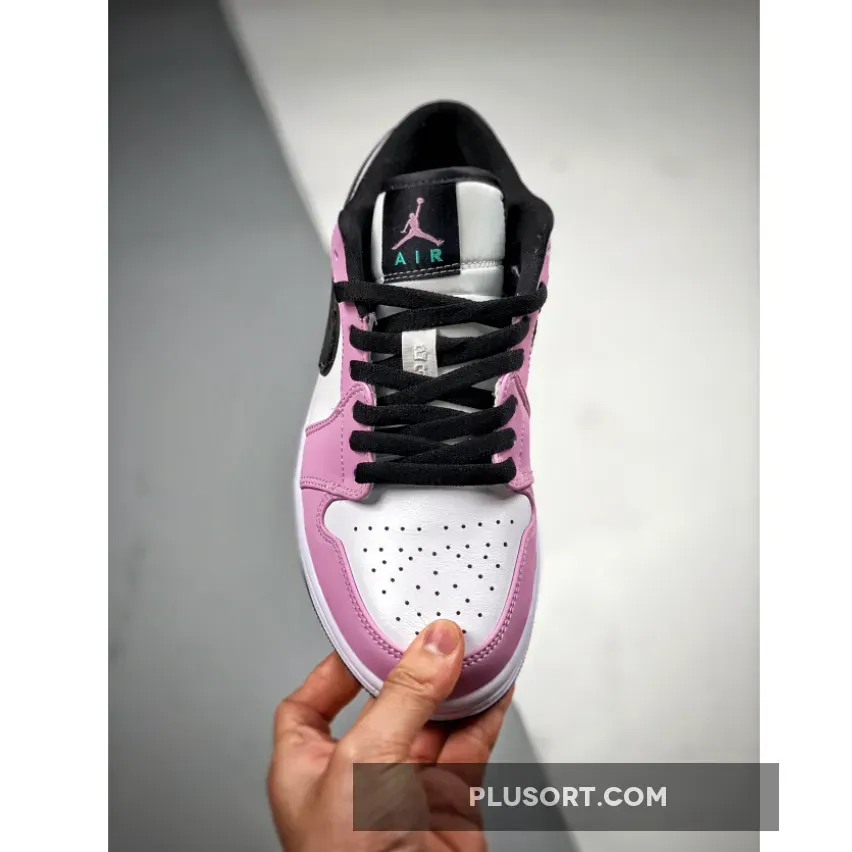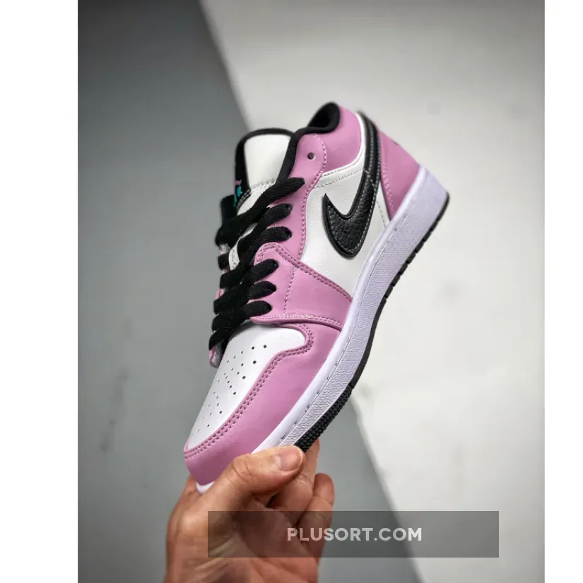 Dressed in a Violet Shock, Black, and Tropical Twist color scheme. This edition of the low-top Air Jordan 1 features a White leather base with Purple leather overlays up front and perforated suede in the rear. Black leather Swooshes with Teal stitching on the sides atop a White midsole and Black rubber outsole completes the design.