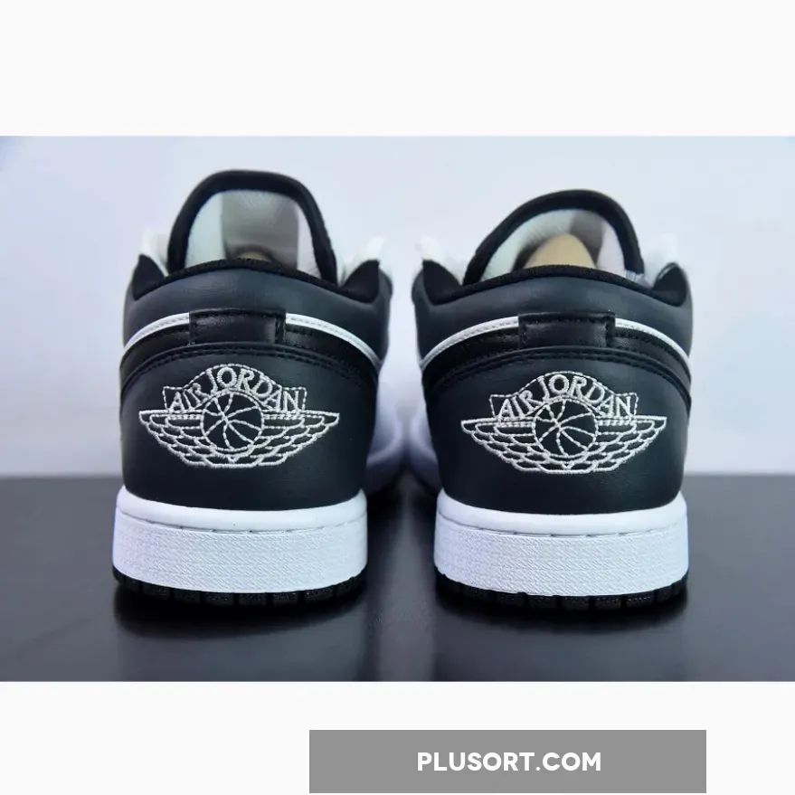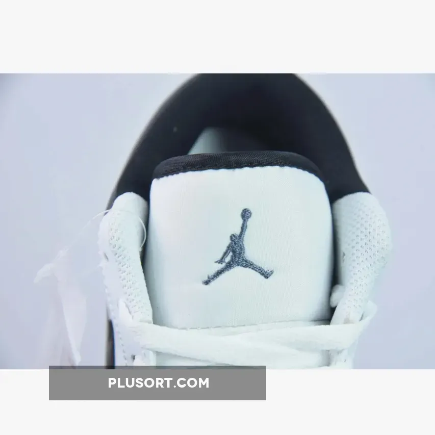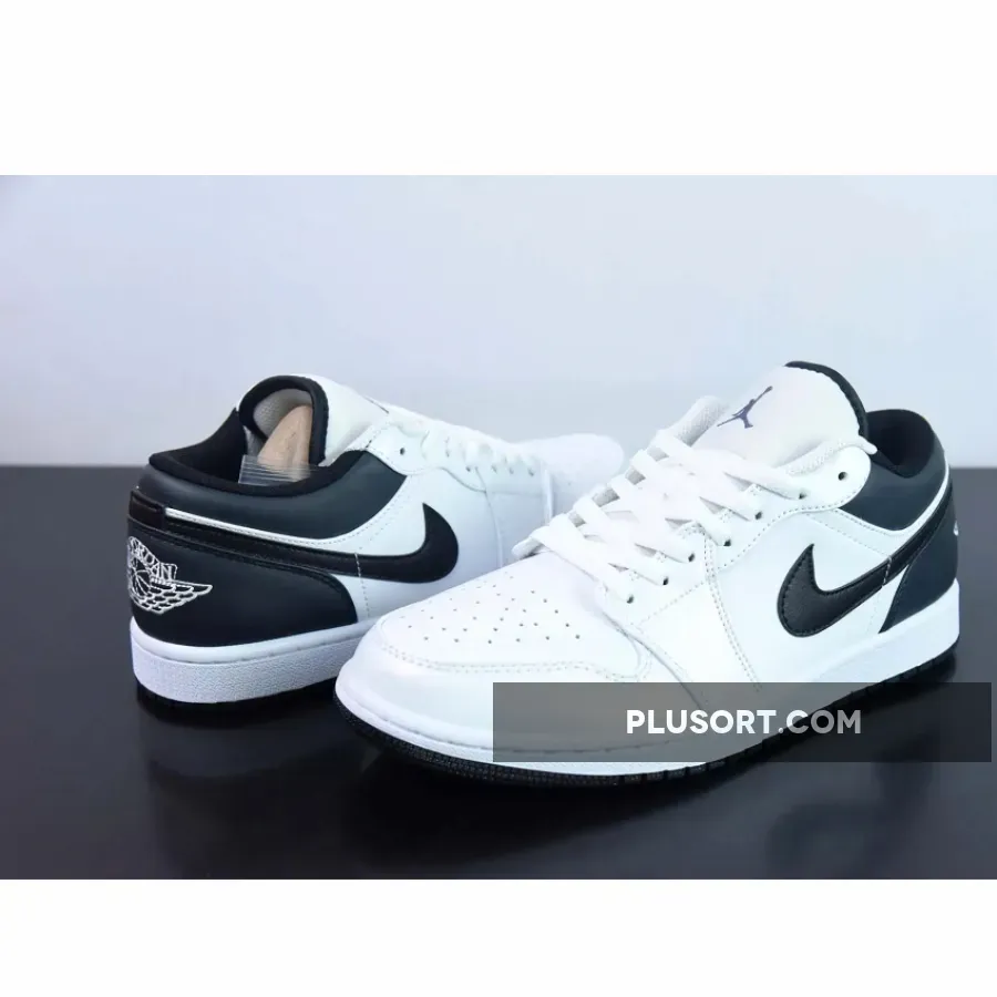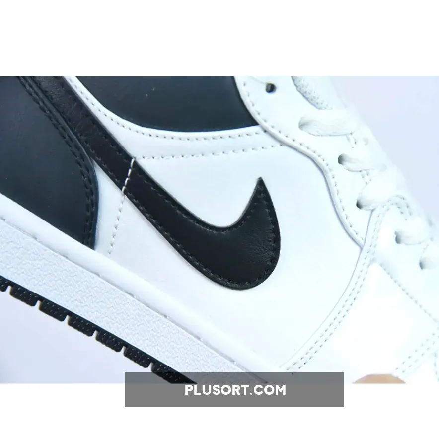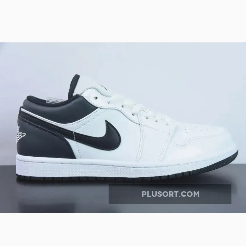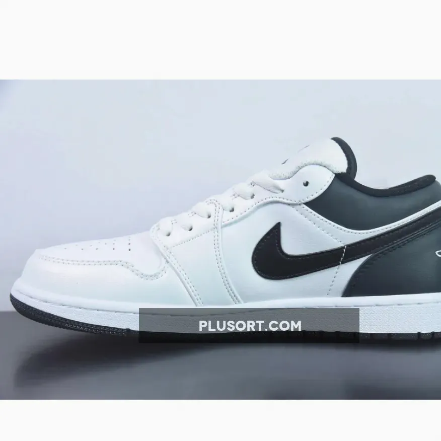 this Air Jordan 1 Low is primarily covered in white leather with contrasting black accents on the back half.Smooth white leather gracefully wraps around the toe box, mudguard, eyestays, and quarter panel.
