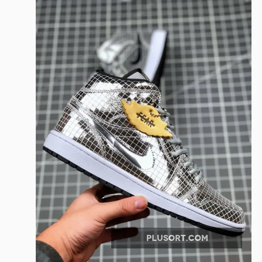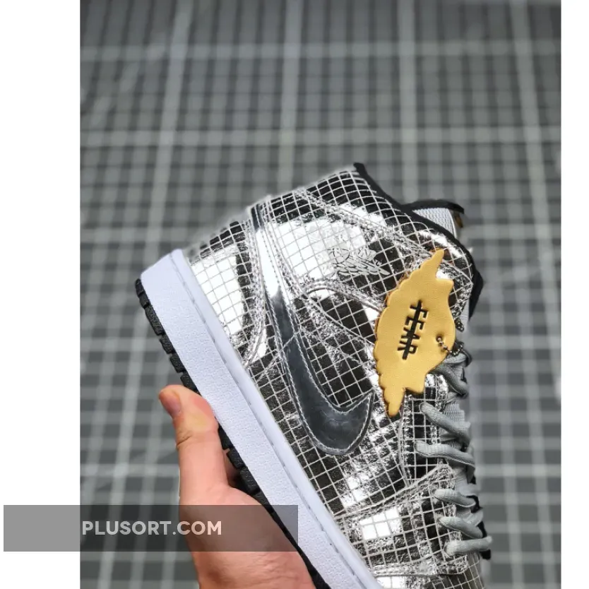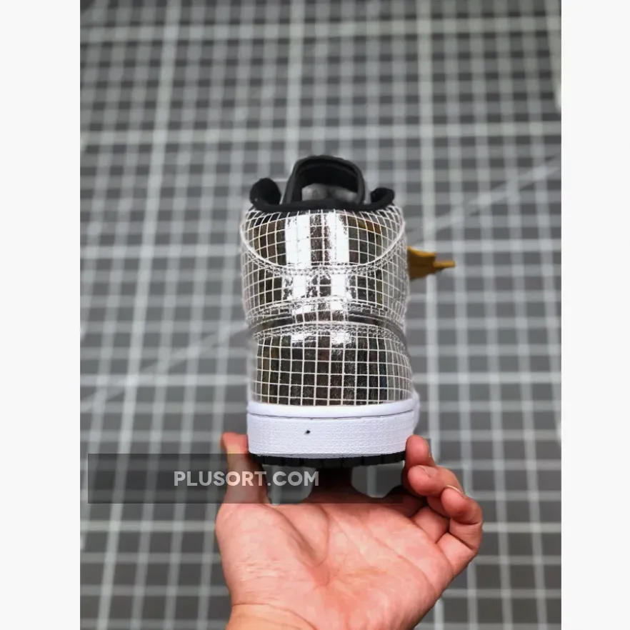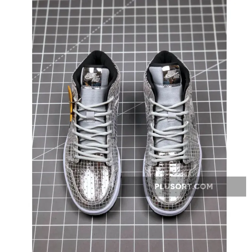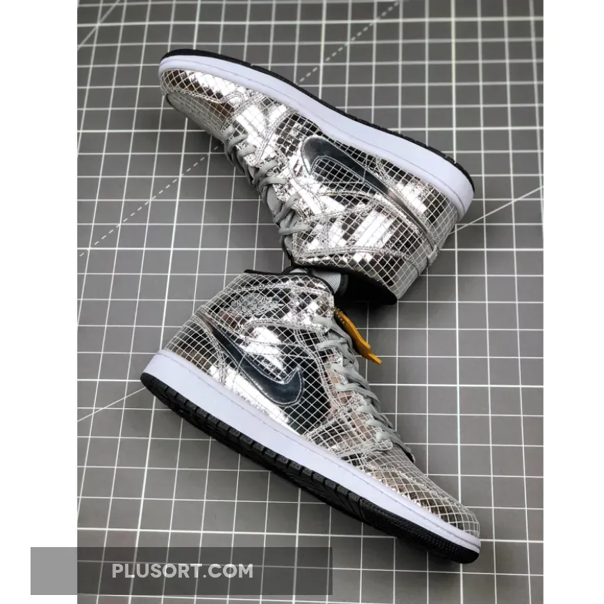 This offering of the mid-top Air Jordan 1 takes you back to the 1970s nightlife scene. It features a full mirrored squared-cut upper with Silver laces and a mesh tongue.