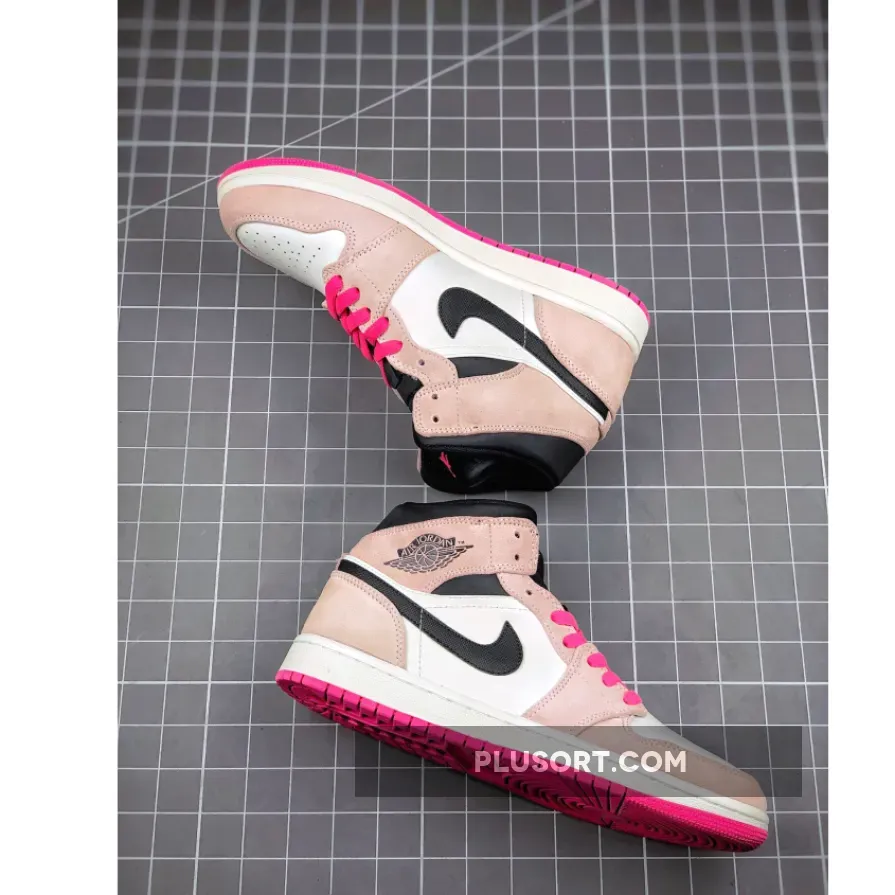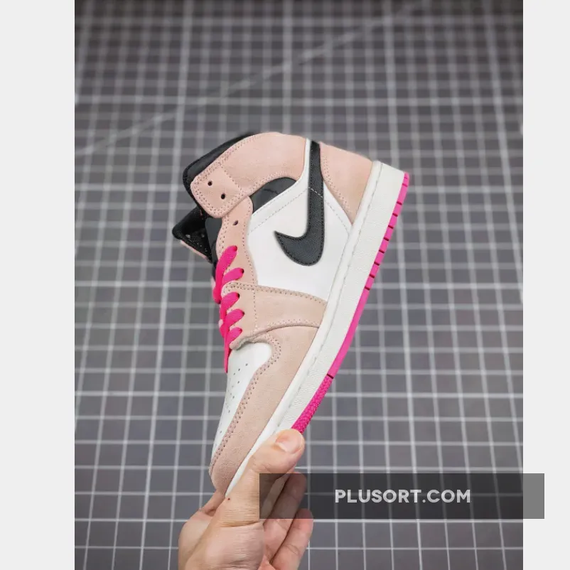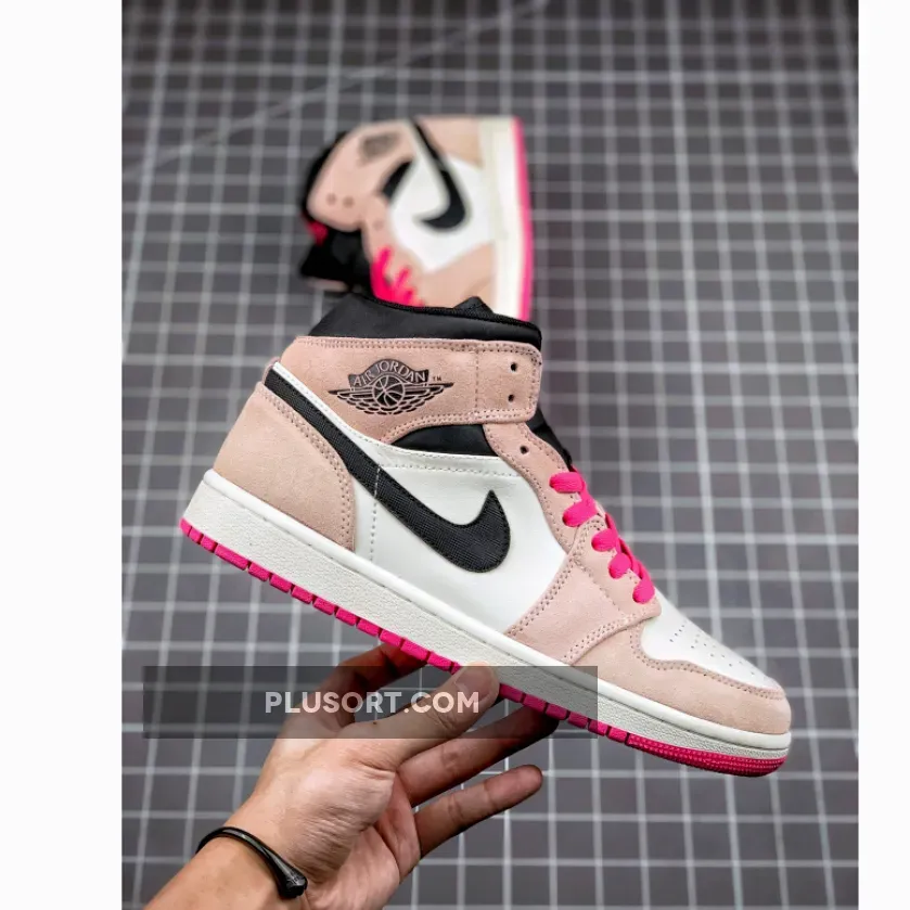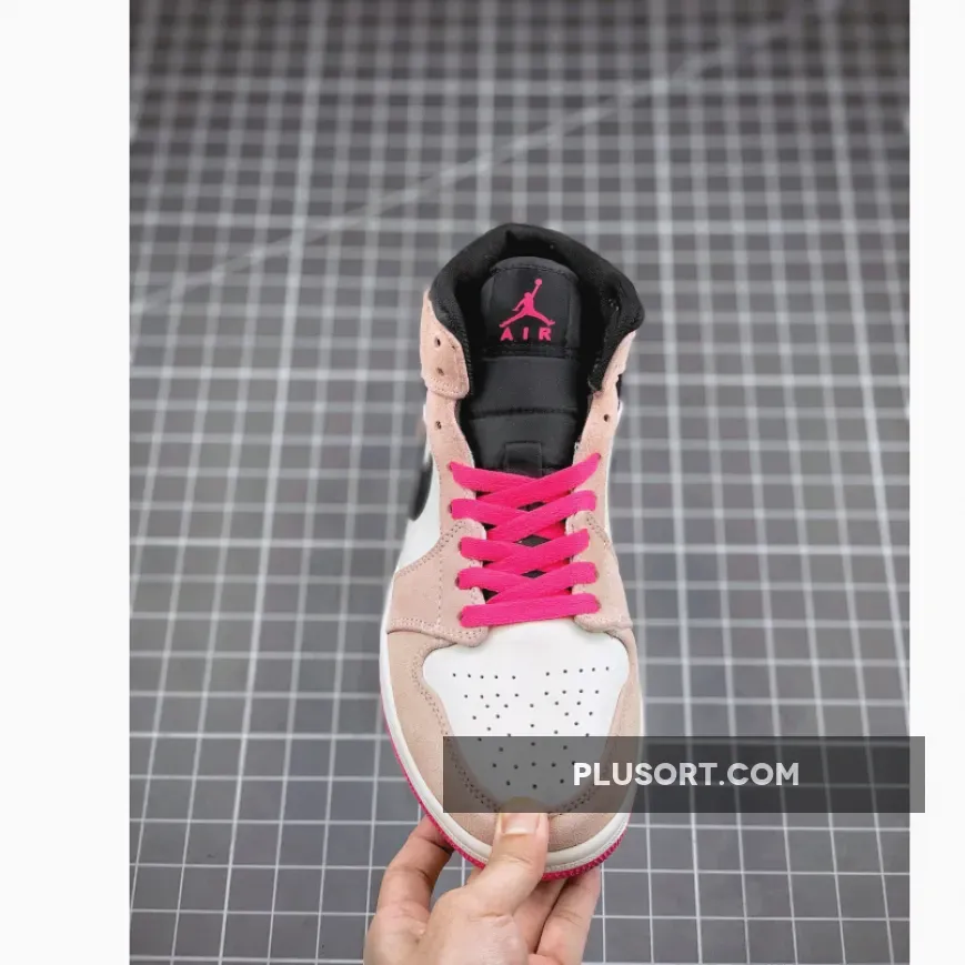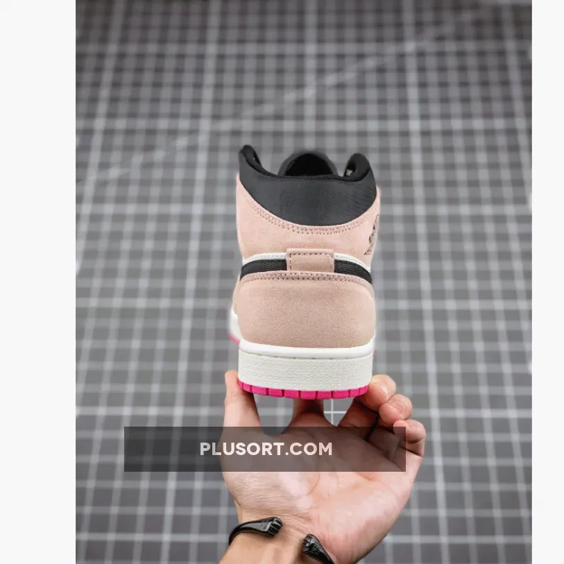 This mid-top Air Jordan 1 features a White leather upper with Pink suede overlays and Black nylon on the Swoosh logo and collar.