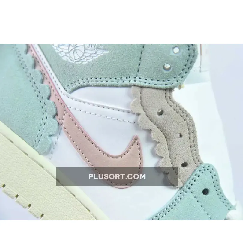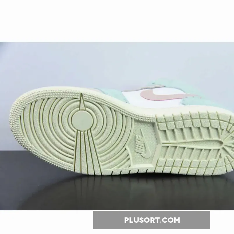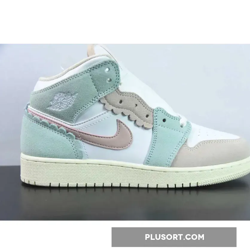 Dressed in a White, Pink Oxford, Jade Ice, Guava Ice, and Coconut Milk color scheme. This offering of the mid-top Air Jordan 1 comes constructed with a White leather base, suede pastel-colored overlays detailed with scalloped edges. Pale orange comes in via the mudguard and upper eye stays, while the lower eye stays, collar overlay and heel panel introduce a soft mint. Branding-wise, you get the signature Swoosh motif partially nestled under one of the scalloped trims for a fun, summery touch. Finally, the gum midsoles introduce a sandy-beige hue and come textured with micro spikes and ridges for traction.