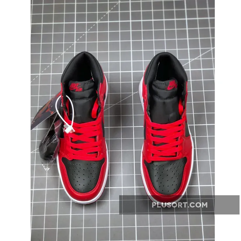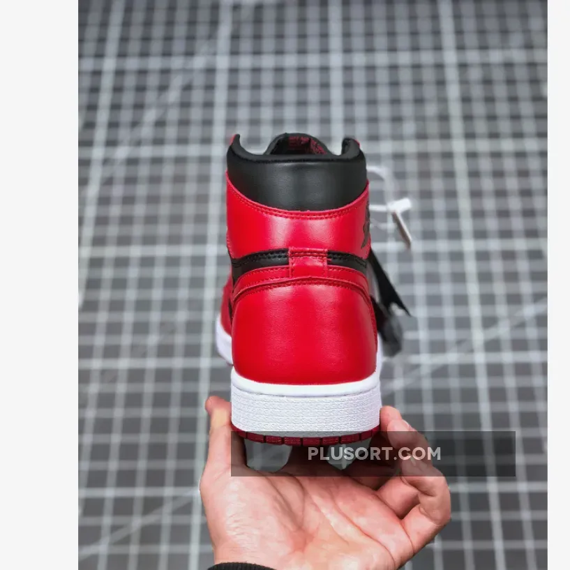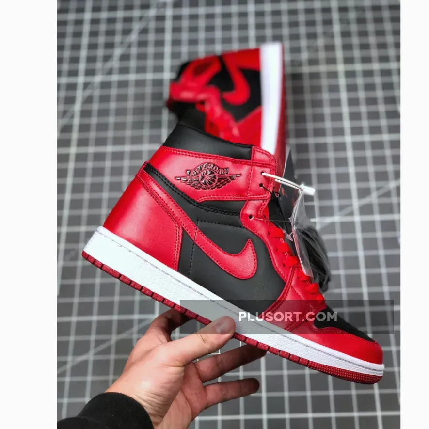 Dressed in a Varsity Red, Summit White, and Black color scheme. This Air Jordan 1 features a Black upper with Red leather overlays atop a White midsole and Red rubber outsole.