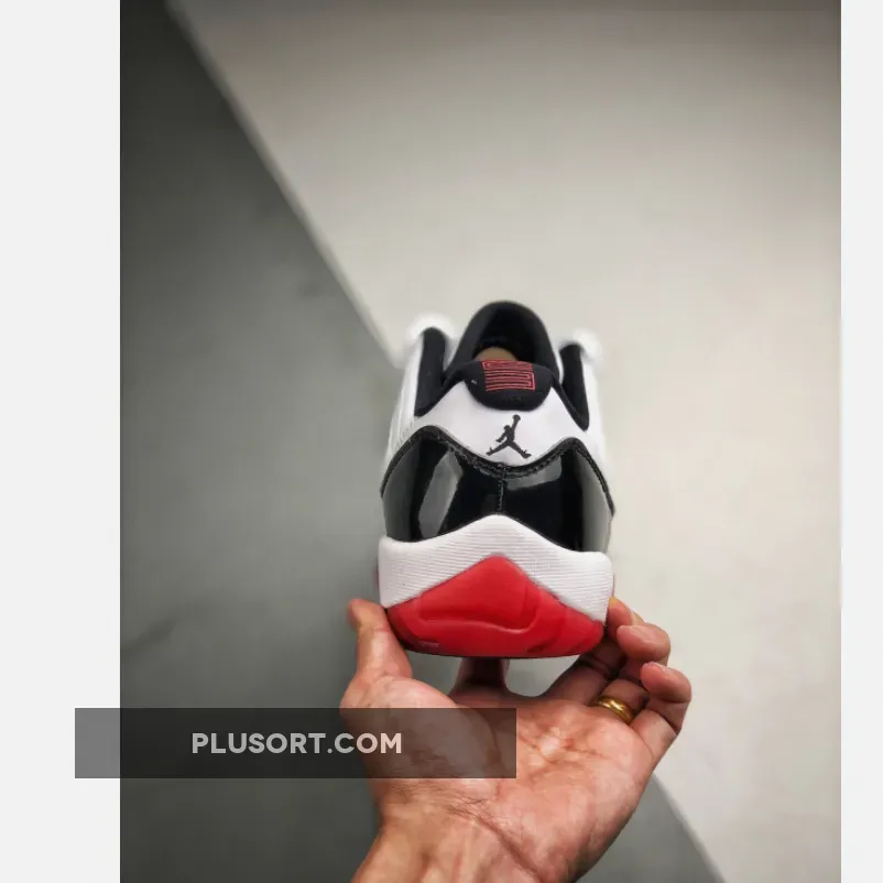 The Air Jordan 11 Retro Low ‘Concord-Bred’ combines two iconic OG colorways of the original mid-top silhouette. The upper replicates the look of the ‘Concord’ Air Jordan 11, featuring a white leather upper with a signature patent leather overlay in contrasting black and unexpected red branding elements at the tongue and heel.