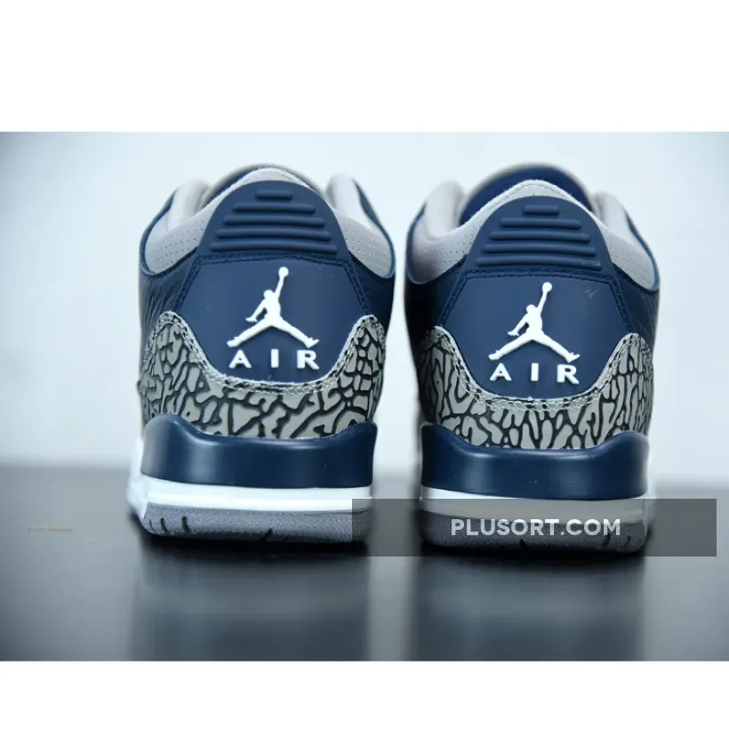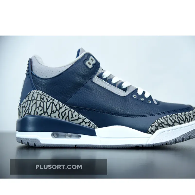 The Air Jordan 3 Retro ‘Georgetown’ is clad in the signature colors of the Hoyas, the team that Michael Jordan victimized on the way to an NCAA national championship. The classic silhouette features a navy tumbled leather upper, reinforced with signature elephant print overlays at the toe and heel. Jumpman branding hits adorn the grey synthetic leather tongue and molded navy heel panel. Lightweight cushioning is provided by a polyurethane midsole enhanced with a visible Nike Air unit under the heel.