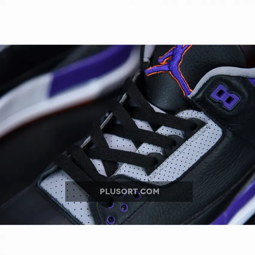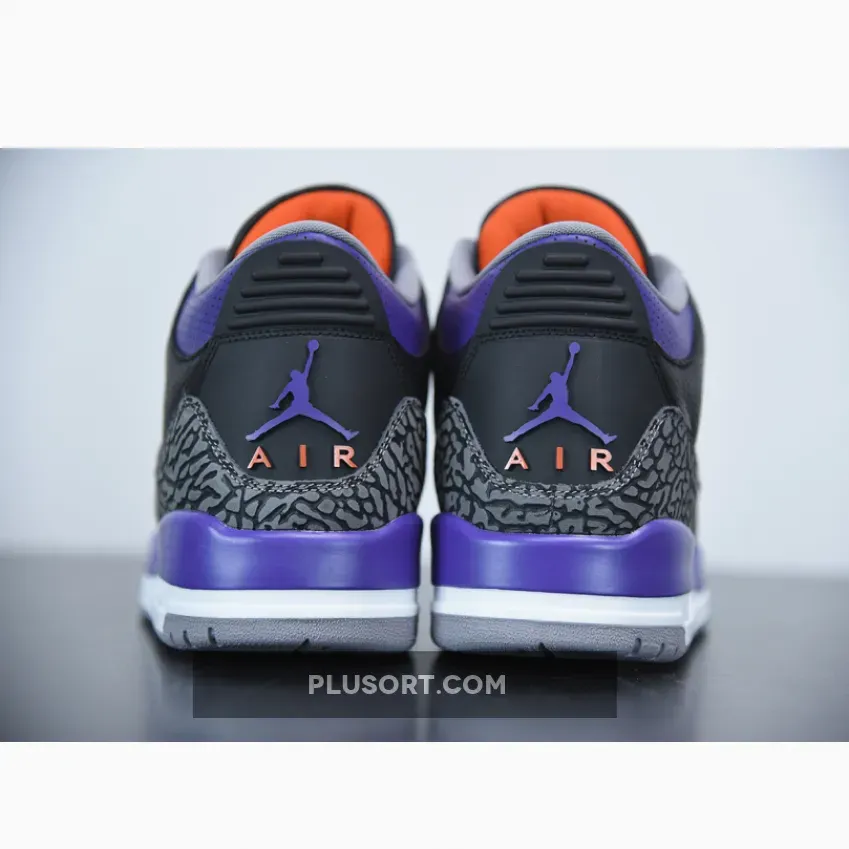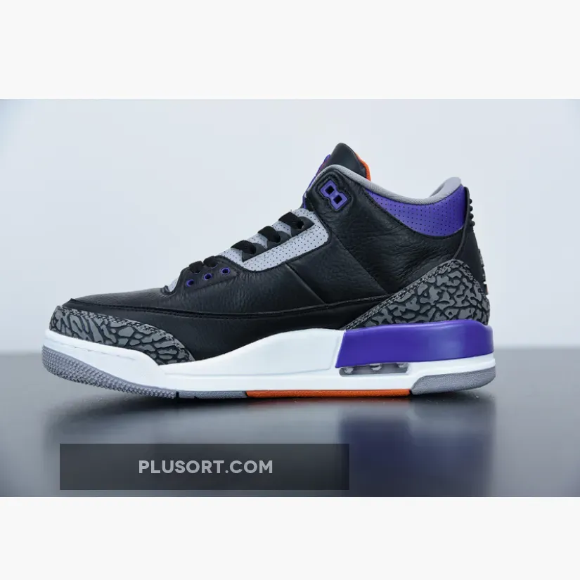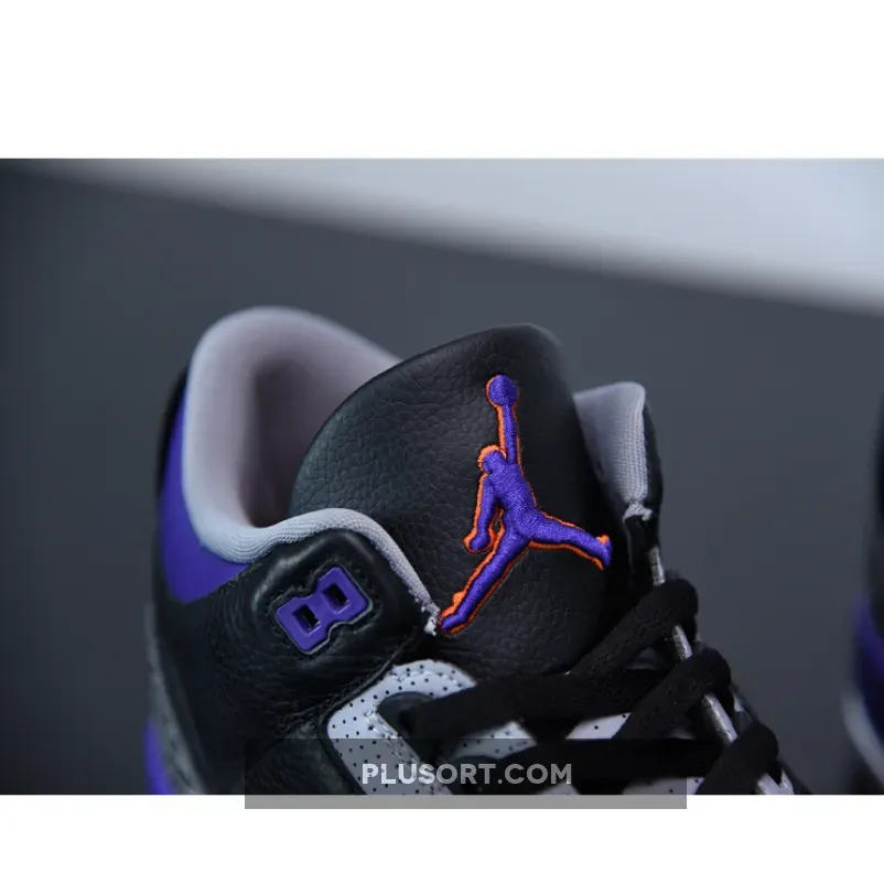Underfoot, a white midsole is complemented with a purple color segment, while the shoe boasts a visible Nike Air unit under the heel, one of the Air Jordan 3s most popular features.