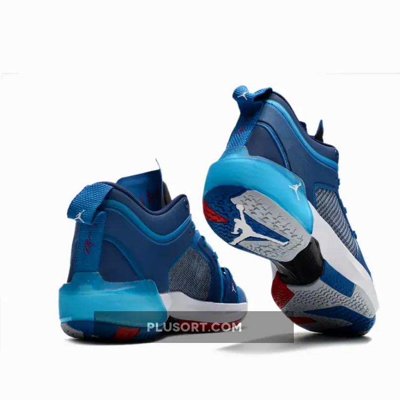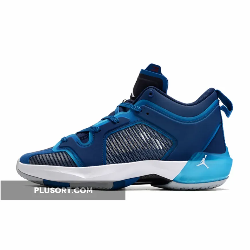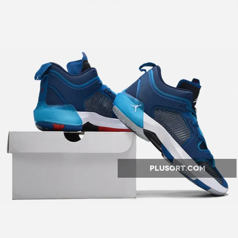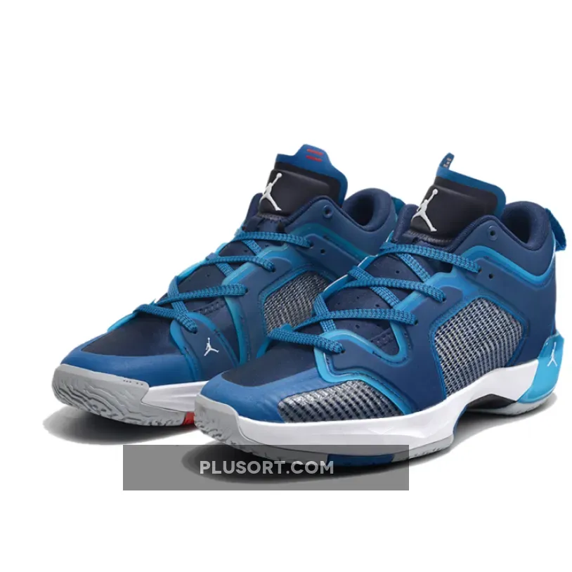 This Air Jordan 37 Low features a Military Blue, White, Midnight Navy, True Red, and Sky Grey color combination. Highlighting the shoes, Featuring the same sequence of Greek letters that appeared on the latter collection’s heel insignia, its white and blue crest renders a singular appearance atop the left tongue in place of its typical Jumpman logo. Finishing the look is a crisp white midsole unit and semi-translucent icy blue heel counter pairs with sectioned grey embellishments along the tread underfoot..