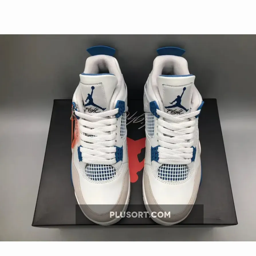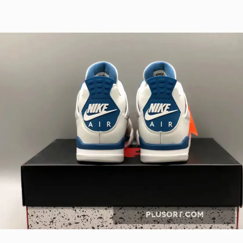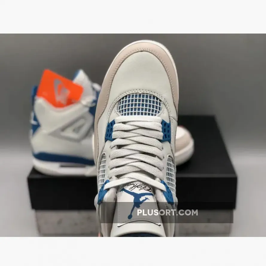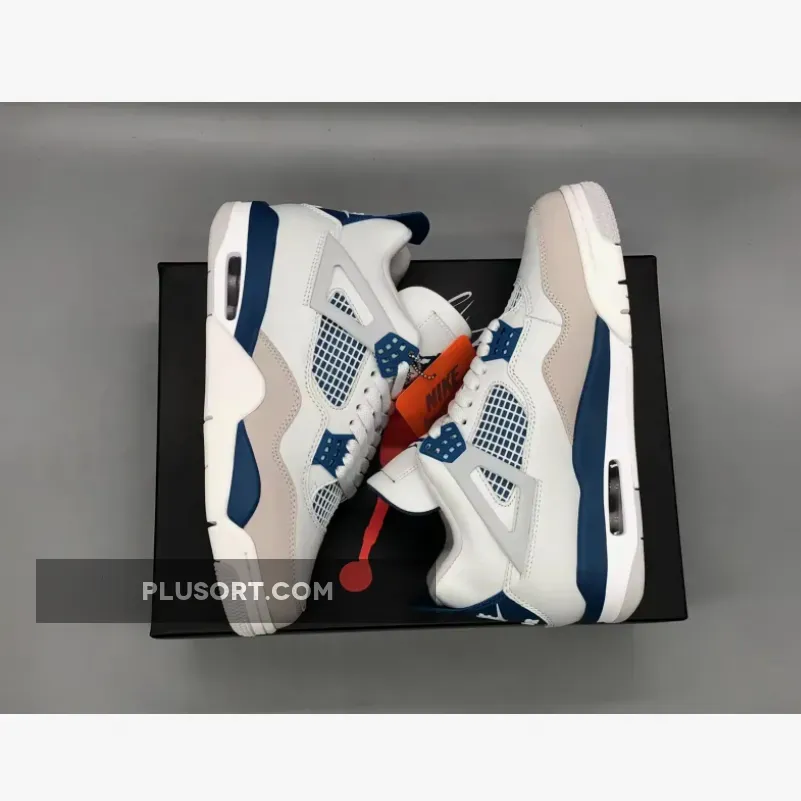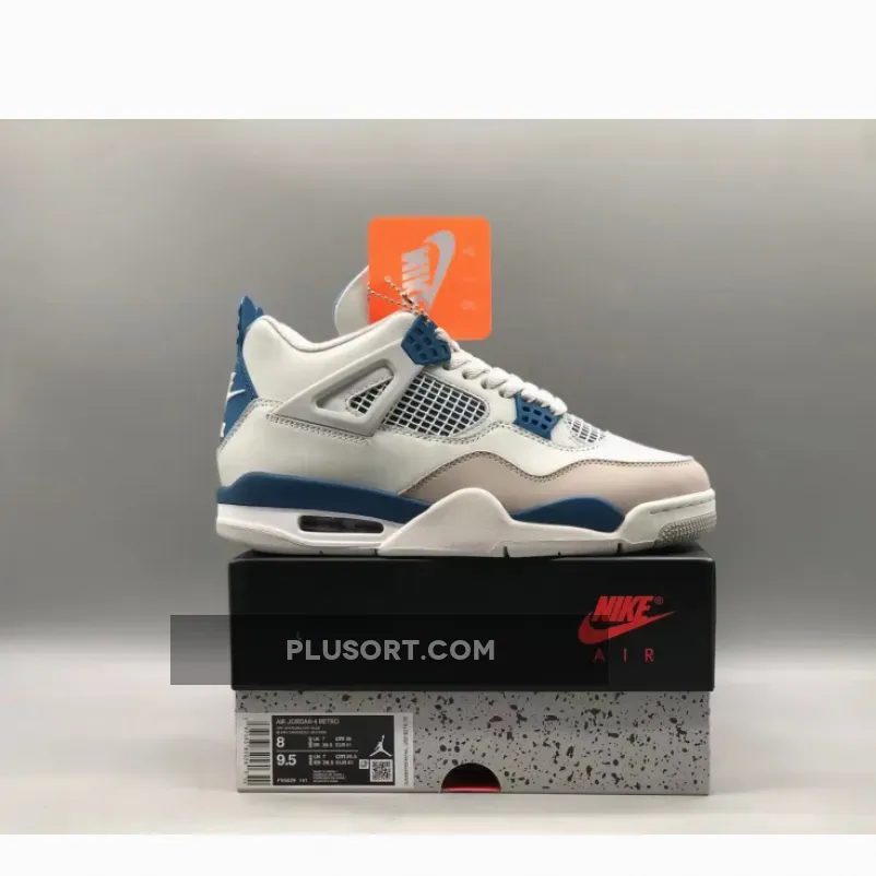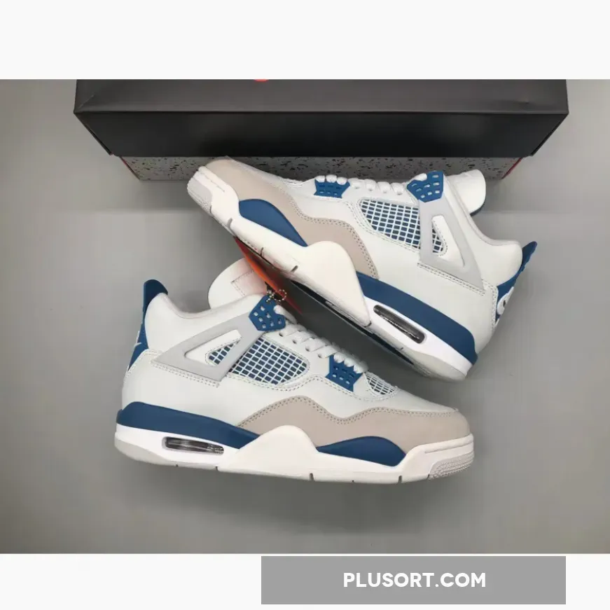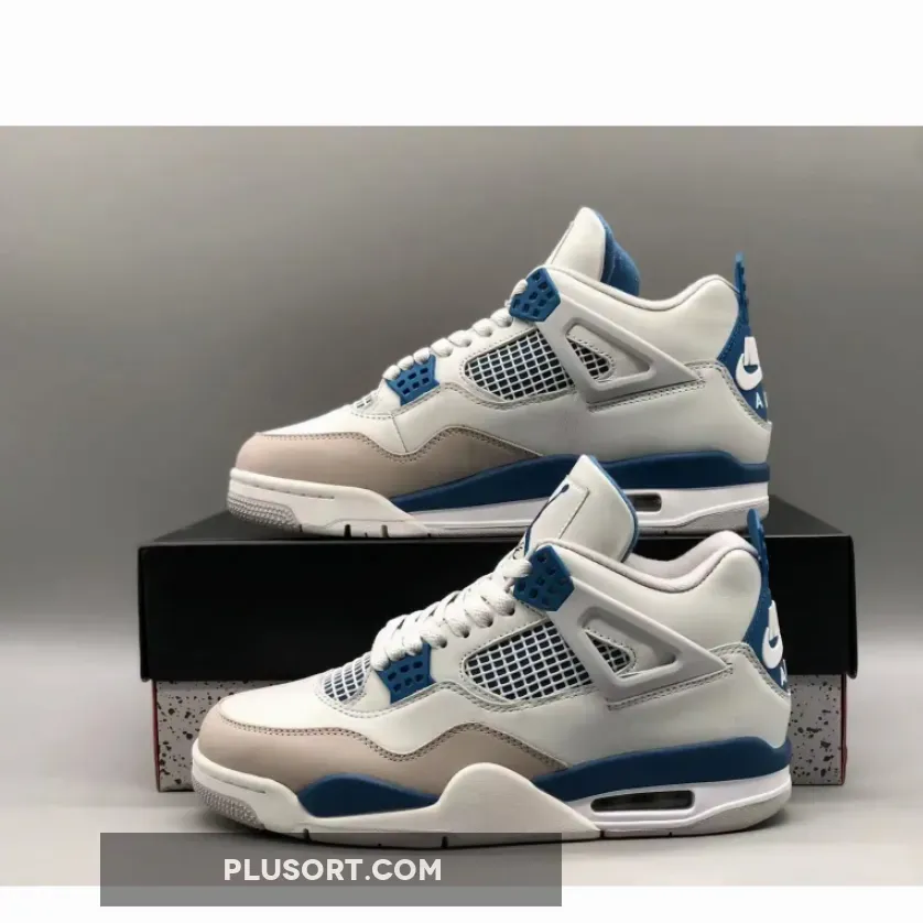 The Air Jordan 4 showcases a timeless color scheme consisting of Off-White, Military Blue, and Neutral Grey. Its upper is crafted from Off-White leather with overlays in Neutral Grey adorning the toe area. The quarter panel is equipped with a “Military Blue” underlay and topped off with the AJ4’s signature net. The design is elevated by Military Blue accents on the eyelets, midsole, heel tabs, and Jumpman logos on the tongues. Adding to the authenticity, the heels bear “Nike Air” branding in White, while a White, Blue, and Grey rubber outsole completes the overall aesthetic.
