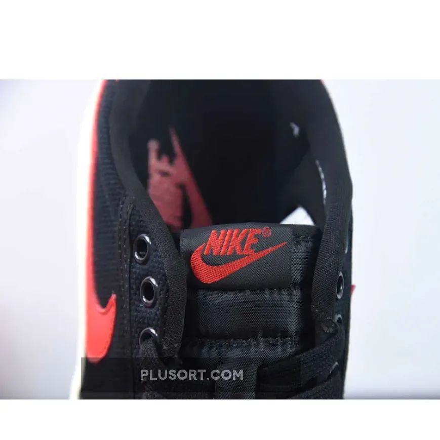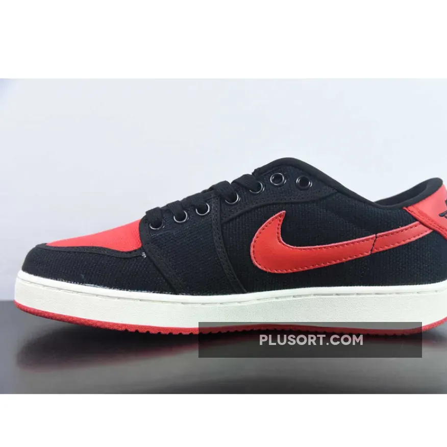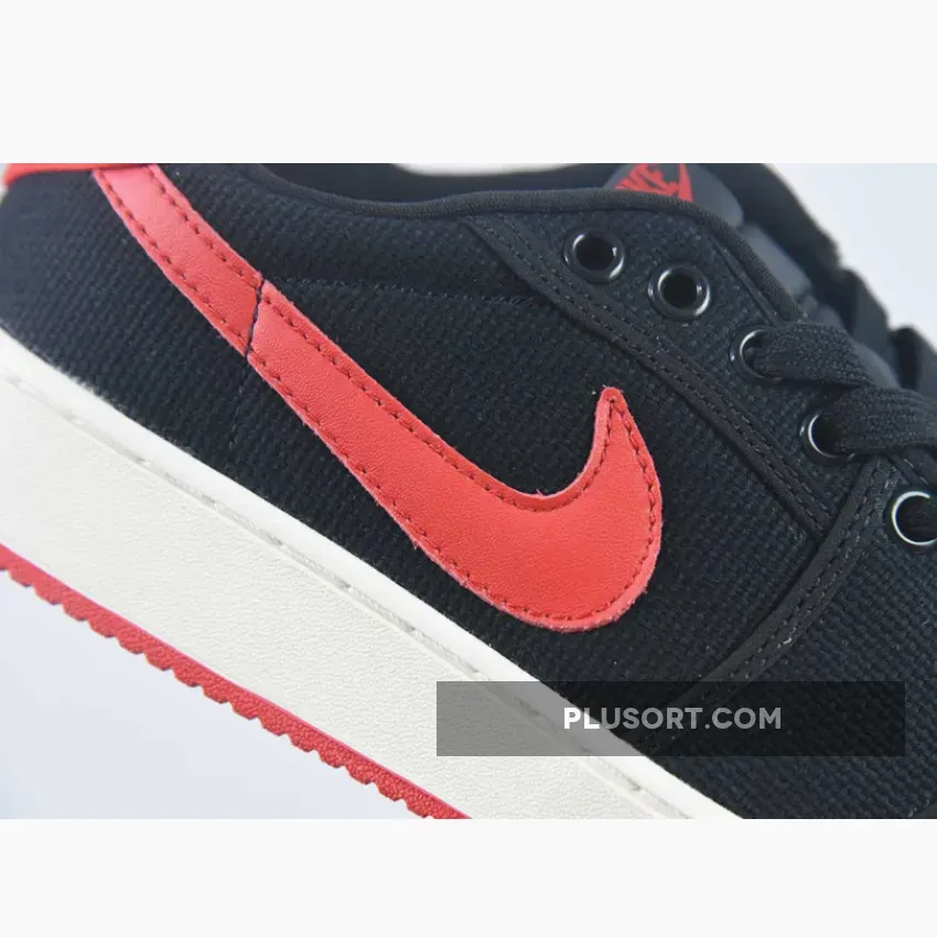 this colorway of the Air Jordan 1 KO Low is constructed out of a full Black and Red canvas base decorated with Red leather Swooshes and heels.