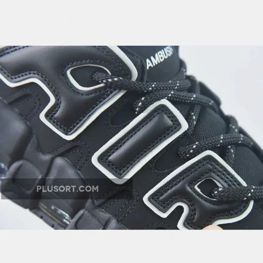 The AMBUSH x Nike Air More Uptempo Low comes in a traditional Black and White scheme of colors. The shoe is made with painstaking attention to detail, with an all-Black nubuck top, mesh tongue flaps, as well as leather “AIR” text highlighted in White.