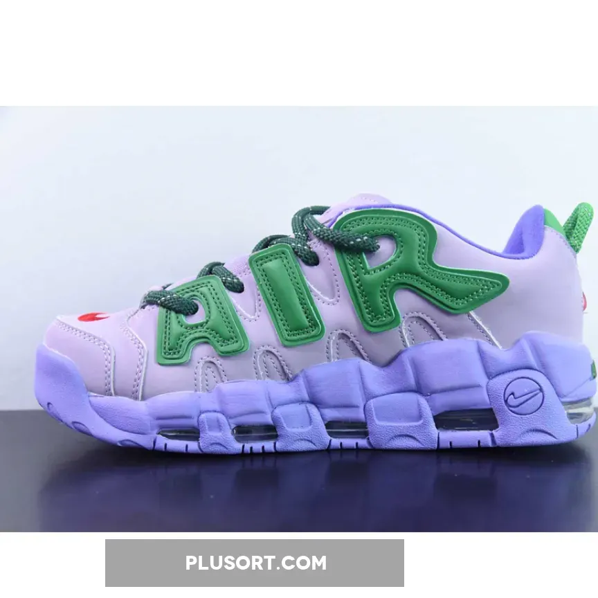AMBUSH’s Nike Air More Uptempo Low has a “Lilac” nubuck upper with “AIR” lettering across the sidewalls in “Apple Green.” The Nike Swoosh on the toebox is embroidered in “University Red,” which is repeated in bubble form on the heel.
