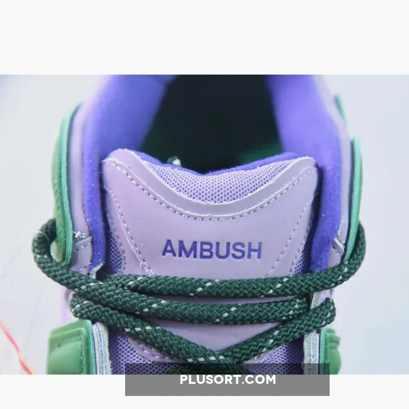 Additional touches of Green can be seen on the laces, pull tabs, and AMBUSH branding on the heels. The inner lining is covered in Purple, while the Purple sole incorporates a transparent full-length Air unit, providing a distinct finishing touch to the overall design.
