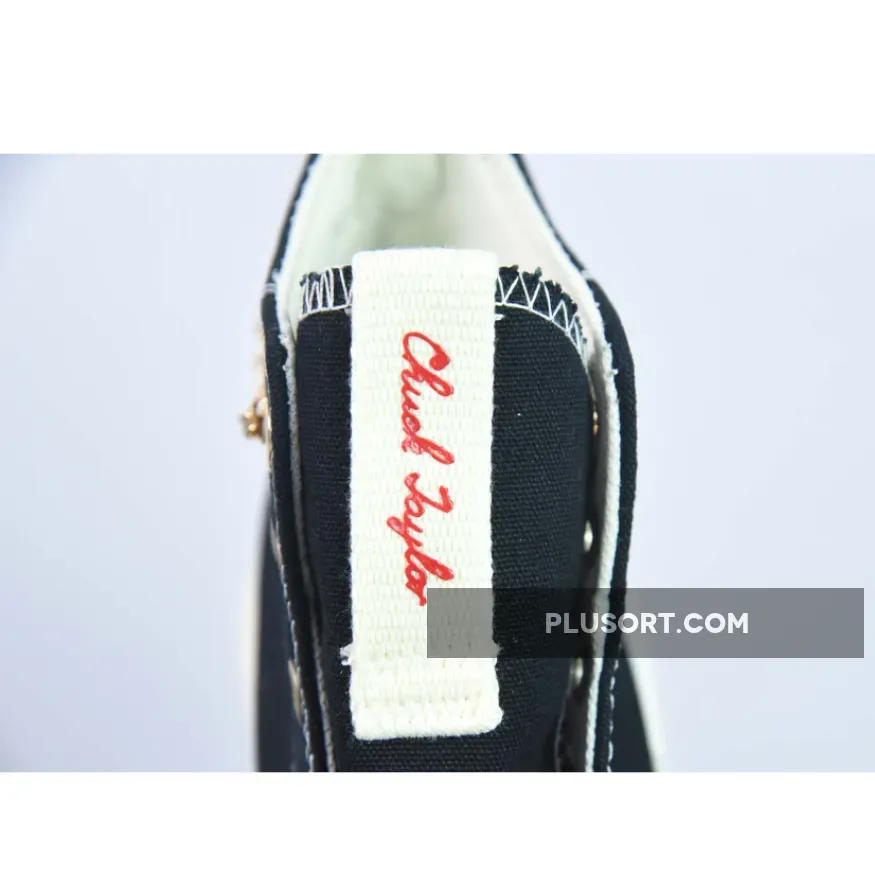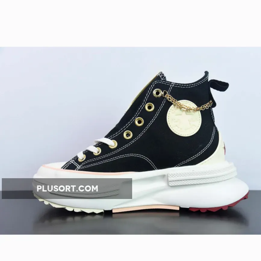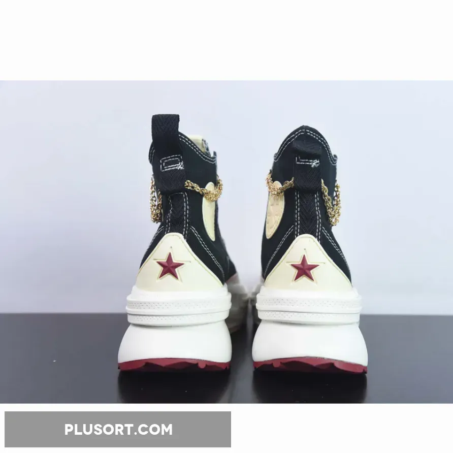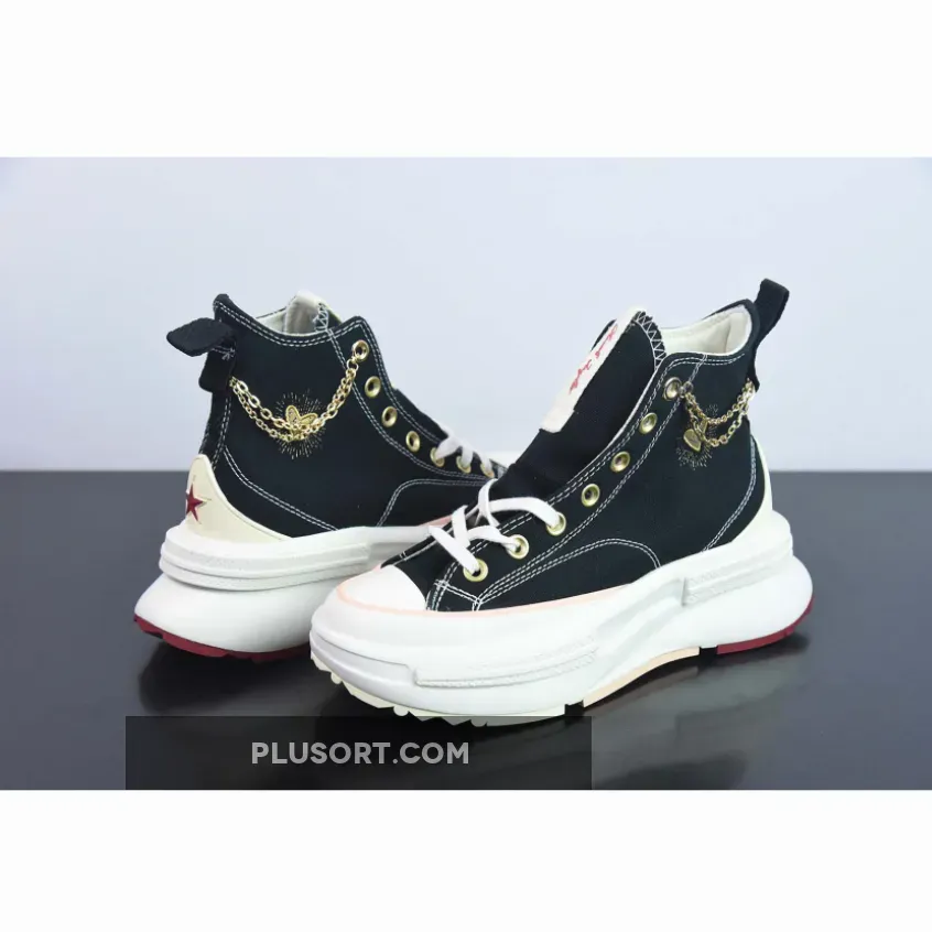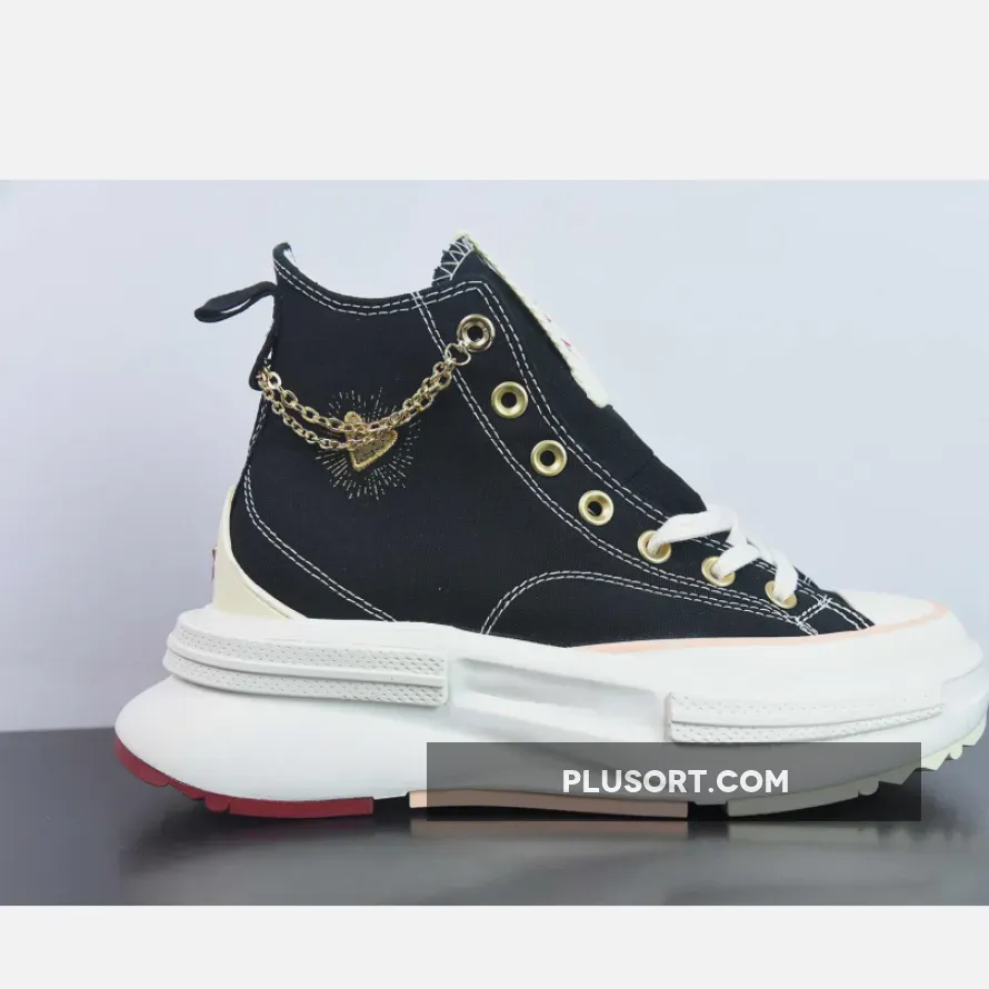 This high-top Run Star Legacy CX Platform has a black canvas upper with exposed white stitching. Valentine’s-inspired pink ankle patches with embossed All Star branding can be found on the medial sides of the shoe. Metallic gold eyelets, heart accents on the lateral mid-panels and an ankle chain give this shoe a celebratory feel. An Egret-coloured EVA platform midsole and a cream, pink and Back Ally Brick rubber outsole cap off the style of these kicks.