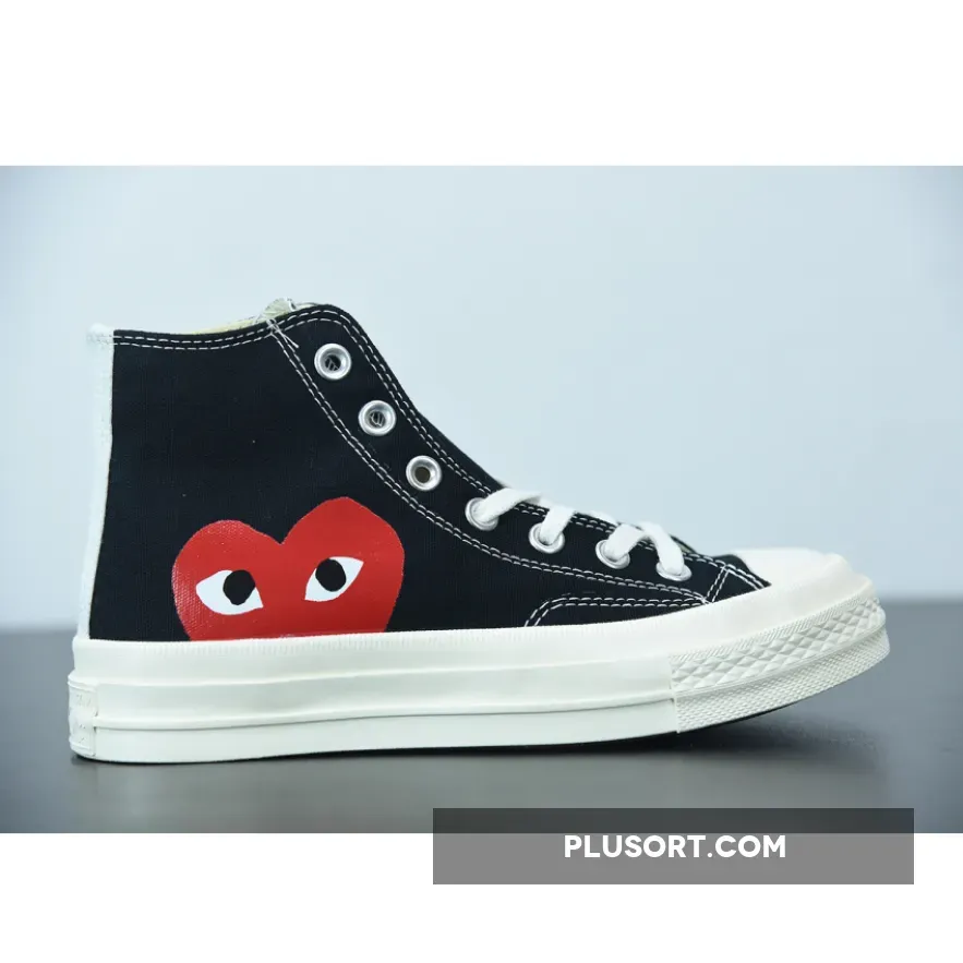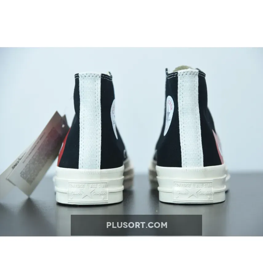 Designed by graphic artist Filip Pagowski and Comme des Garçons founder Rei Kawakubohe, the Comme des Garçons x Chuck Taylor 1970 Low ‘Play’ is a special edition colorway that features a black canvas upper with an oversized signature CDG red heart printed at the quarter panels.
