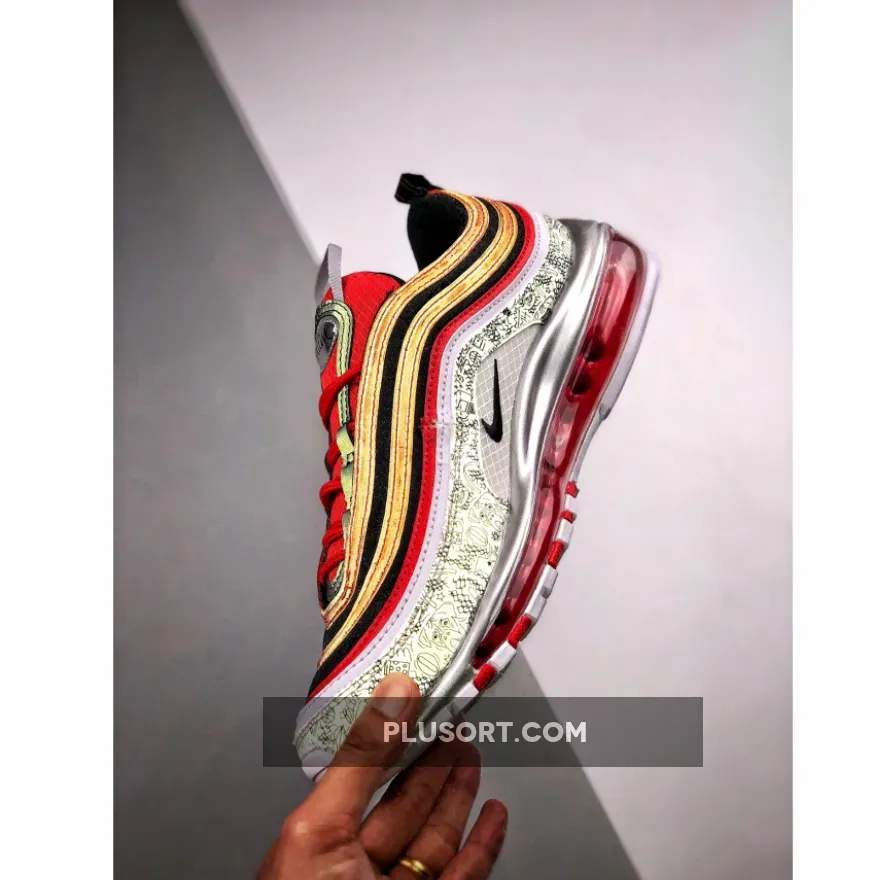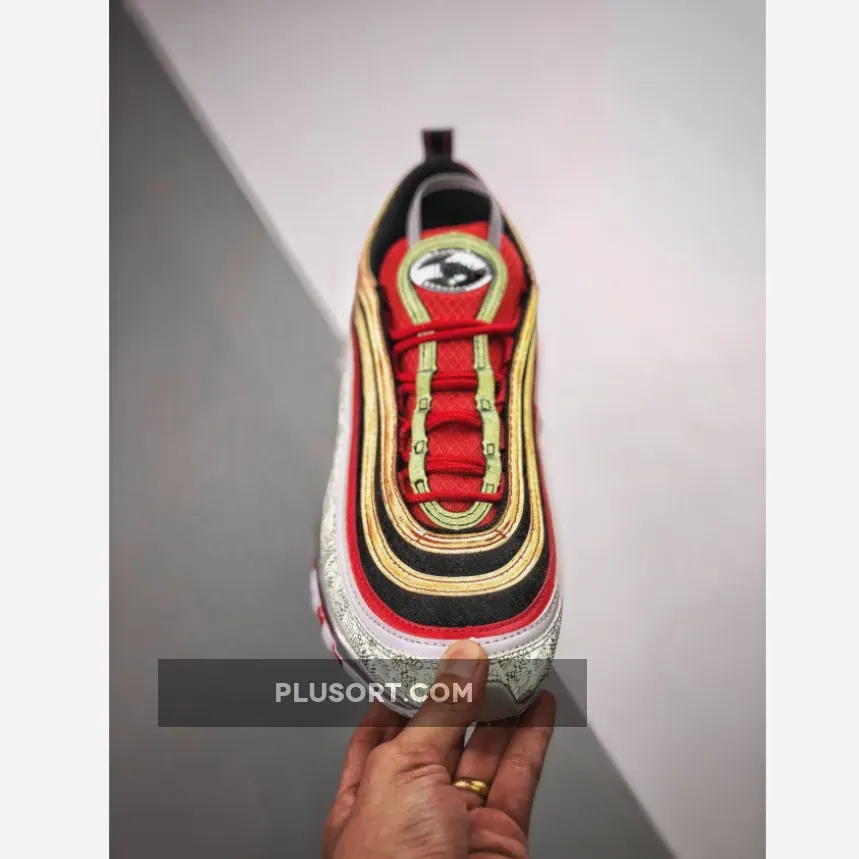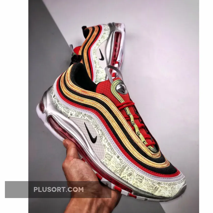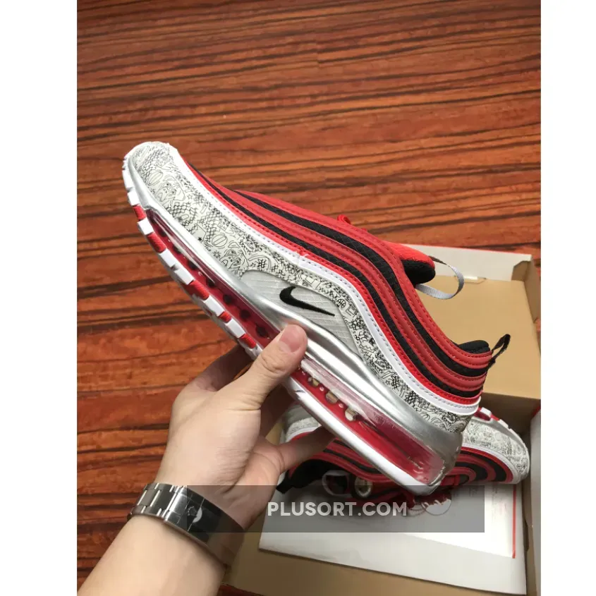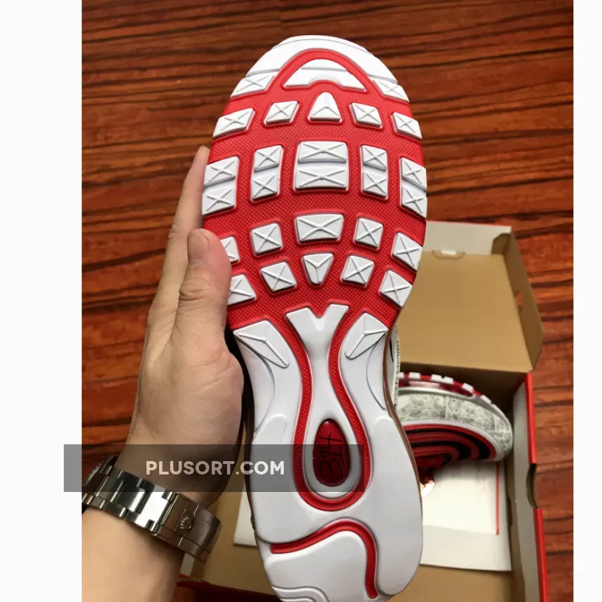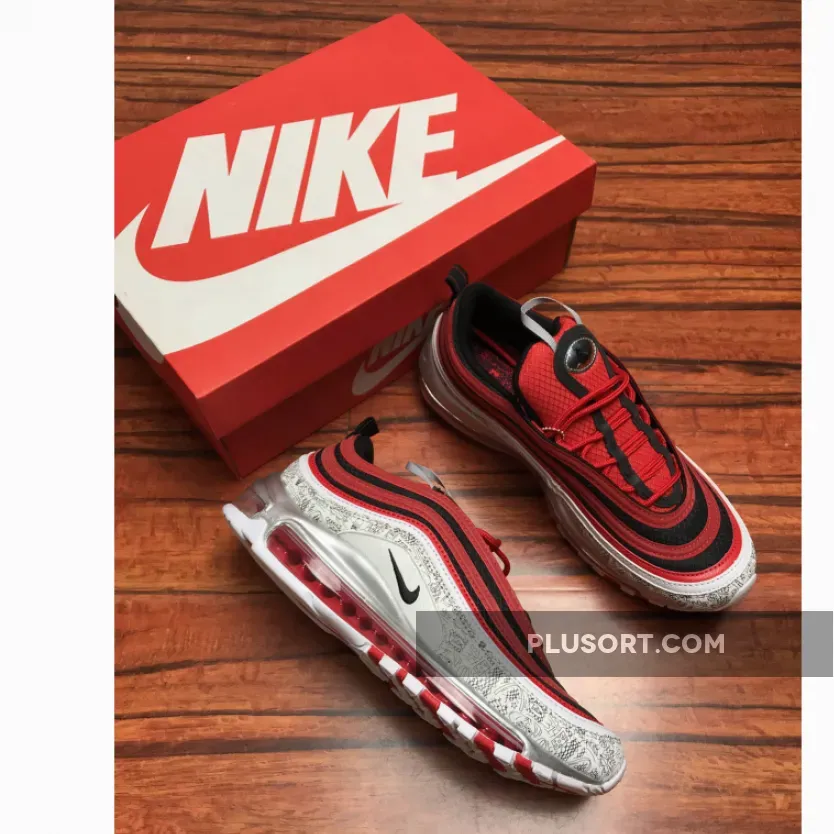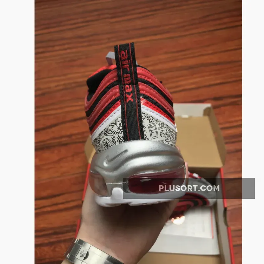 As a nod his high school, Chaminade College Preparatory School in Creve Coeur, Missouri, this Nike Air Max 97 comes dressed in the Red Devils colors. It features a Red and Black upper with basketball print displayed on its mudguard.