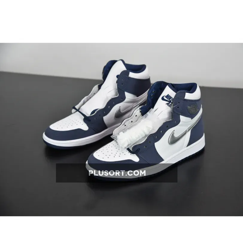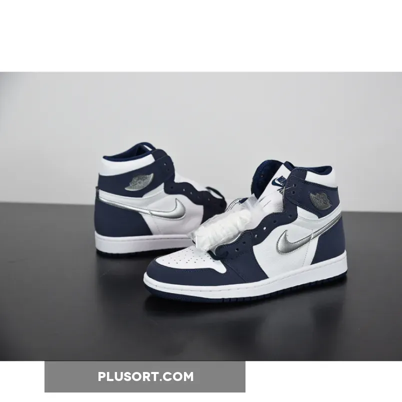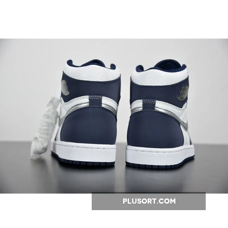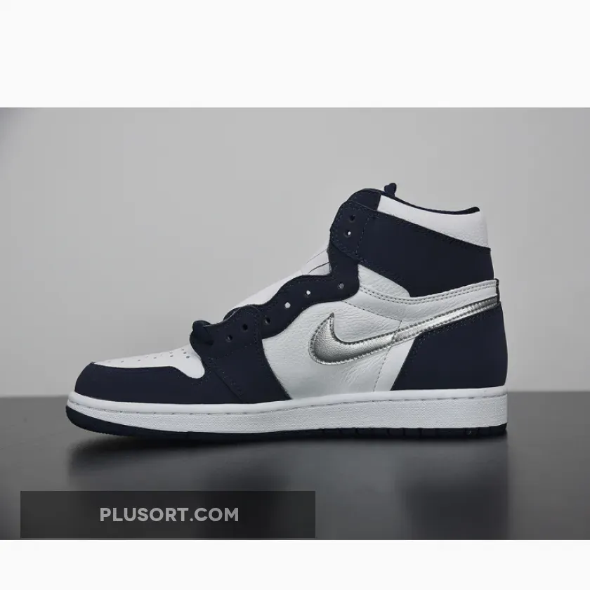 Dressed in a White, Midnight Navy, and Metallic Silver color scheme. This Air Jordan 1 looks similar to the original pair featuring a White leather upper with Navy overlays, Silver Swooshes and Wings logo. A White midsole atop a Navy rubber outsole completes the design.