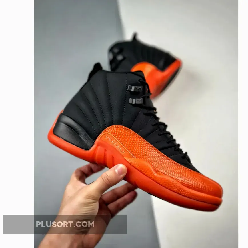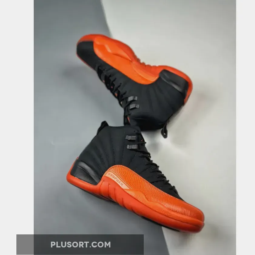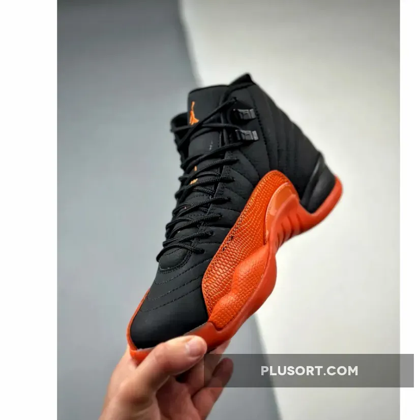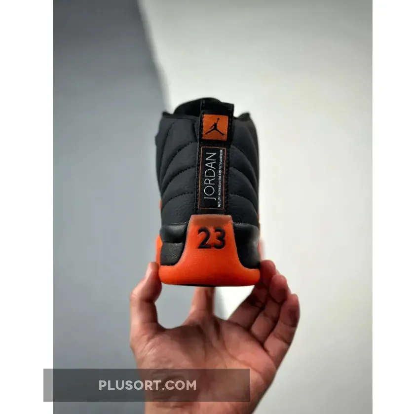 this exclusive colorway of the Air Jordan 12 features a Black tumbled leather upper and tongues with with matching metal upper eyelets, laces, inner lining, and rear pull tabs. The Brilliant Orange accents land on the mudguards, tongue and heel branding and rubber outsole. Finishing features include the Black traction underfoot and the White lettering on the heel pull tabs completes the design.