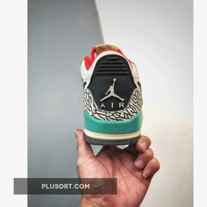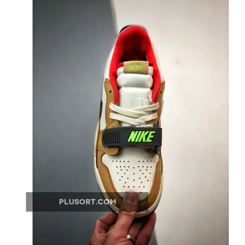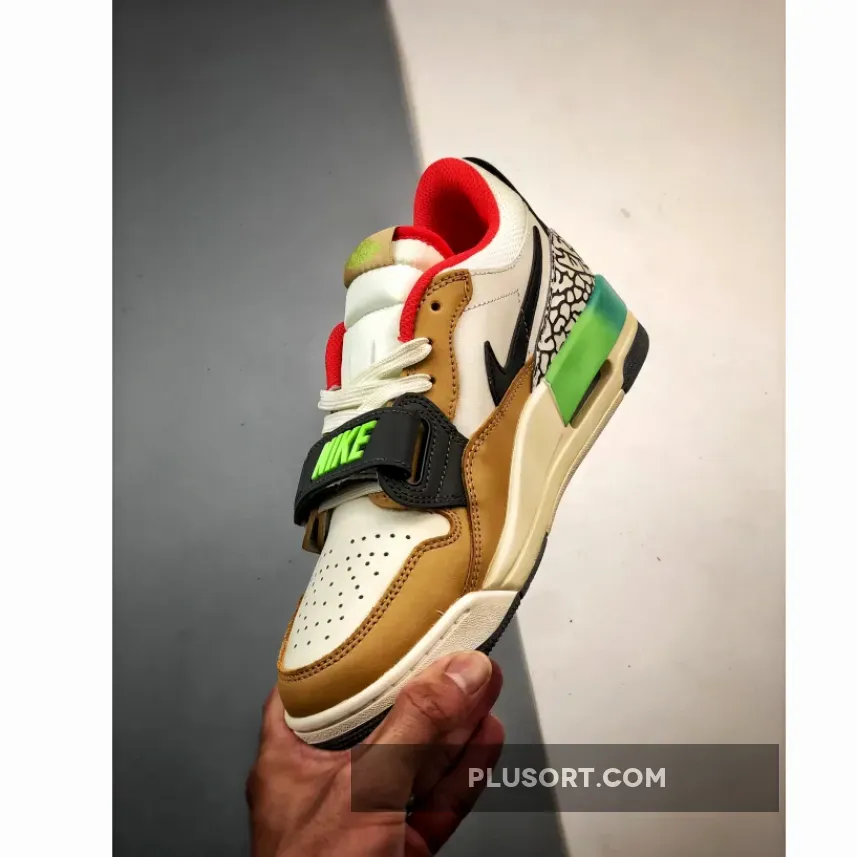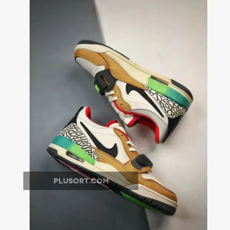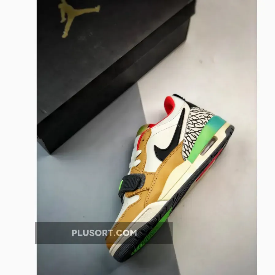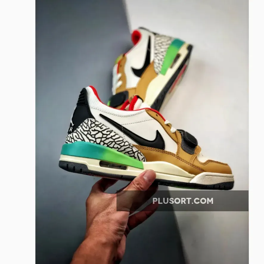 The Jordan Legacy 312 Low Gradient Multi inspires you to never hold back when it comes to showing off your eccentric style. This vibrant pair starts with a typical smooth white leather base with a classic black Swoosh and perforated toe. Adding an elegant touch are tan overlays that surround the toe, mudguard and eye stay areas. Meanwhile, the heel is decorated with the iconic “Elephant” print which goes well with bold orange-red accents at the padded collar and tongue. The finishing touch is a stylish teal and lime green TPU heel tab that also provides extra support.