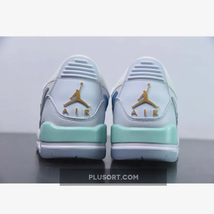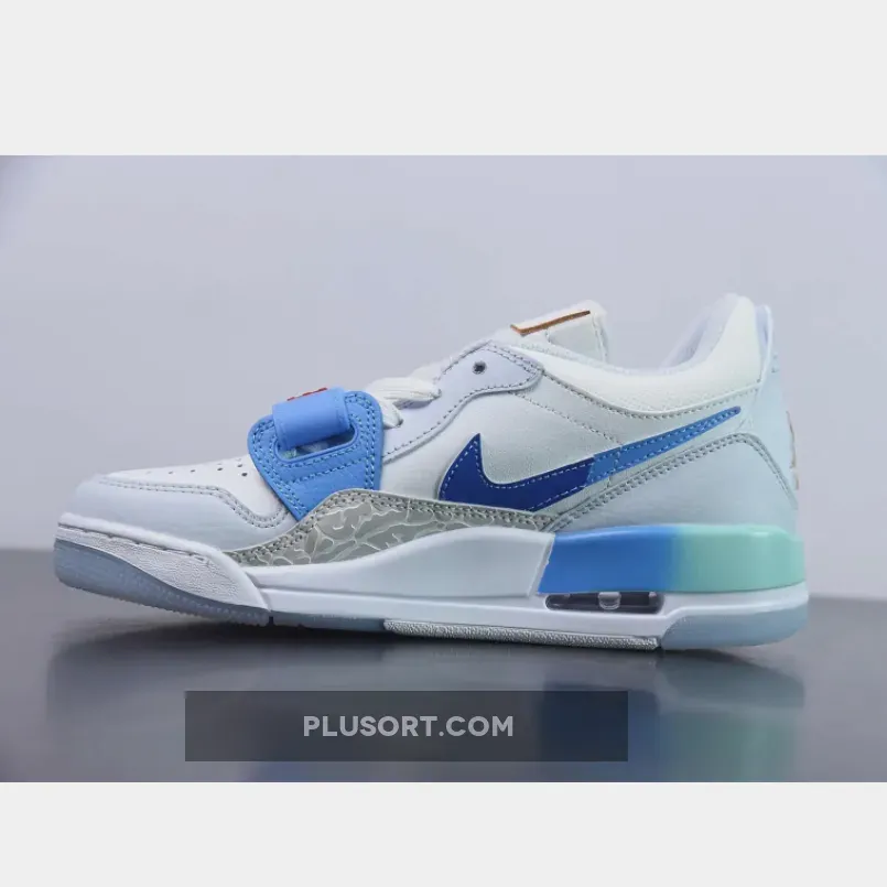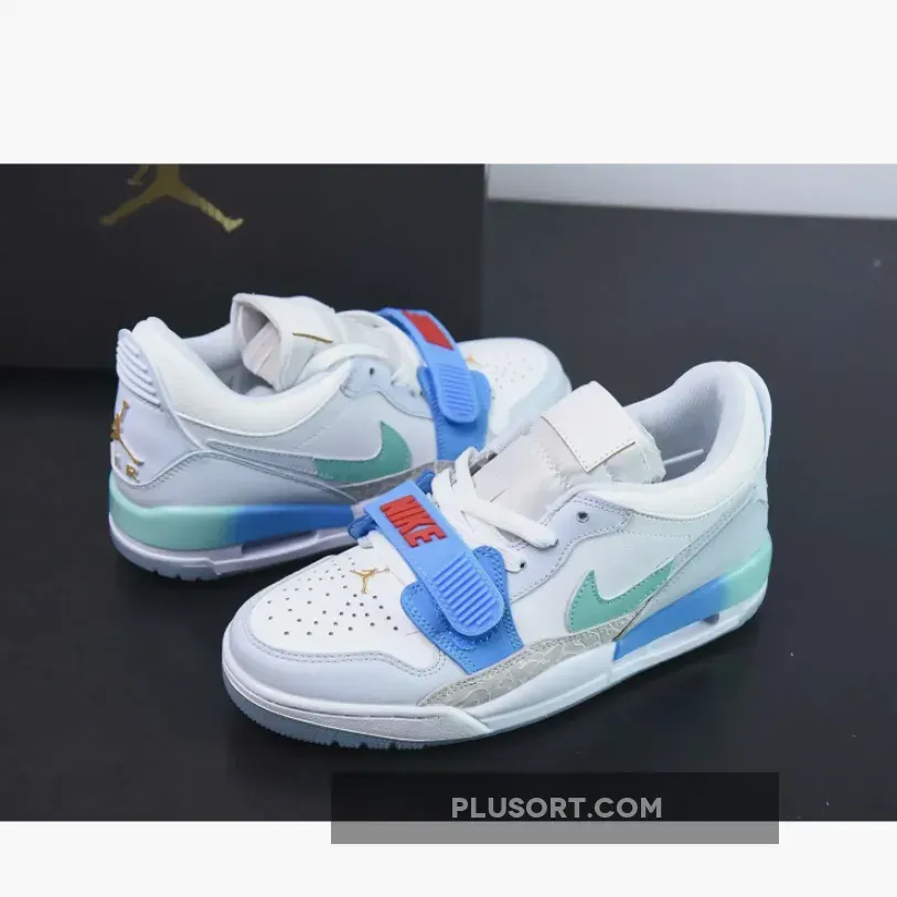 In this rendition, the Jordan Legacy 312 basks in summery splendor, featuring white leather uppers that serve as a pristine backdrop. The Swooshes boast a split-blocked design, a nod to the past, with captivating gradient midsole details that segue seamlessly into icy-translucent rubber outsoles.