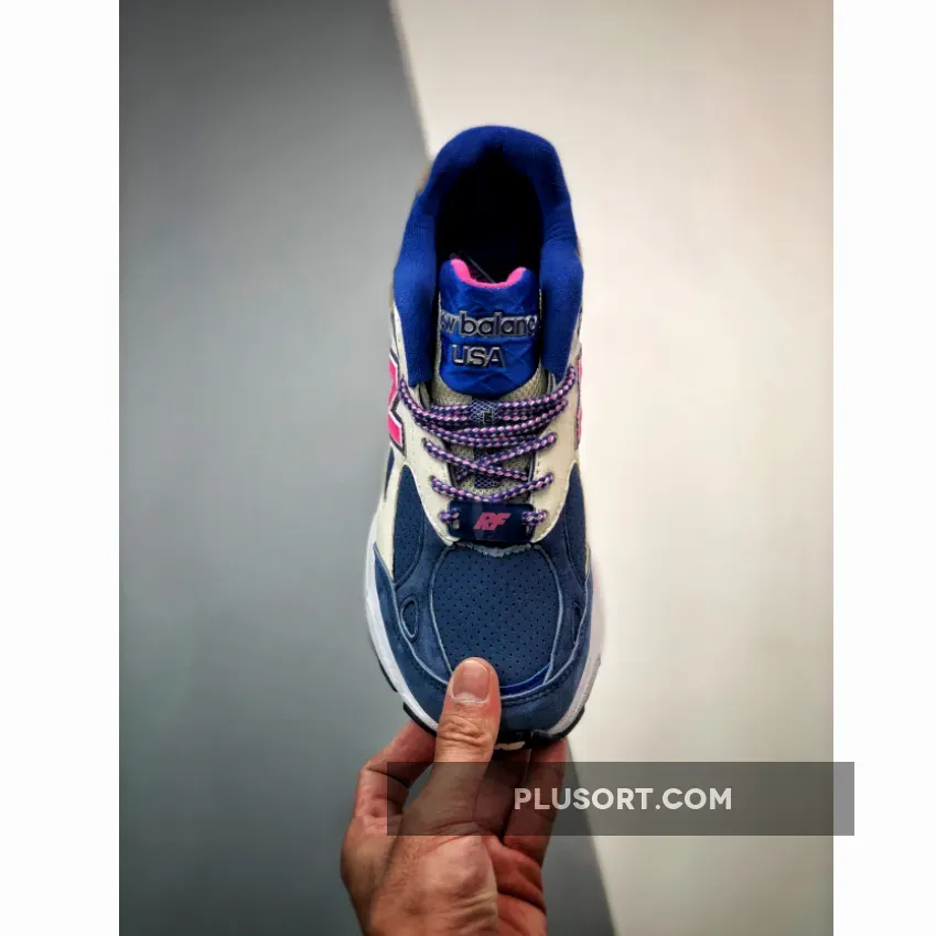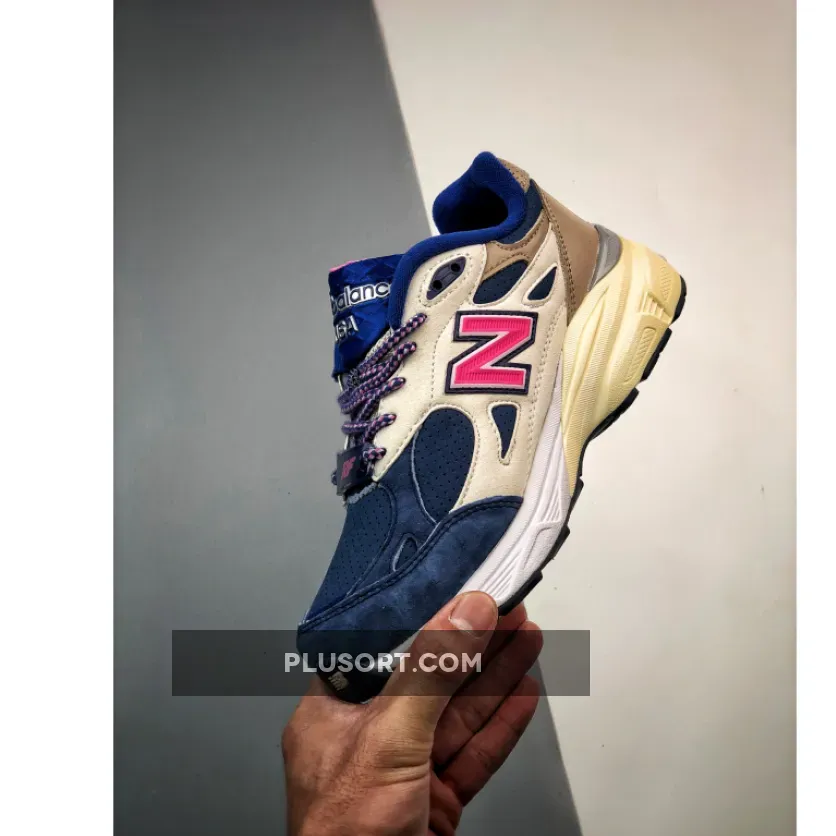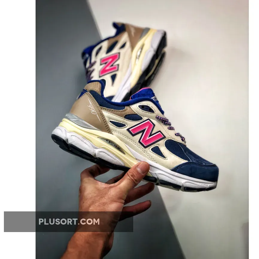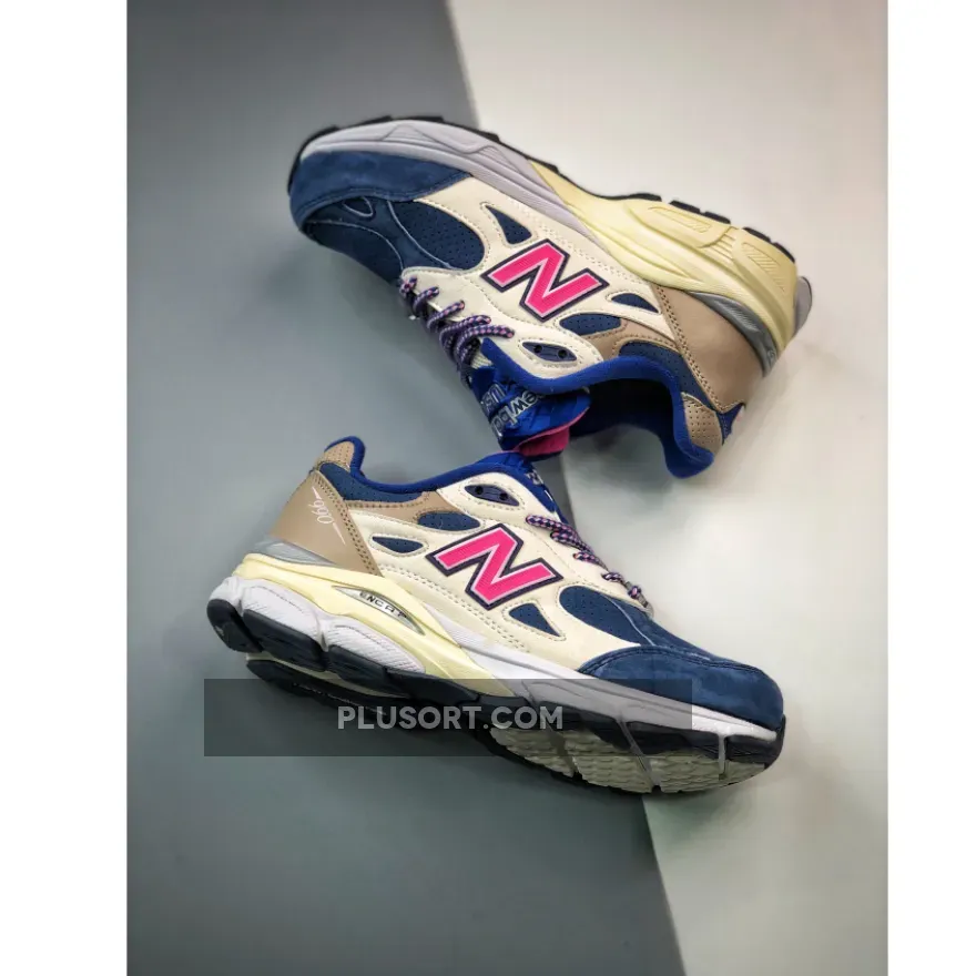 The KITH x New Balance 990v3 Daytona is a blue and pink iteration of the ever-popular 990’s third-edition sneaker. Constructed from a mixture of premium materials, this is one luxurious sneaker that balances the line between fashion and the ultimate dad sneaker trend.Brown leather on the heel houses the 990 branding, before melting into paler-coloured suede on the sidewalls. The large ‘N’ logo, first used by New Balance in the 1970s, comes in pink with navy piping, matching to the striped laces which tie the sneaker up. On the toe box, navy blue comes in suede, corresponding to the tongue.