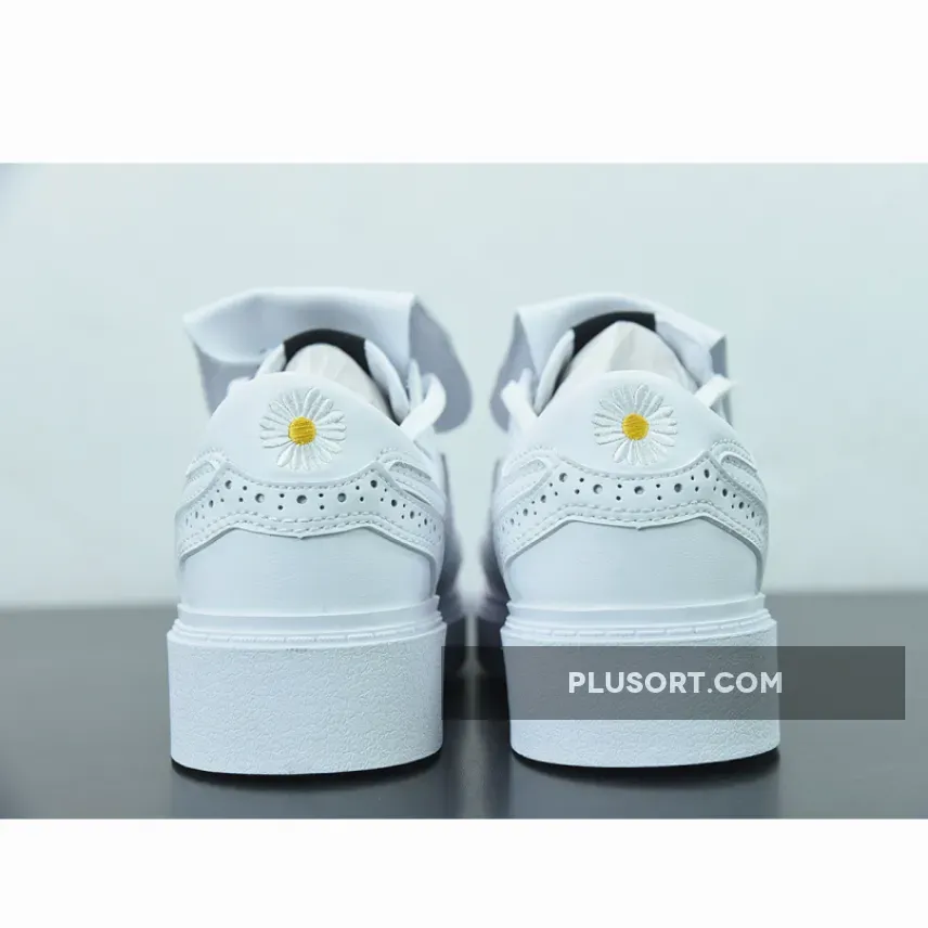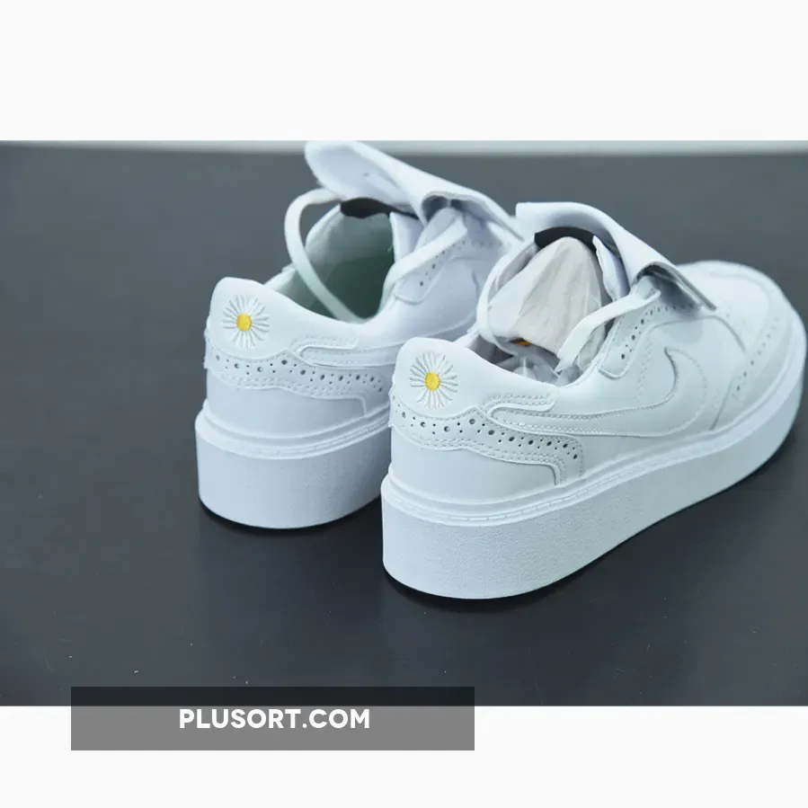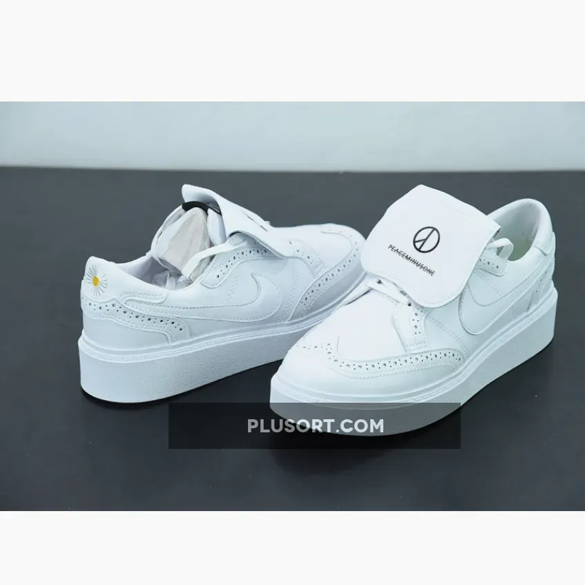 The model by G-Dragon will be under Peaceminusone label. One of the first color options to release comes highlighted with White leather. The pair also has intricate detailing around the heel with the Peaceminusone daisy logo. Finally, we have a golf wingflap-like overlay on the tongue.