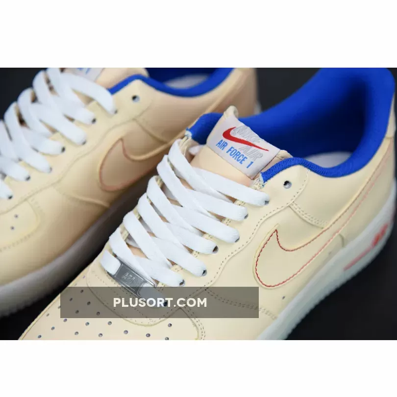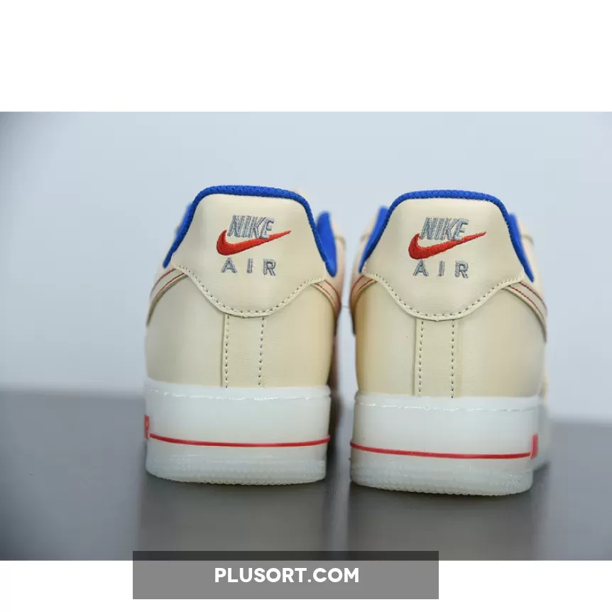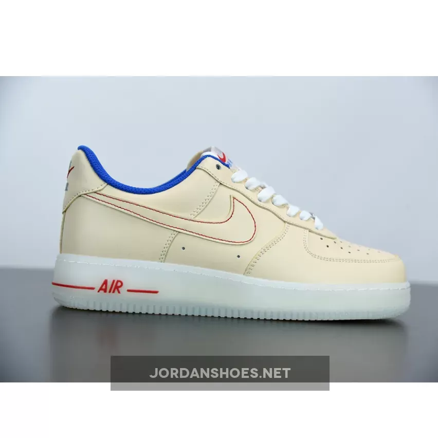 the pair quickly sets itself apart with a number of contrast threads. The swoosh, though cut from the same natural cream as the rest of the smooth leather construction, accents its edge with a bright red, a tone that also dresses the various branding seen at the barely see-through tooling below, the embroidery of the heel tab behind, and the tongue tab spaces above. Elsewhere, dark blues complement atop the lining while the lace and dubrae stick borrow from existing parts with white and silver metallic, respectively.