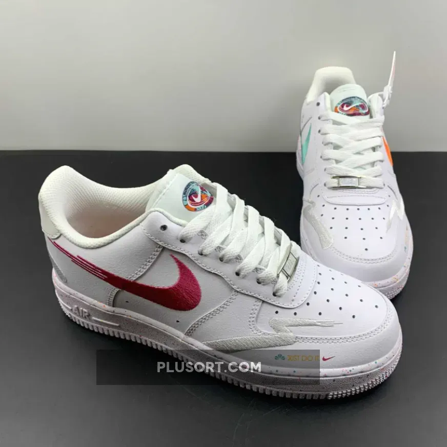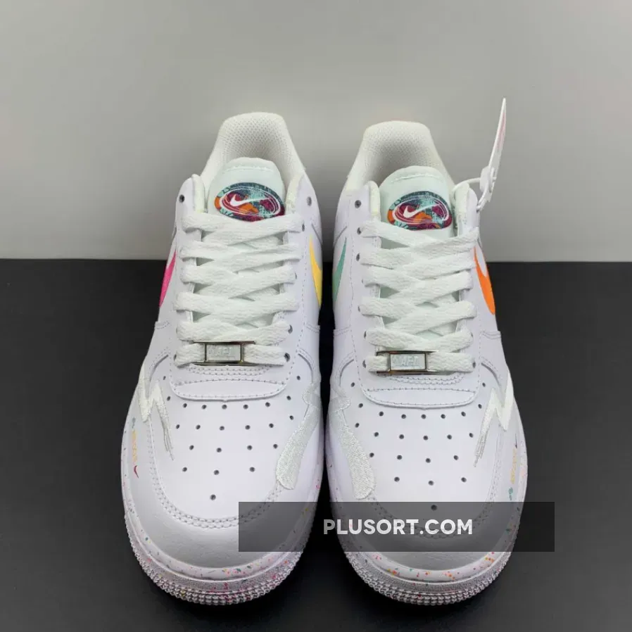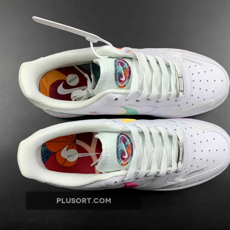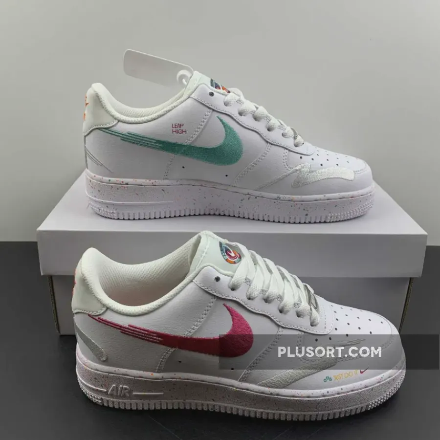 Central to a classic white-on-white construct, color is splayed across the pair in the form of embroidered Swooshes and silver streaks, flecked sole units, and written word — all of which focus on hues of orange, red, teal, and gold. The aforementioned patterns sit atop the tongue and insole, with marble-look dubraes rounding out the design.Finishing touches of this Nike Air Force 1 Low include the “Just Do It” detail on the forefoot and the metallic silver lace dubrae.