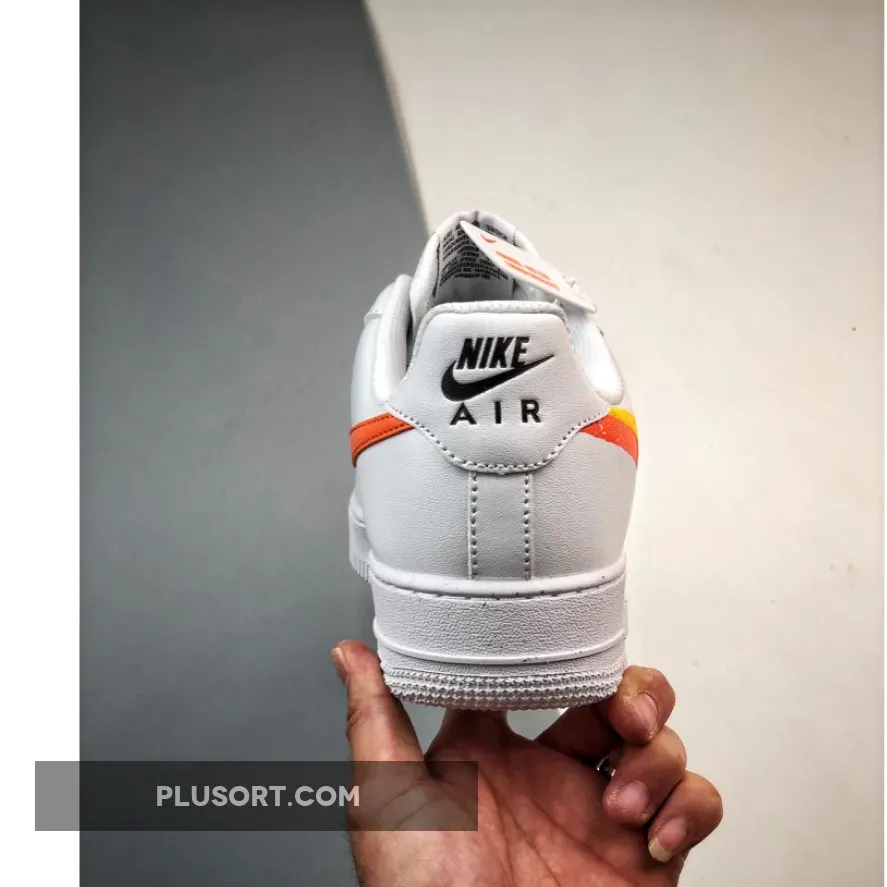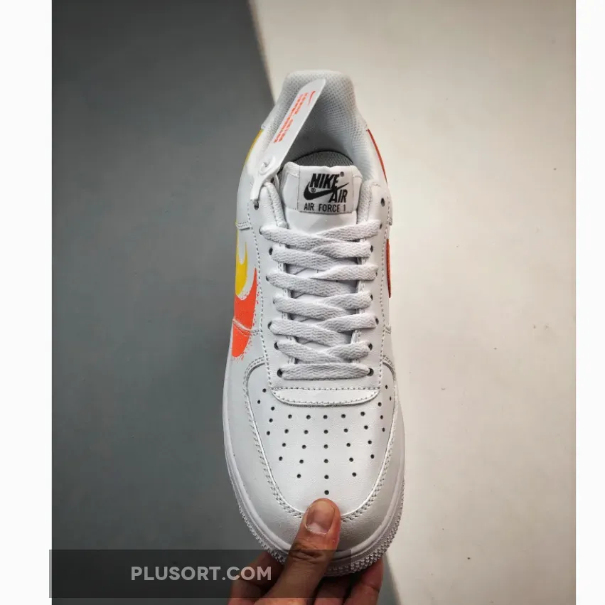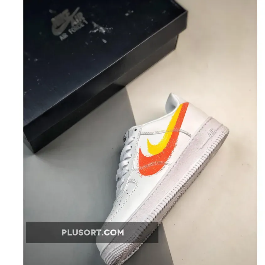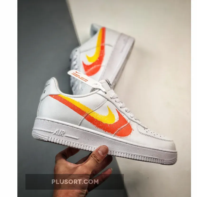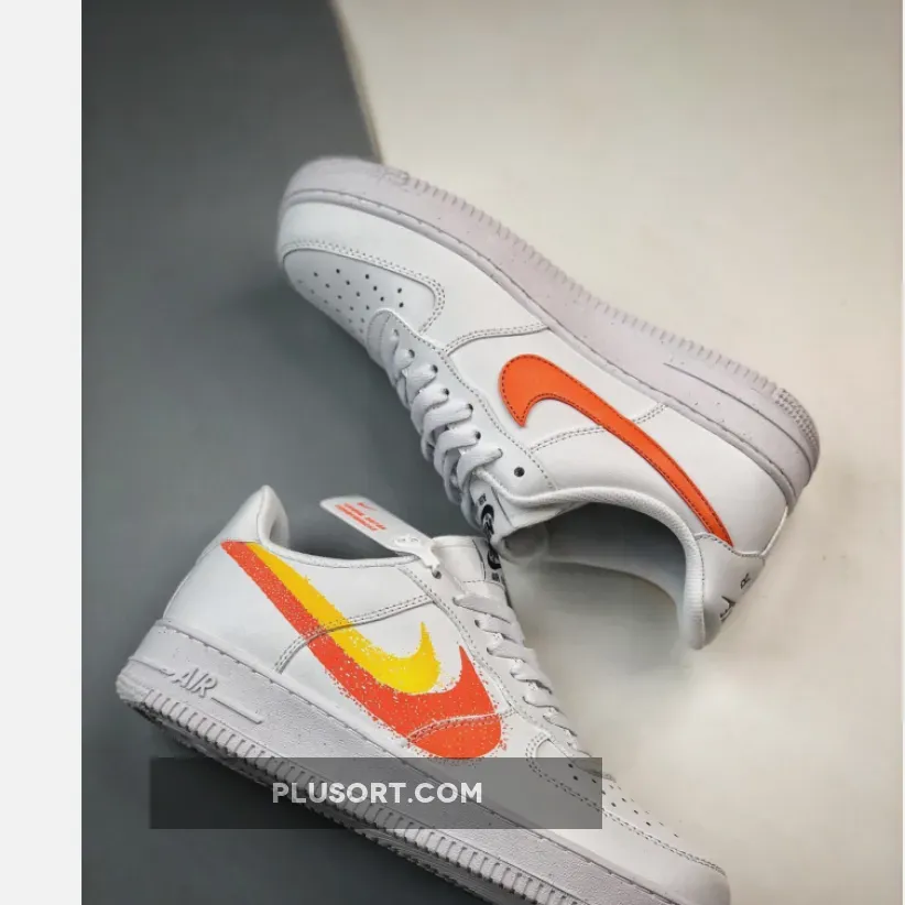 Nike’s basketball sneaker that first used Air technology, the Air Force 1, has a funky new version with street graffiti touch. Take a closer look at the Nike Air Force 1 Low Spray Paint Swoosh White. This low-top AF1 double spray painted Swooshes, the lower one in orange and the upper one in yellow, streaking across the smooth white leather medial and lateral mid-panels. Signature Nike Air branding in black on the tongue tabs, the heel tabs and the insoles create contrast against the all-white background. The nylon tongues and mesh sock liners are all pure white as well.