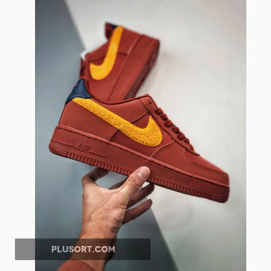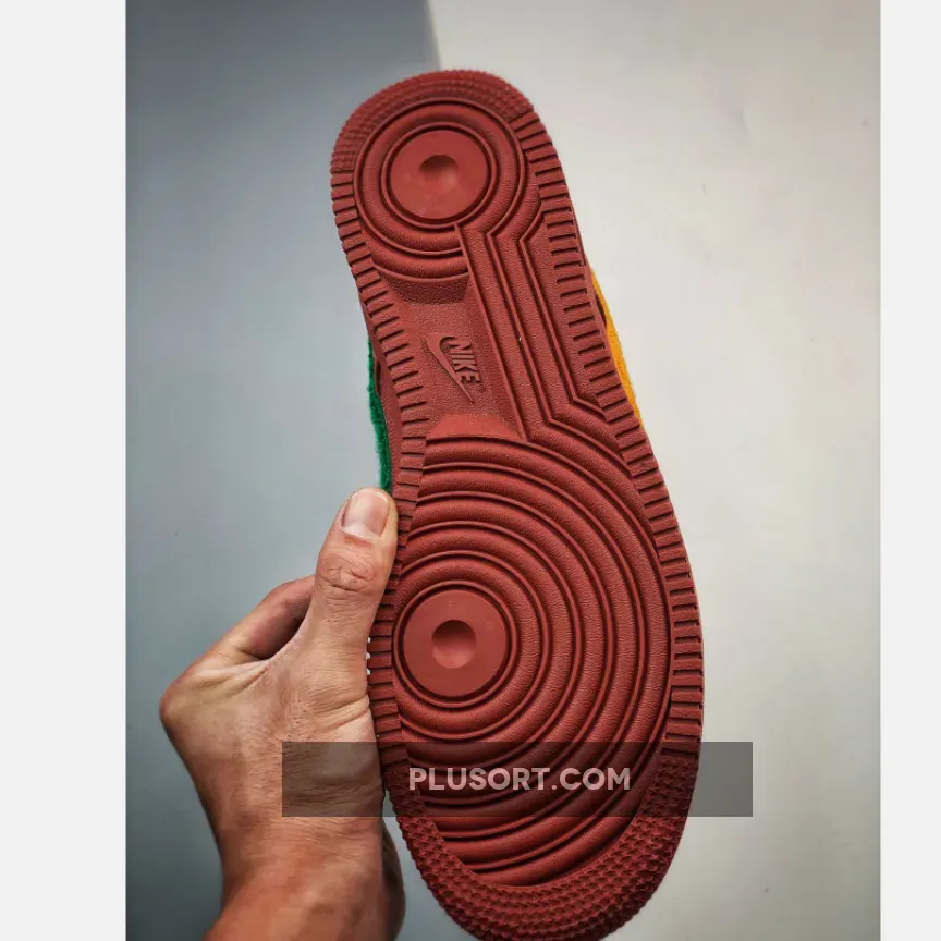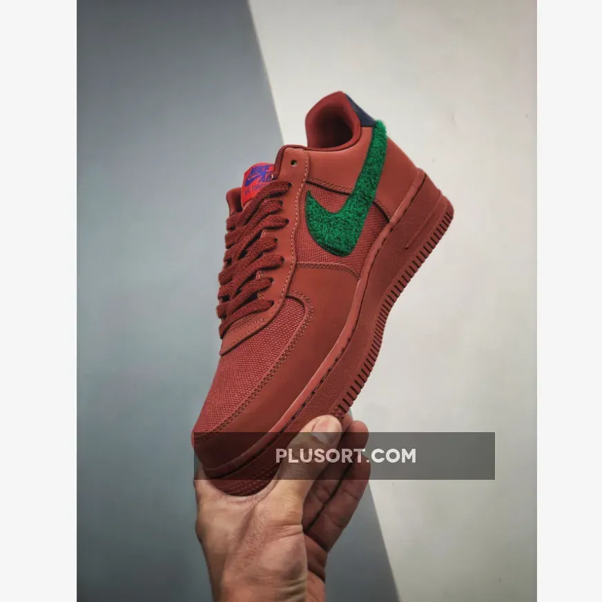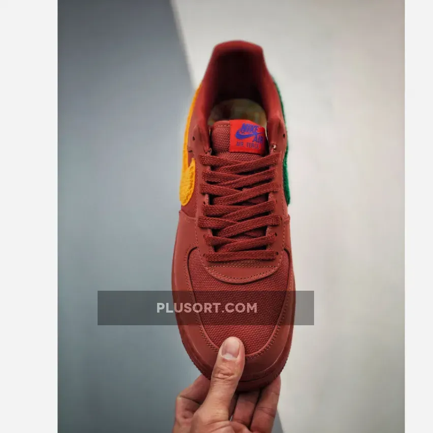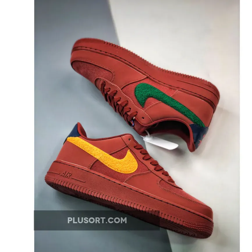 This AF1 has a deep clay brown upper, canvas for the base and suede for the overlays on the toe box, the eye stay panel and the foxing. Cosily furry chenille signature profile Swooshes in golden yellow stand out on the lateral mid-panels. This same material is used for the Swooshes on the medial side but in bright leaf green. The cracked leather heel tabs are in dark indigo blue creating a contrast with the red Nike branding. The mismatched tongue tabs feature traditional Nike Air branding in blue against a red background on the right shoe while the left shoe is adorned by the “We Are Familia” colourful logo with an embroidered blue border.