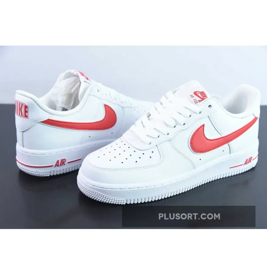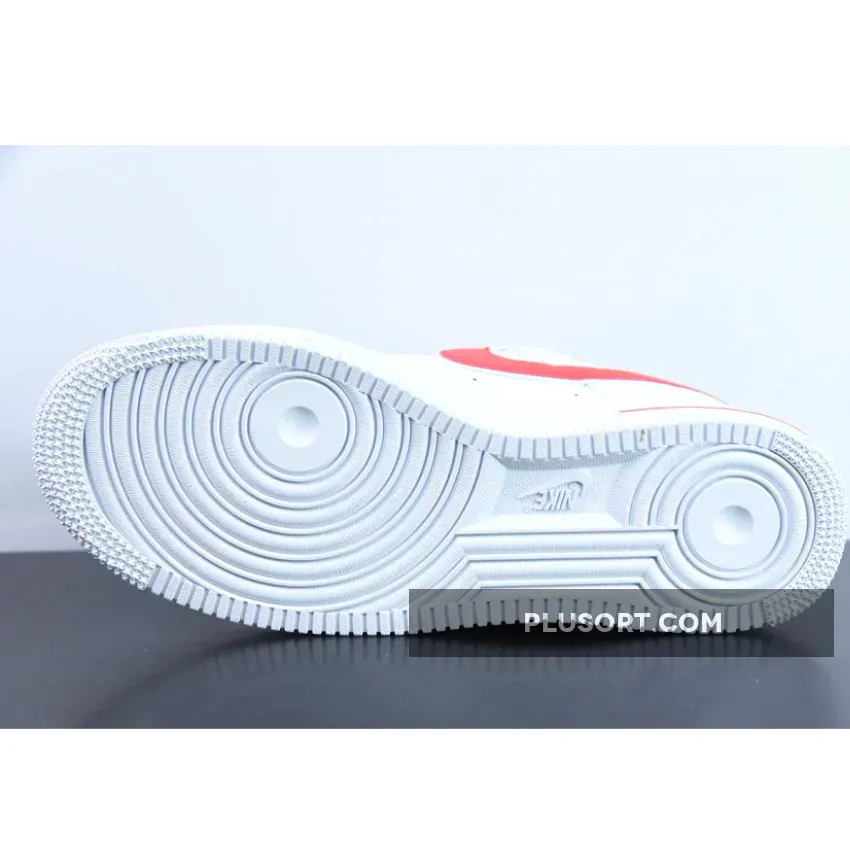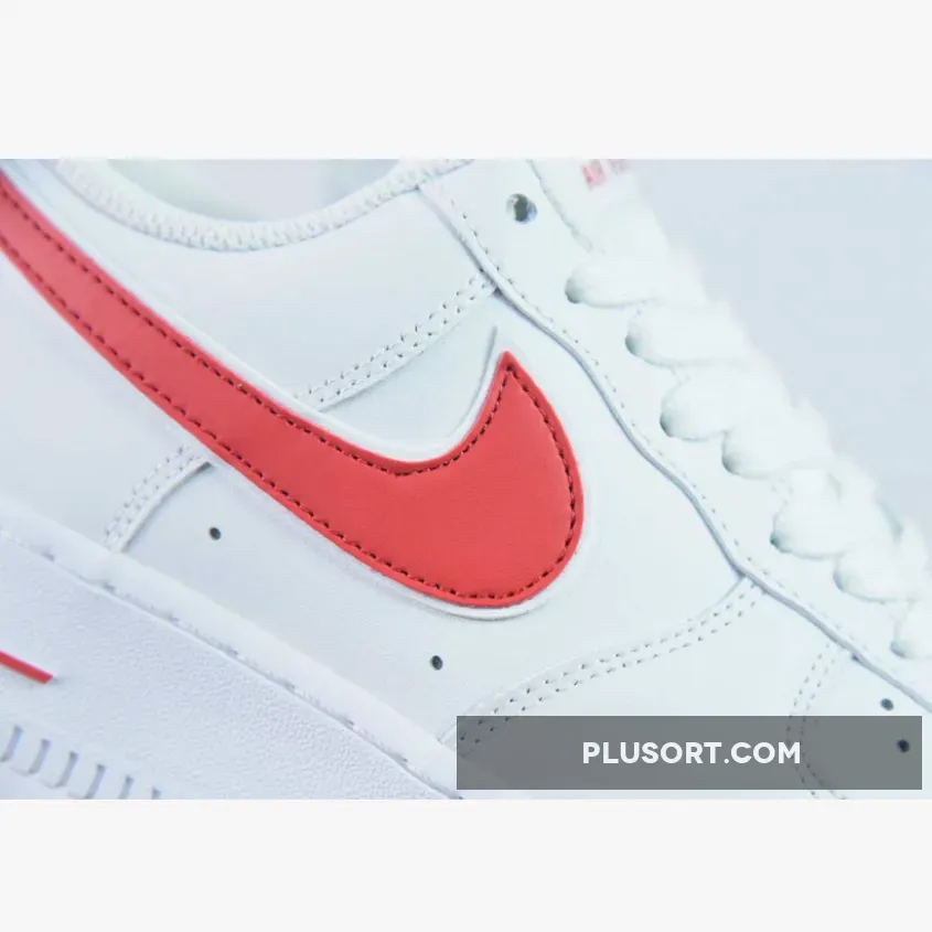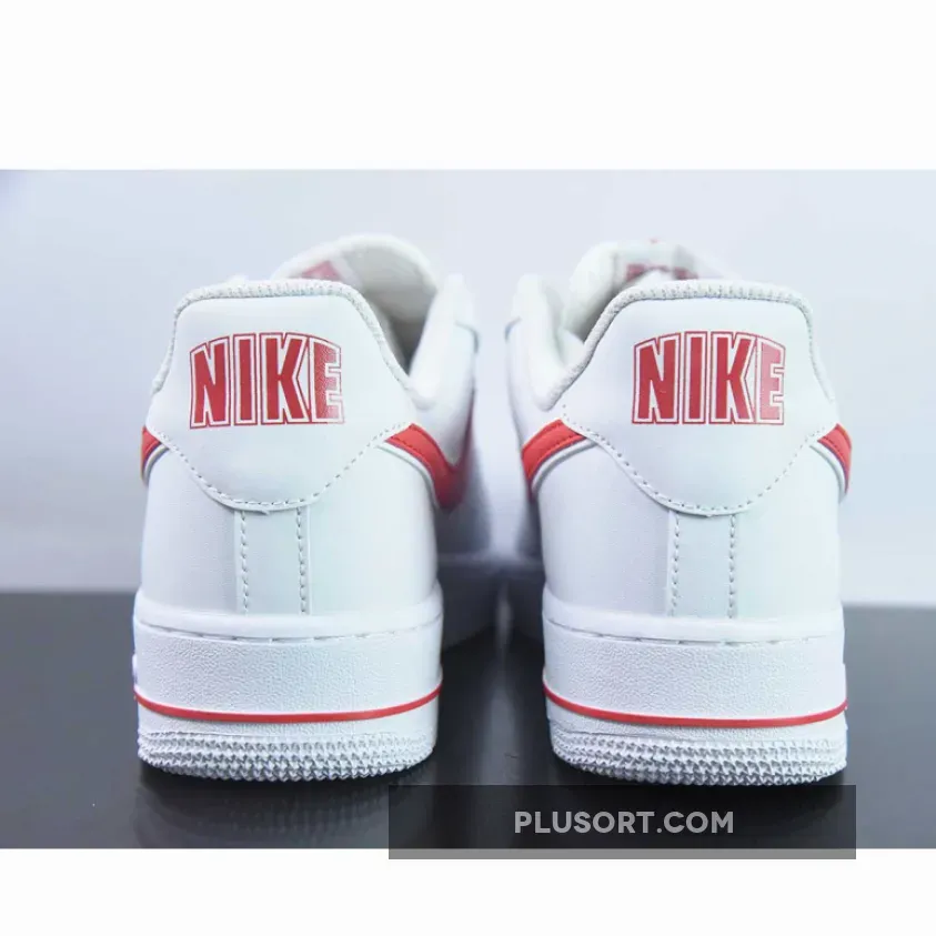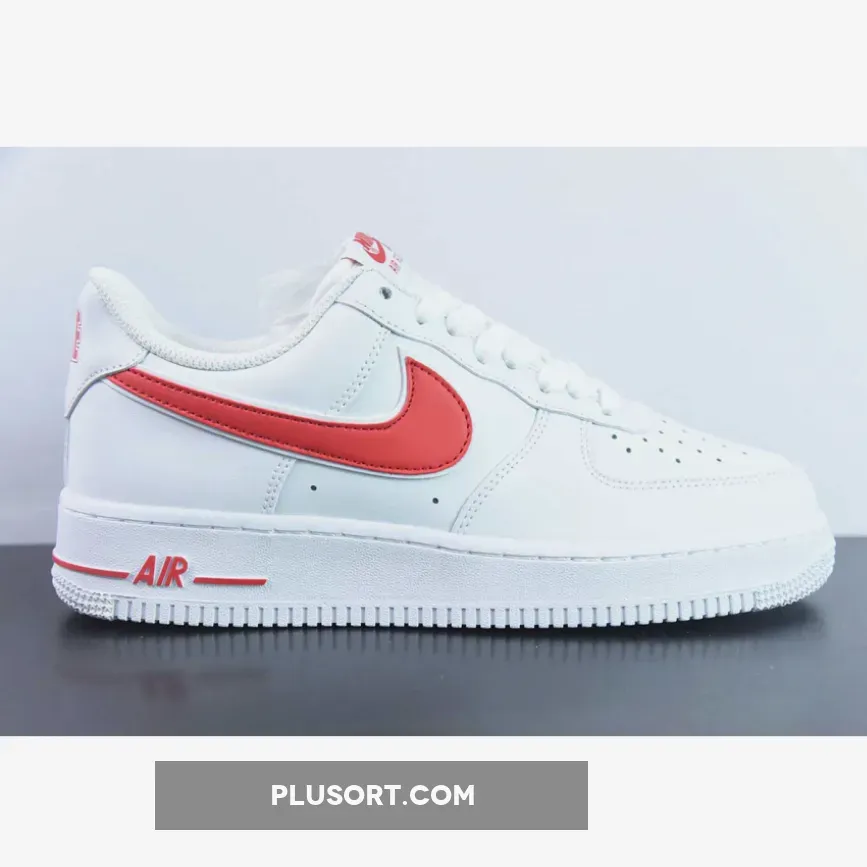 The Nike Air Force 1 Low White Gym Red has a clean white leather upper and chunky rubber midsole with red highlights on the Swoosh and a single line running across the heel. The red also appears on the Nike Air label located on the tongue as well as the ‘NIKE’ label above the heel.