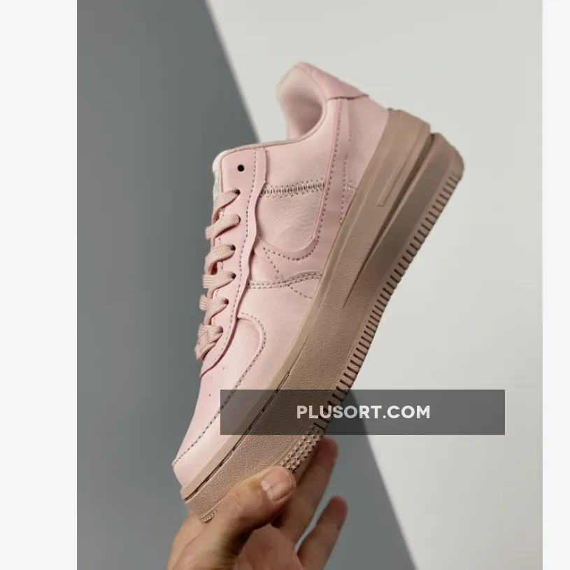 The Bruce Kilgore-designed Nike Air Force 1 is rolling out a charming all-pink colourway under its platform series. Introducing the Nike Air Force 1 PLT.AF.ORM Pink. This AF1 takes on a tonal look, reinforcing a delightful bubblegum pink all throughout the smooth and tumbled leather upper of the shoe. The embroidered Nike Air branding on the all-pink tongue is a slightly lighter pink compared to the rest of the upper. This embroidered branding is echoed on the smooth leather heel tabs. The lateral side of the shoe features a double Swoosh, one cut-out followed by the usual stitched-on Swoosh. The pink metal lace deubrés feature a rectangular grey outline around a mini Swoosh.Bag the Nike Air Force 1 PLT.