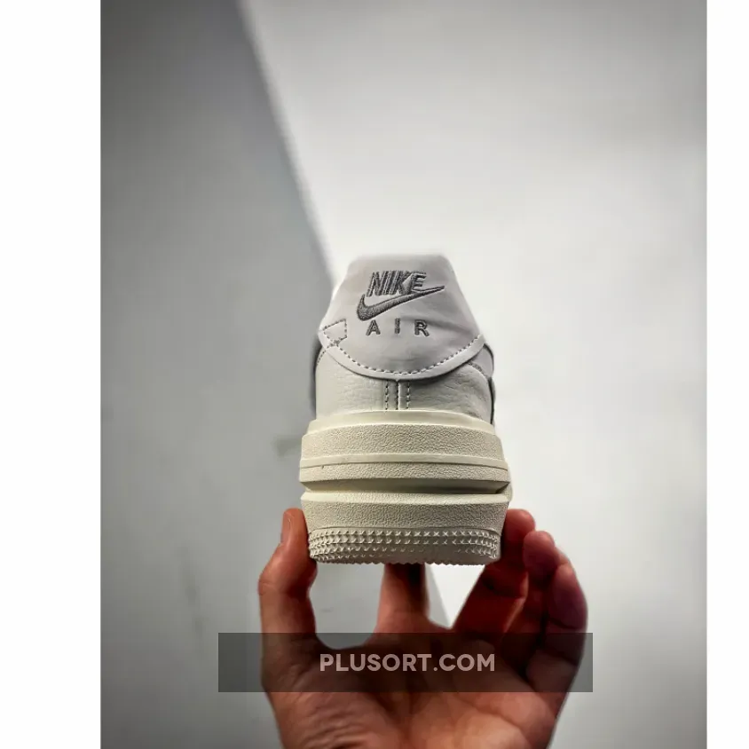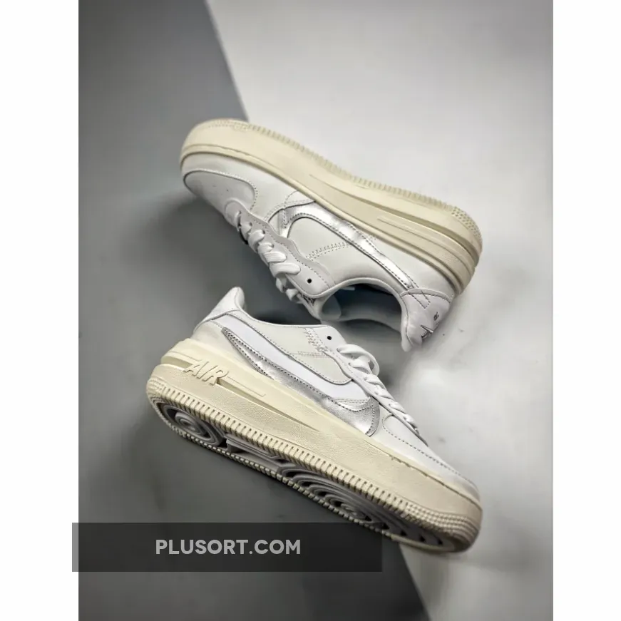 The Nike Air Force 1 literally reaches new heights with its towering platform line. One of its latest variants is an all-white ensemble with a metallic touch. Introducing the Nike Air Force 1 PLT.AF.ORM White Grey. This AF1 looks like it has an all-white smooth and pebbled leather upper. The only exception is the bright flash of metallic silver on the Swooshes on both sides of the shoe. Similar to other PLT.ORM iterations, another subtle Swoosh can be found right above the silver Swoosh, a cutout revealing smooth leather beneath. Silver grey repeats on the embroidered Nike Air Branding on both the tongue and the heel tab. A metallic silver lace deubré adorns the laces. Grab the Nike Air Force 1 PLT.