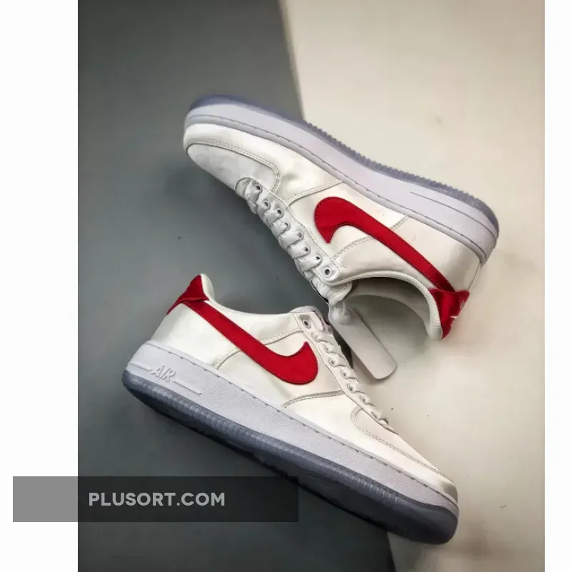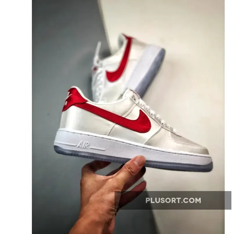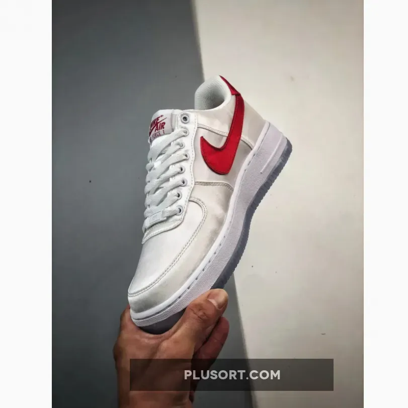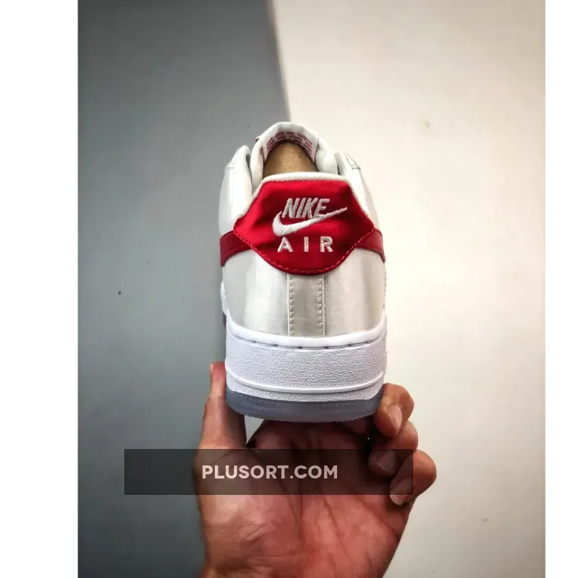 Clean design meets luxurious vibes in this Air Force 1 Low Satin. Satin & red accents elevate the classic silhouette for a modern twist. #NikeAF1Low #SneakerGoals