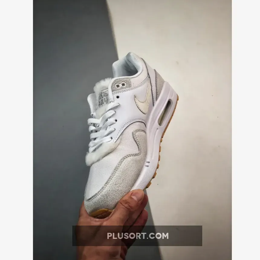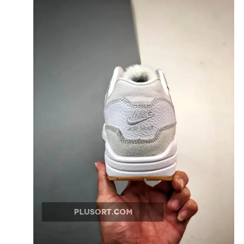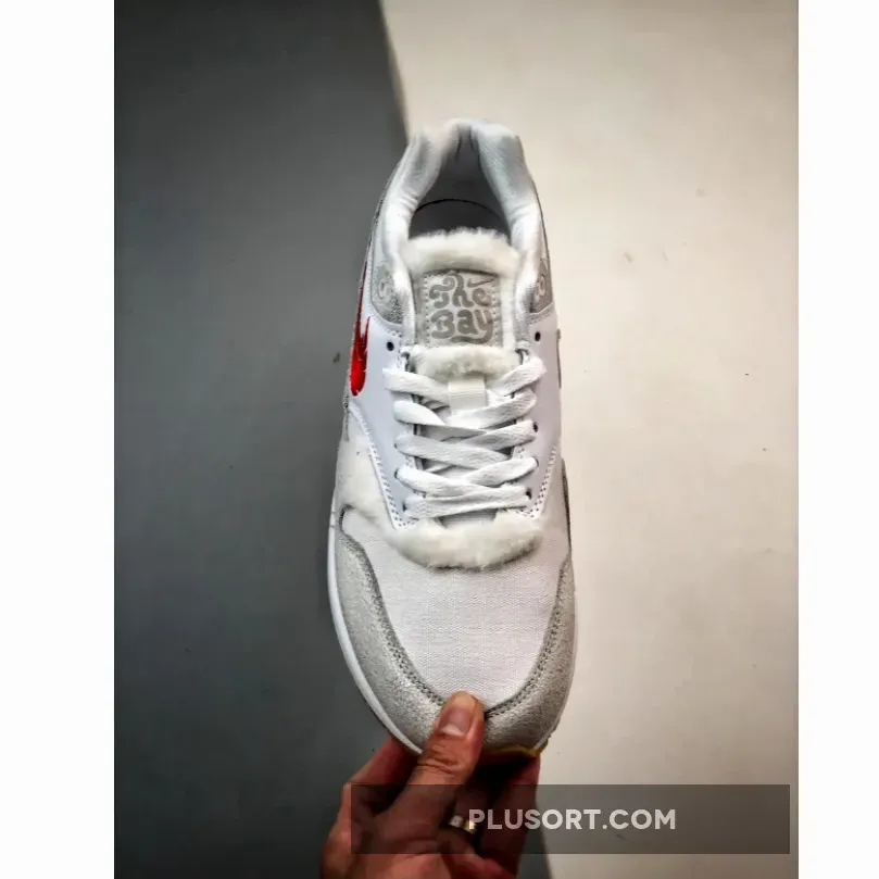the Nike Air Max 1 “The Bay” features a predominately white leather construction paired with grey suede overlays on the toe, mudguard, and top lacestay.