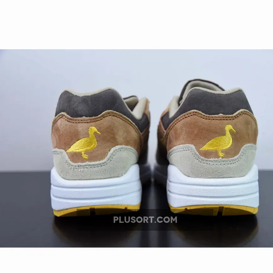 A closer look shows the pair with suede panelling, giving the lifestyle shoe a premium appearance. In terms of colour arrangement, this Air Max 1 sees Baroque Brown, Pecan, and Yellow Ochre. “Yellow Ochre” accents are then drizzled over the Swooshes, laces, tongue branding and duck silhouettes, the latter of which are embroidered into the heel to replace the usual Nike branding. White midsoles and yellow rubber outsoles finish off the look on this Nike Air Max 1
