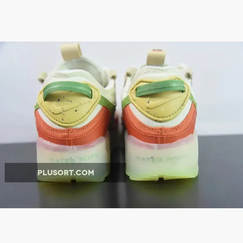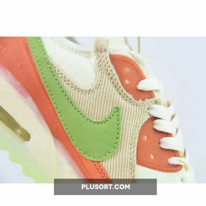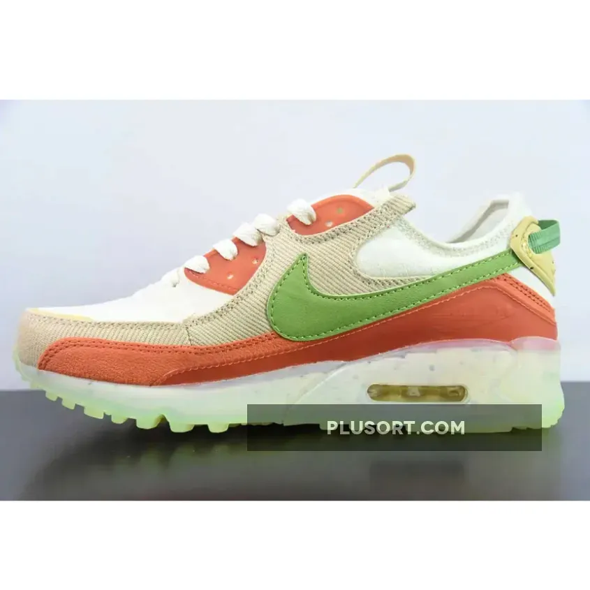 this Nike Air Max 90 Terrascape arrives in a mix of Orange and Green color tones. The light neutral textiles, playin’ with shades of tan, wrap your feet in a cloud of comfort. It’s like walking on a bed of moss, hiking through lush greenery wherever you go. Constructed out of the aforementioned recycled fabrics and materials, design details include the “Terrascape” branding on the tongue pull tabs and insoles atop a semi-translucent Crater Foam midsole and Nike Grind speckled outsole.