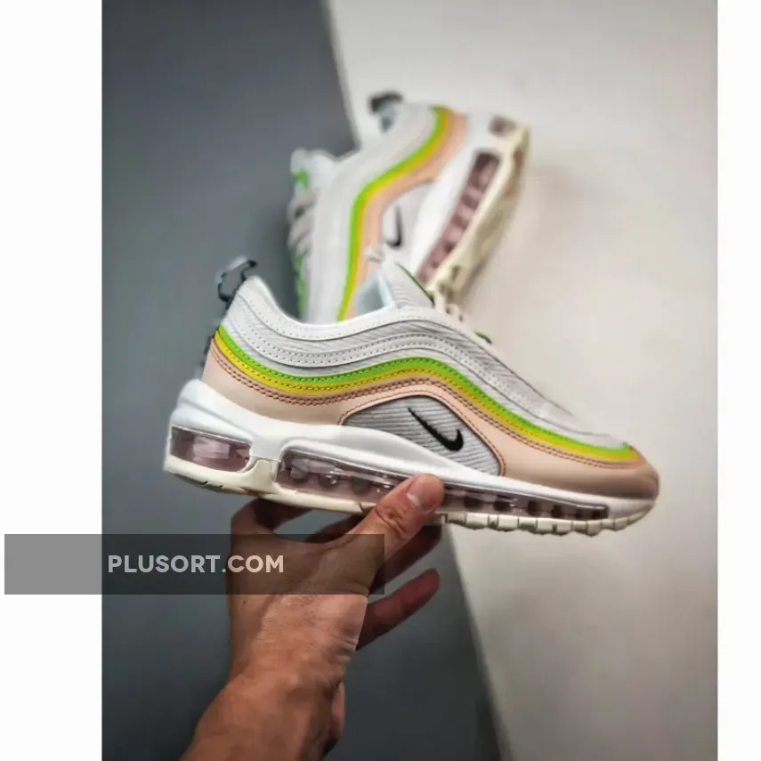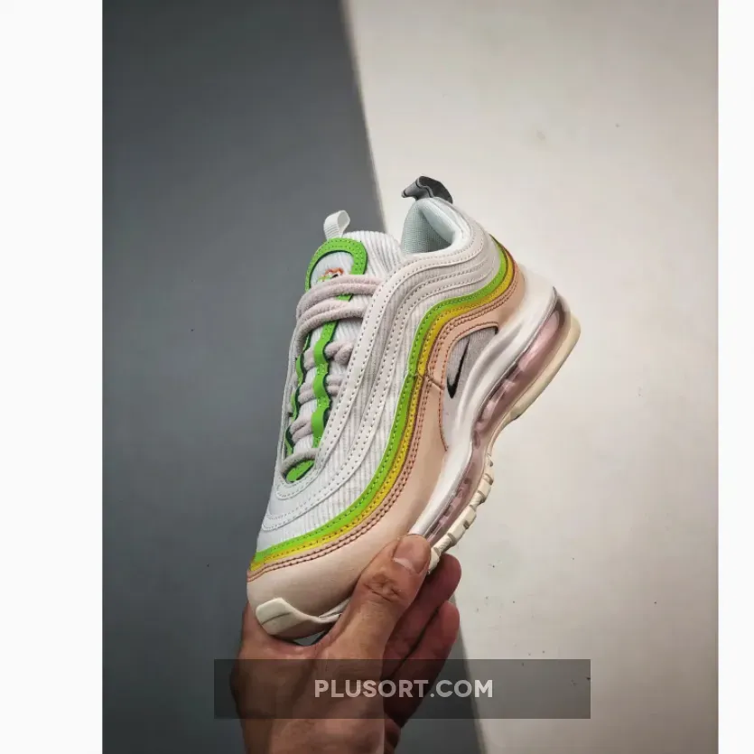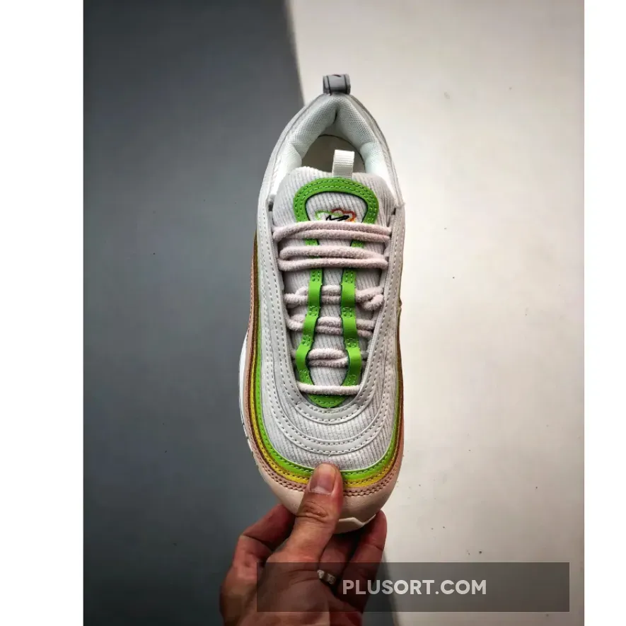 Celebrating its 25th year, Nike’s Christian Tresser-designed performance running silhouette, the Air Max 97, has a new love-themed release with vibrant, positive colours. Meet the Nike Air Max 97 Feel Love. This AM97 has a “White / Black / Pearl Pink / Action Green / Opti Yellow / Sail” colour scheme. The upper swaps out the usual mesh with a unique White corduroy. The wraparound wave design features bright White, Action Green and Opti Yellow, some of the panels with 3M reflective finish, while the bottom-most mudguard layer is subtle Pearl Pink. To emphasise the “Feel Love” theme, interlocking green, yellow and peach hearts can be found on the tongue tab and the insoles.