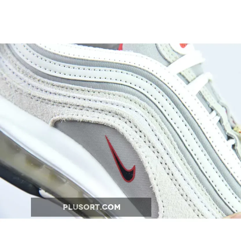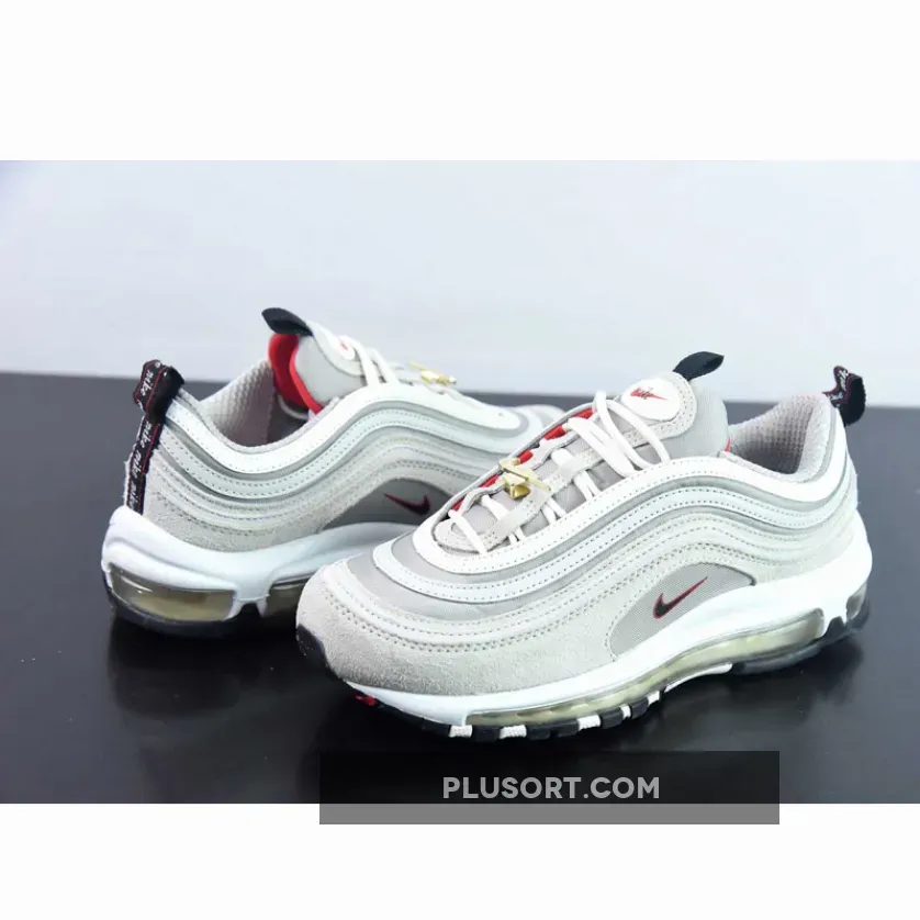 The first layer on the upper is a fuzzy off-white suede wrapping the shoe from heel to toe. This layer alternates with beige and bone-coloured nylon and suede on the signature wavy design of the Air Max 97. The “First Use June 18, 1971” text is featured on the mid-panel window on the medial side. The lateral mid-panel window shows off a mini Swoosh in black with a red outline. The pair also has retro branding on the tongue tab and heel pull tab. The full-length Air unit that has been a feature of the Air Max 97 since its introduction in 1997 remains simple in a clear cassette and white construction. A bejewelled gold deubre finishes the look.