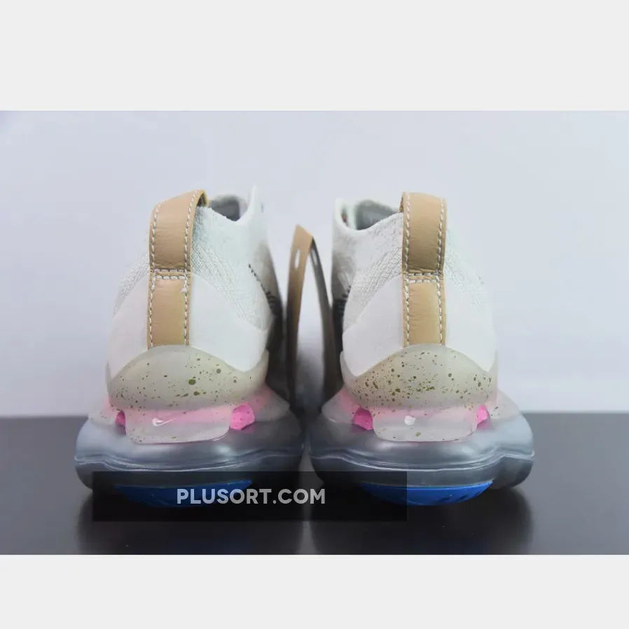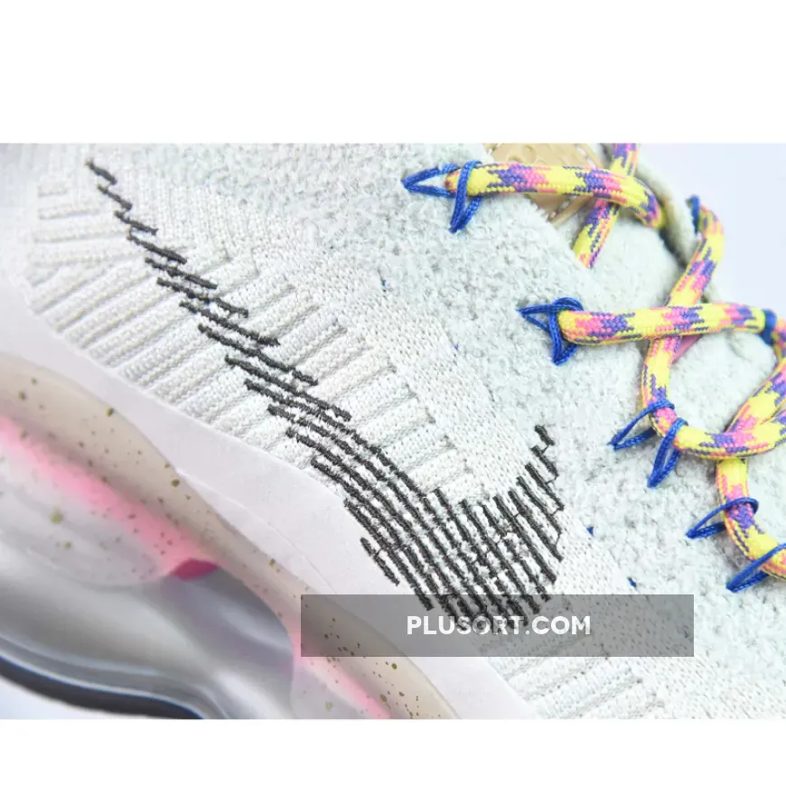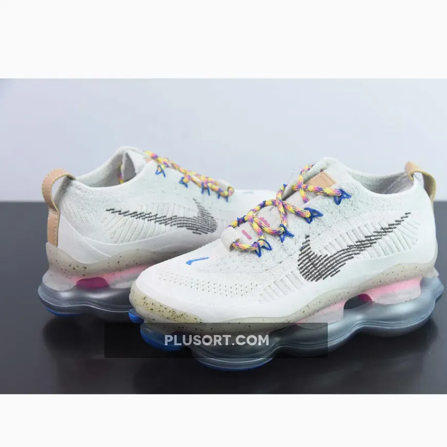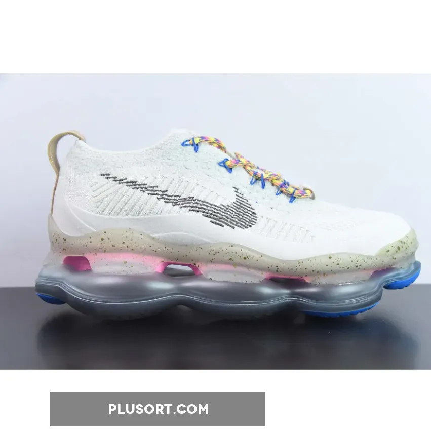 The Nike Air Max Scorpion Hiking features an Off-White colored Flyknit upper with stitched Swoosh logos on the side panels. Adding some color to the design are the Yellow, Pink and Purple-colored rope laces. Elsewhere you will find includes Yellow. Pink, and Purple-colored rope laces, Tan leather tongue labels and heel pull tabs, Blue mini Swooshes on the toe with Nike “Just Do It” branded insoles.