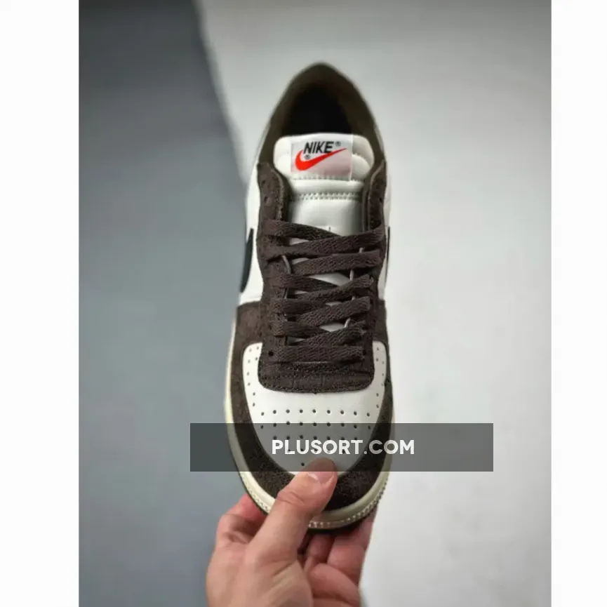 Nike’s signature basketball shoe designed for the Georgetown Hoyas in 1985, the Terminator, has a fresh variant with a faux reptilian accent. Take a closer look at the Nike Terminator Low “Brown Croc”.This low-cut Terminator has a crisp white leather base. The suede overlays on the toe cap, the mudguard, the eye stay panels and the heel tabs are in a dark chocolate brown with the titular “croc” skin finish. The laces and the mesh sock liner are also chocolate brown. The signature profile Swooshes across both the medial and lateral quarter panels are smooth black leather. Classic Nike branding with a red Swoosh can be found on the white tongue tabs whilst oversized Nike text branding is printed in black on the white heel counters.