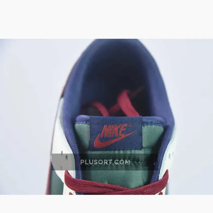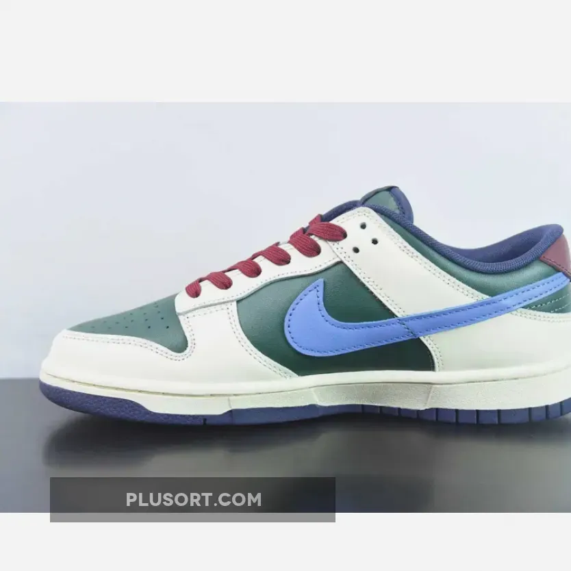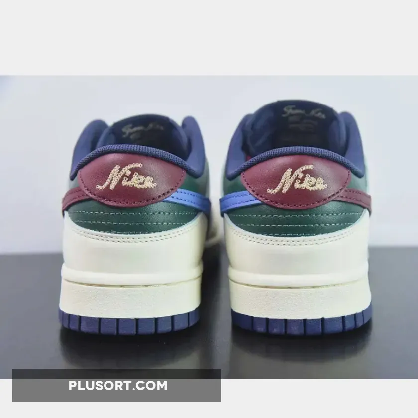 This Nike Dunk Low flaunts a lively blend of colors – Gorge Green, Team Red, Obsidian, Game Royal, and Coconut Milk. A dark green leather constructs the base with coconut milk leather overlays. Dark red accents include the Nike Swoosh and the laces, completing the Christmas color scheme. Noteworthy details like the “From Nike To You, Oregon USA” tongue tags, a Coconut Milk midsole, and an Obsidian rubber outsole round out the design.