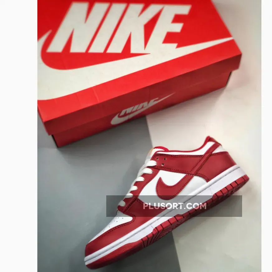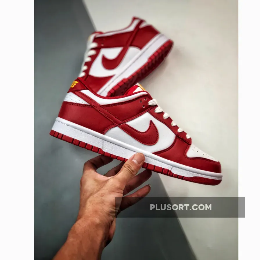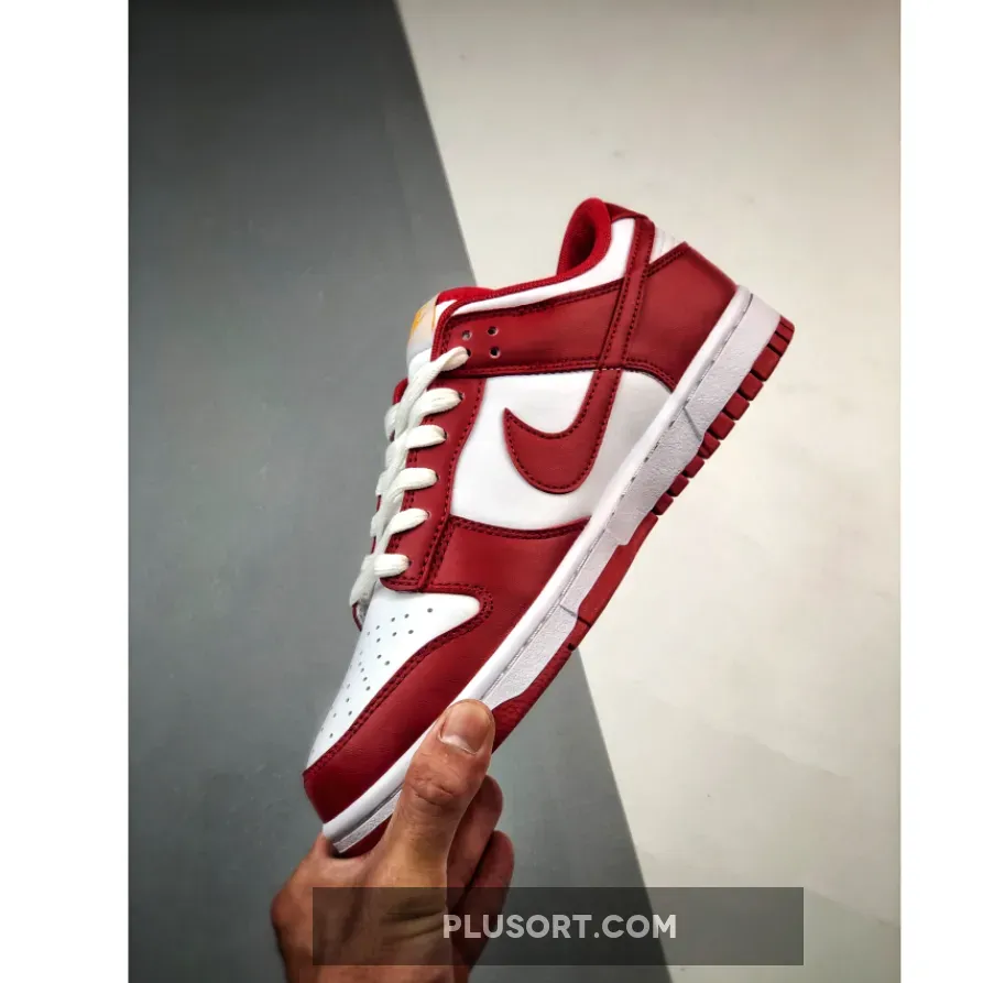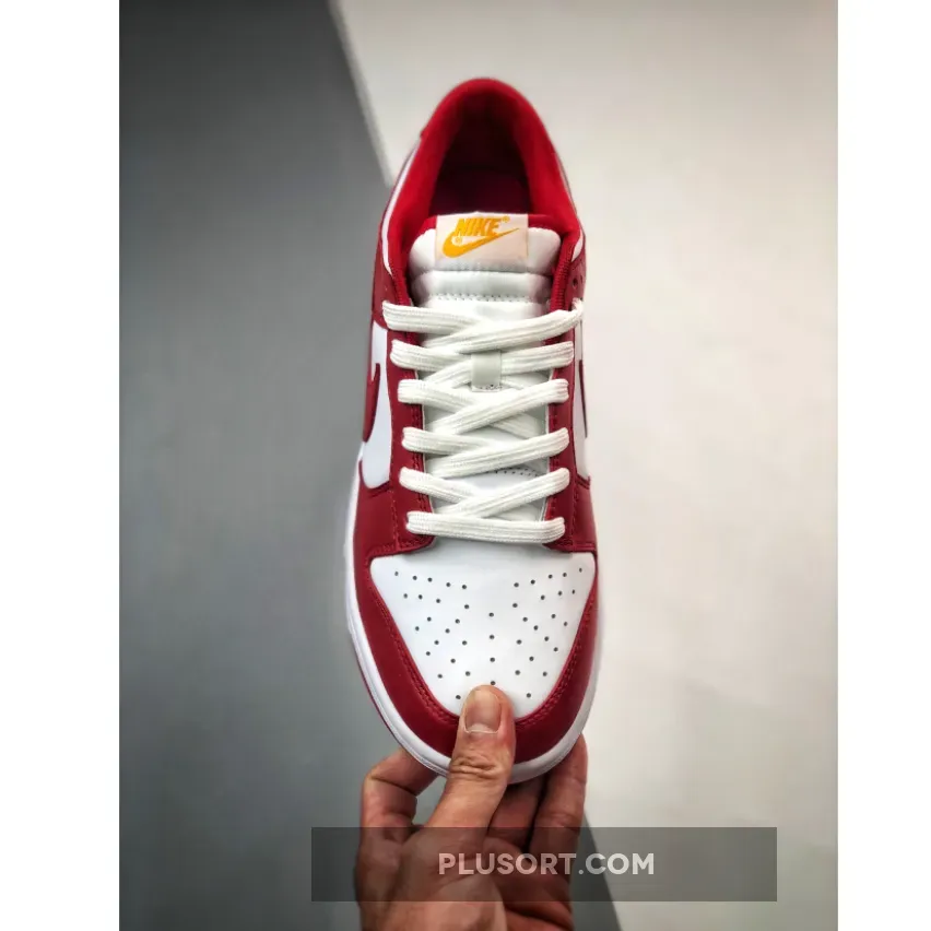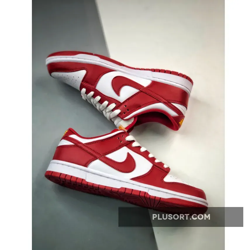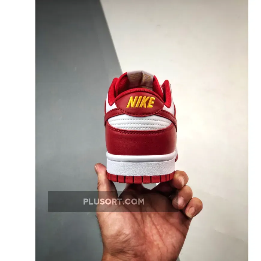 A cool for school pair, the Nike Dunk Low Gym Red pays homage to the University of Southern California by adopting its official colour palette. Similar to the original Dunk, this iteration showcases a classic colour blocking, with the smooth white leather base acting as the blank canvas for bright red leather overlays and Swooshes to take the vanguard. This shoe sports the class two-tone colour scheme of the Dunk Low, but this time the overlays and the profile Swooshes along the quarters are in a bold and dramatic Gym Red. The base is the blank canvas in smooth and perforated white leather. A pop of yellow adds another dimension of interest to this pair. The Nike branding on the white nylon tongue is golden yellow. This same yellow appears once again as the Nike branding on the all-red insole.