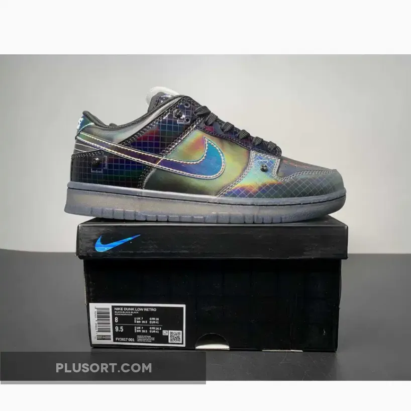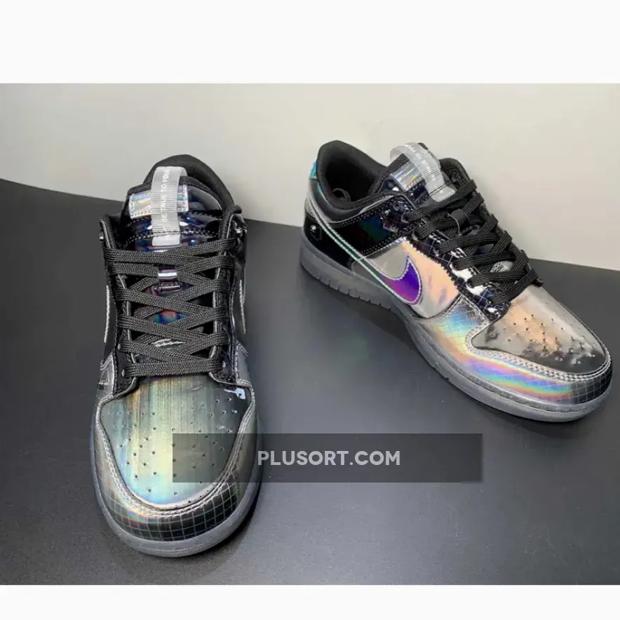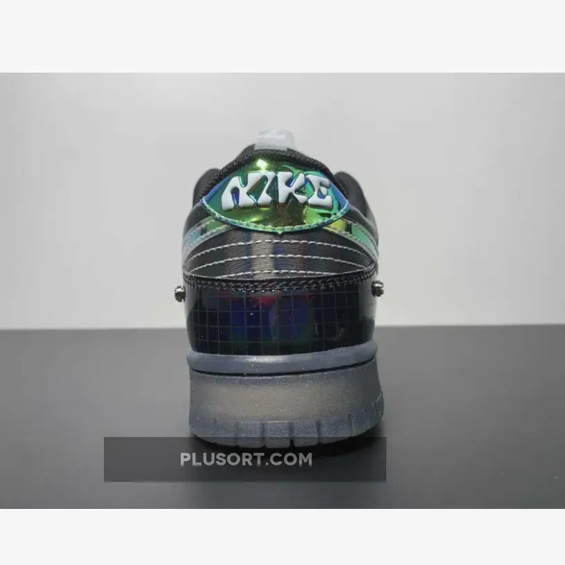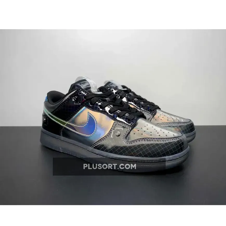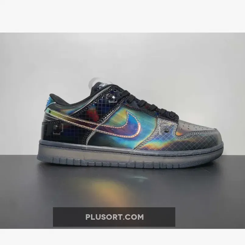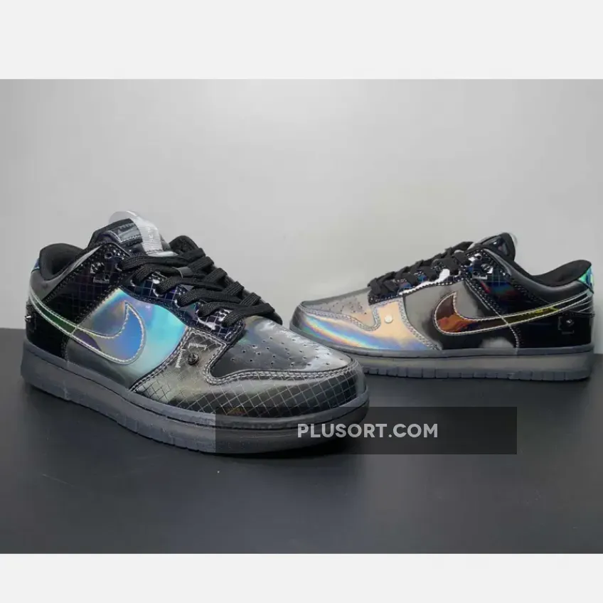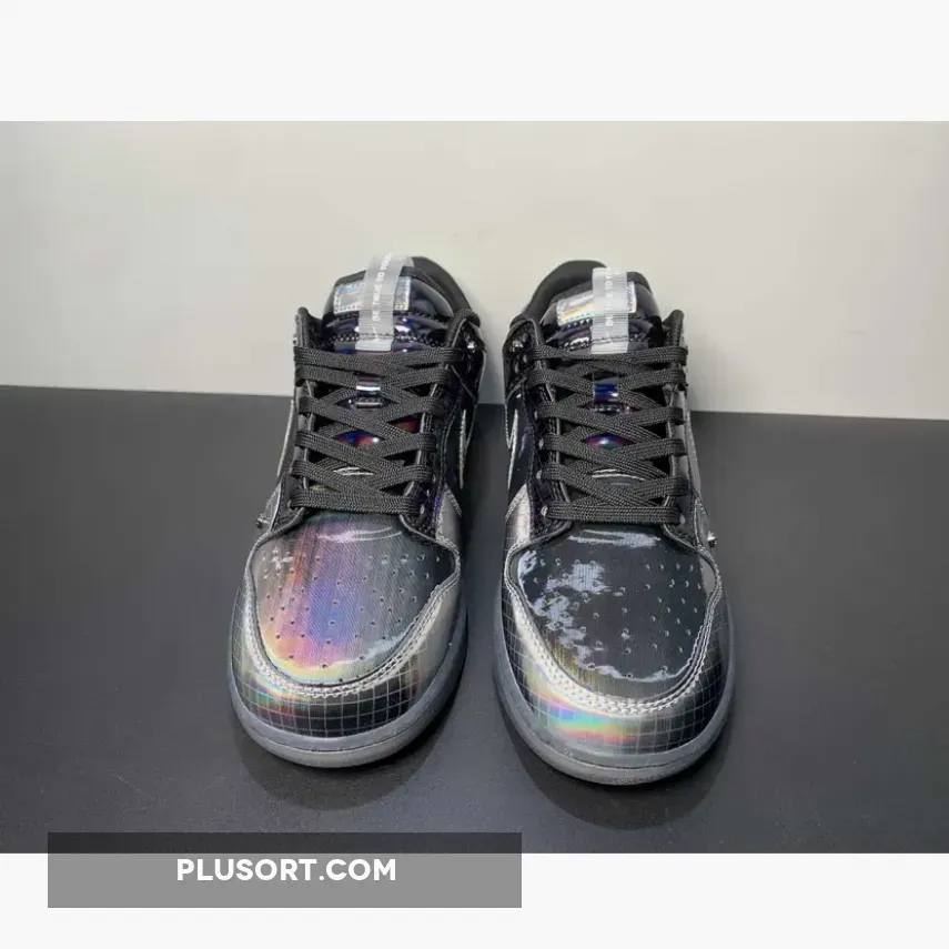 Nike is launching a second iteration of the Dunk Low “Hyperflat”, featuring darker, grey-scaled approach. The gridded pattern at the toe-guard captures that gun-metal hue, contrasted by the pitch black lace collar and heel — but off-set by a slightly oily finish. The Swoosh and heel tab, in particular, boast a reflective gloss that adds a touch of allure. The font choice blends nostalgia with a hint of retro-robotic aesthetics. Completing the overall look are the tongue pull-tabs, Phillips-head rivets, and a smoke-grey transparent outsole.