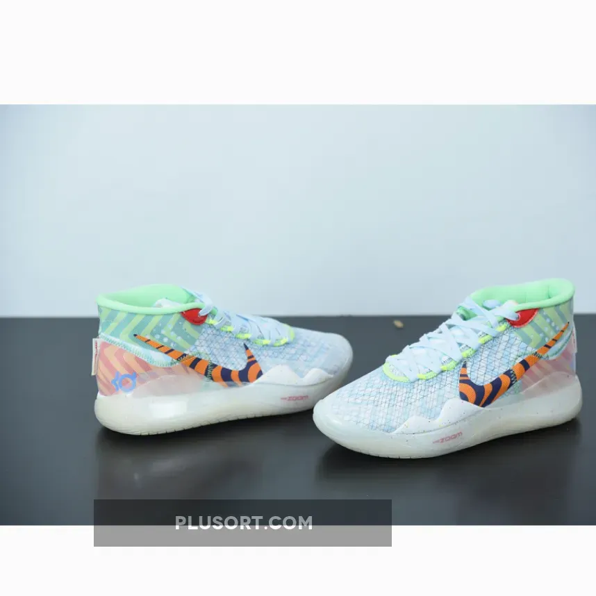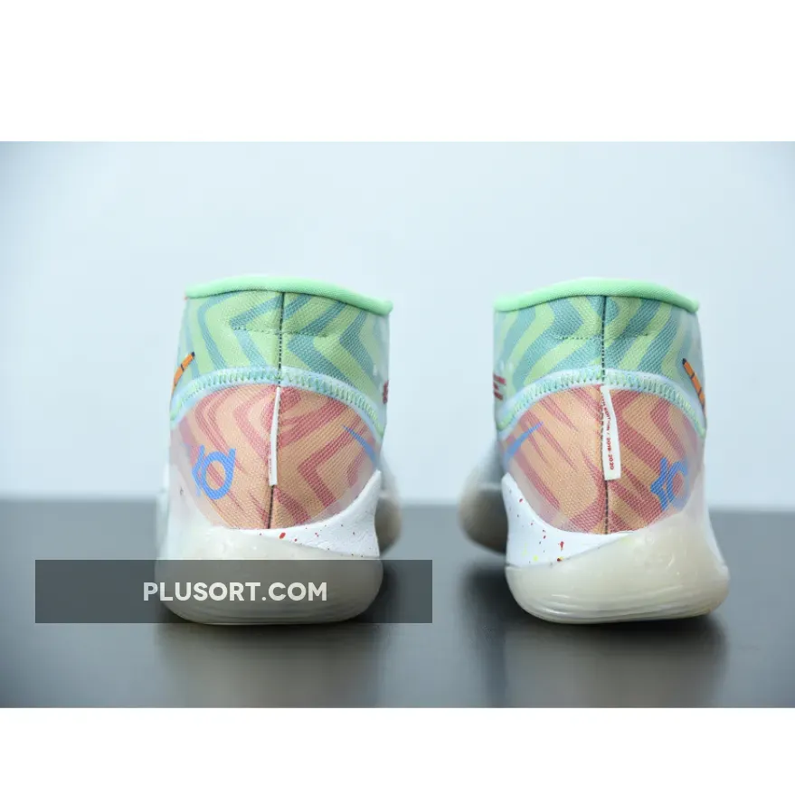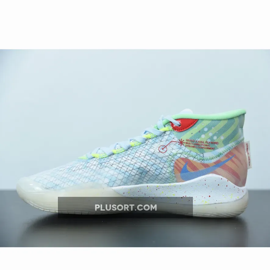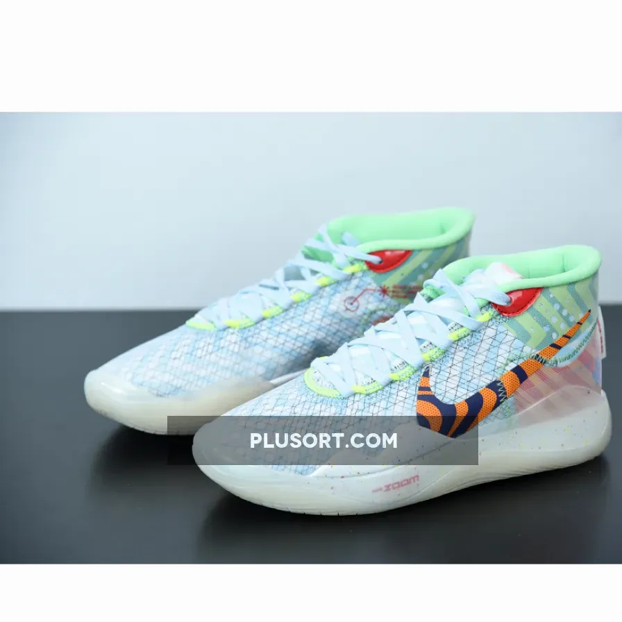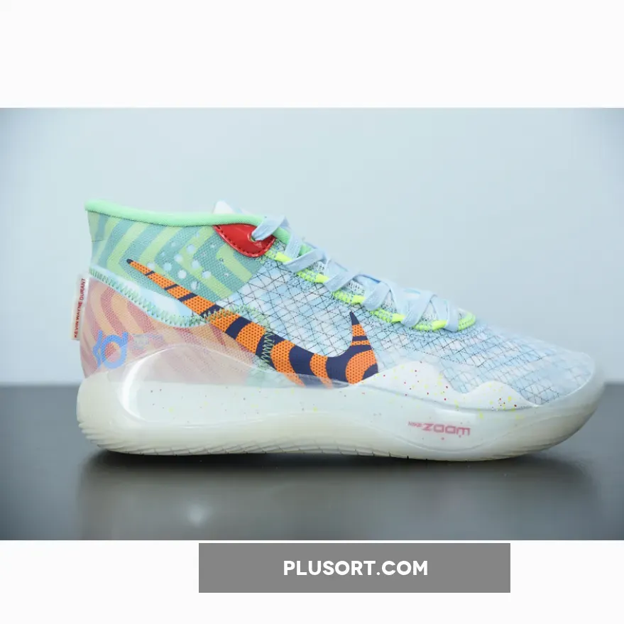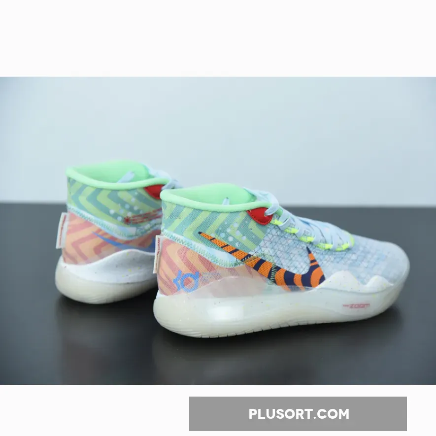 Dressed in a Teal Tint, Blue Gaze, and Red Orbit color scheme. This Nike KD 12 features bright colors and wavy prints inspired by fashion from the ’90s. Its completed with full-length cushioning that sits right below your foot and continually responds to your force.